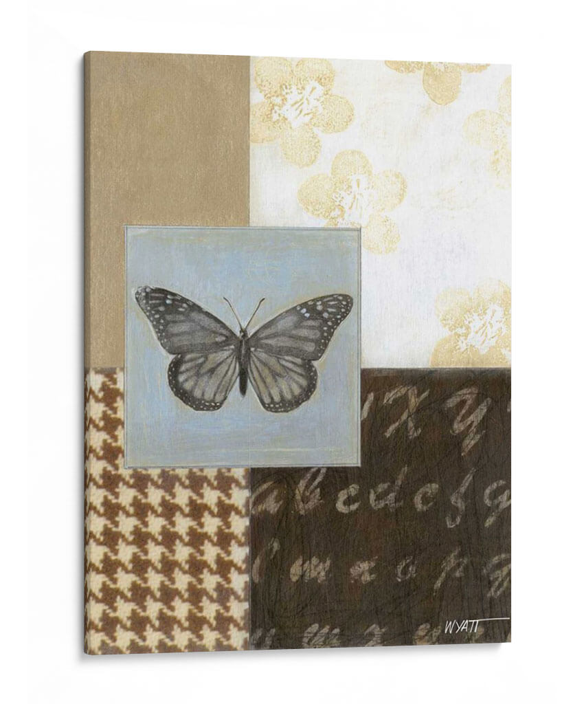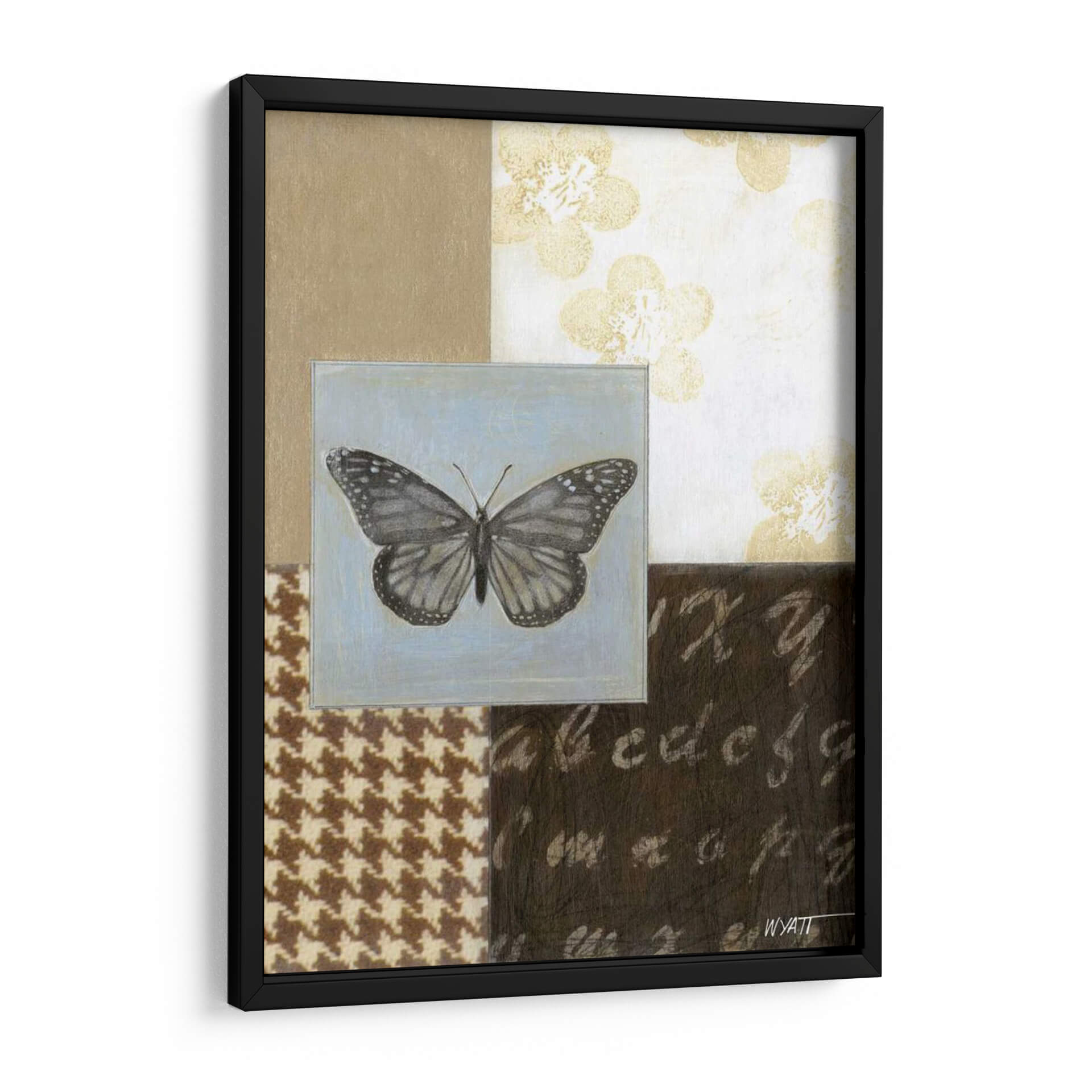 Este cautivador cuadro decorativo, titulado 'Chic Butterfly II' del artista Norman Wyatt Jr., ofrece una composición artística única que combina elementos texturizados y un enfoque delicado en la naturaleza. La obra presenta una mariposa en tonos grises y negros, elegantemente posada sobre un fondo azul claro, creando un punto focal de serenidad y belleza natural. Alrededor de esta imagen central, se despliega un tapiz visual de patrones: un cuadrado con un sutil diseño de pata de gallo en tonos marrones, un área texturizada en beige que evoca calma, y un fondo con un patrón floral etéreo en color dorado sobre blanco, que aporta un toque de sofisticación. La sección inferior derecha revela una textura oscura con letras manuscritas, añadiendo una capa de profundidad y misterio a la pieza. La paleta de colores, dominada por tonos tierra, beige, grises y toques dorados, crea una atmósfera acogedora y elegante, ideal para espacios que buscan un equilibrio entre lo moderno y lo atemporal. Este cuadro decorativo es perfecto para añadir un toque de distinción a cualquier sala de estar, dormitorio u oficina, invitando a la contemplación y admiración de la belleza efímera.