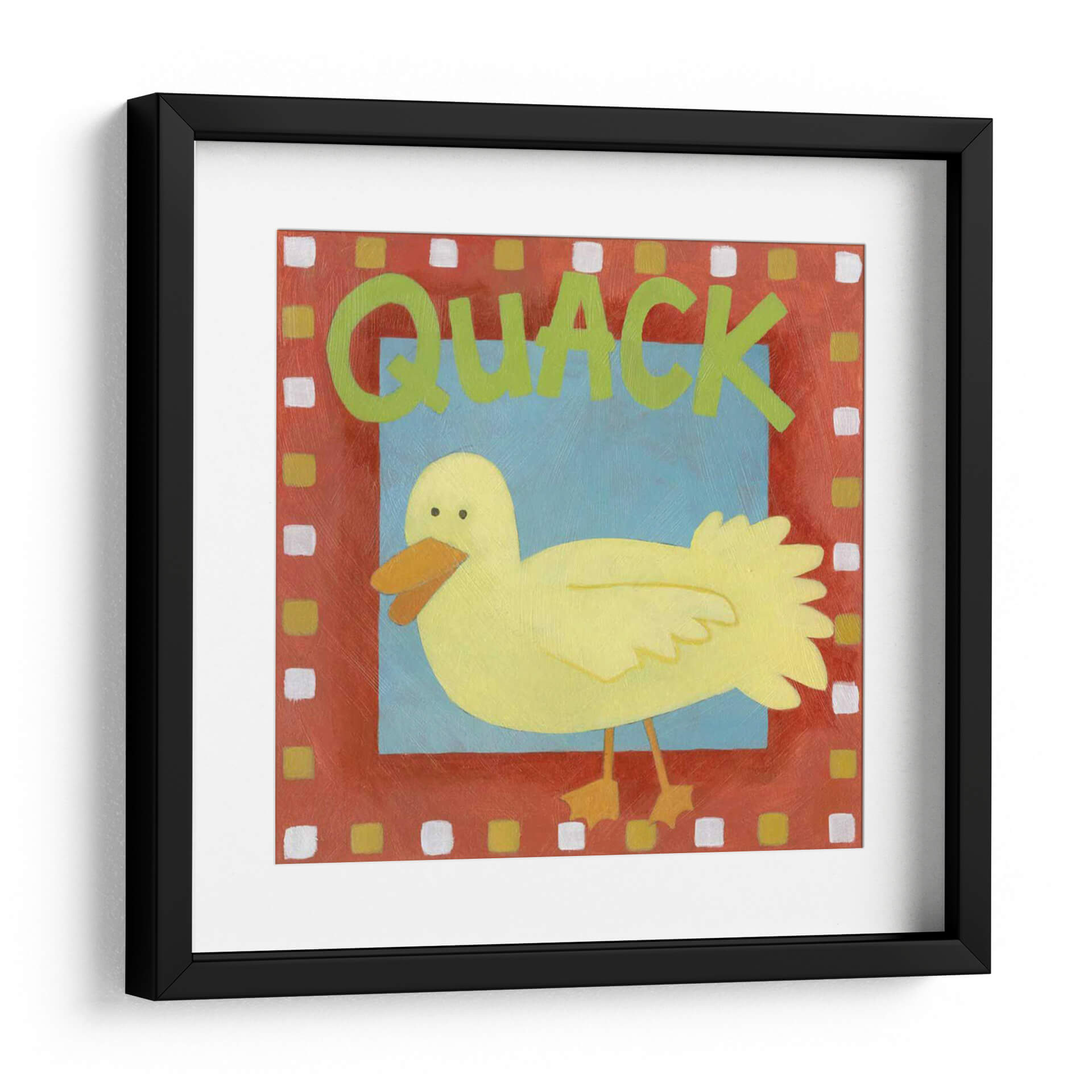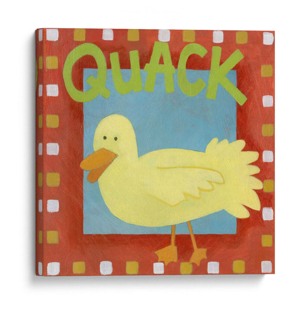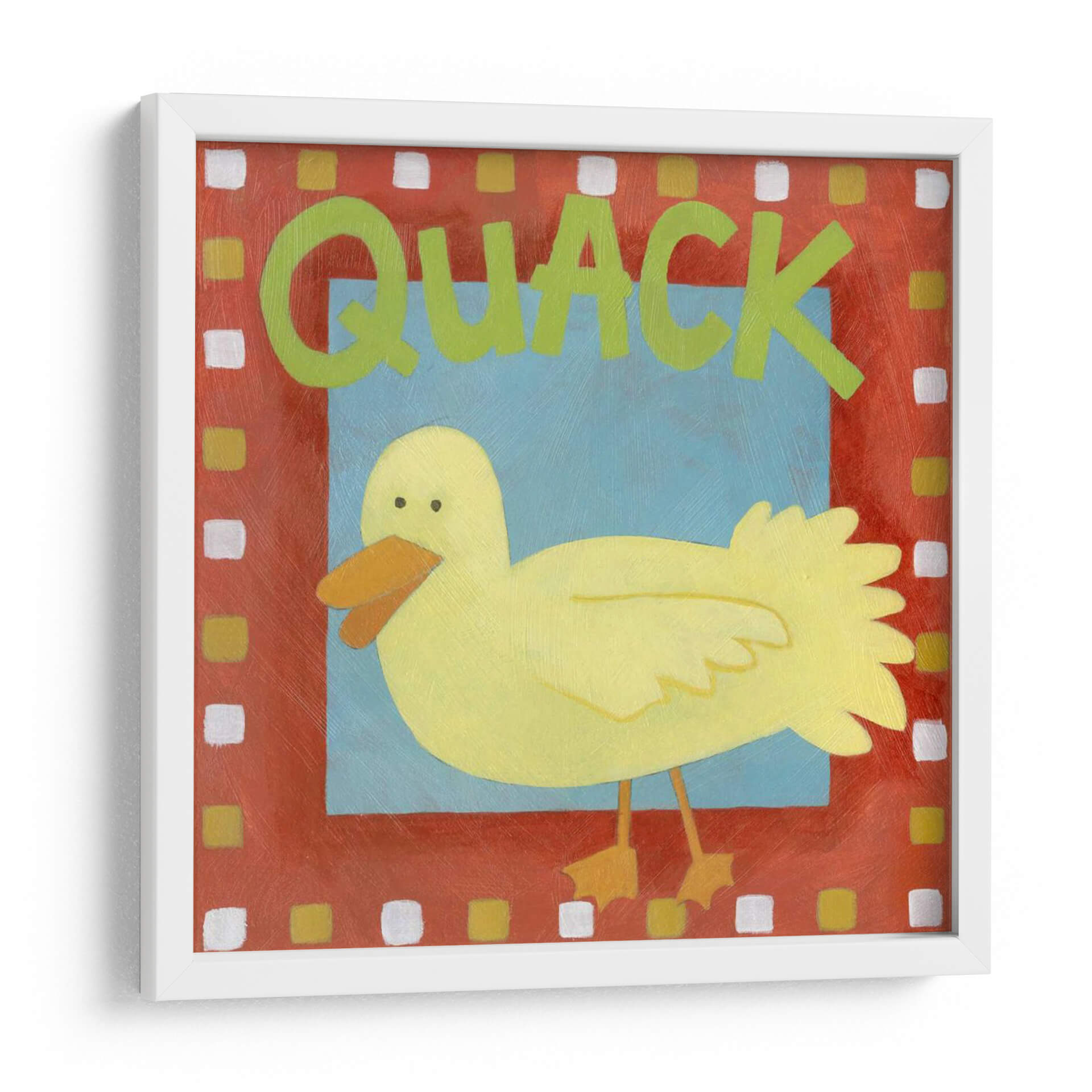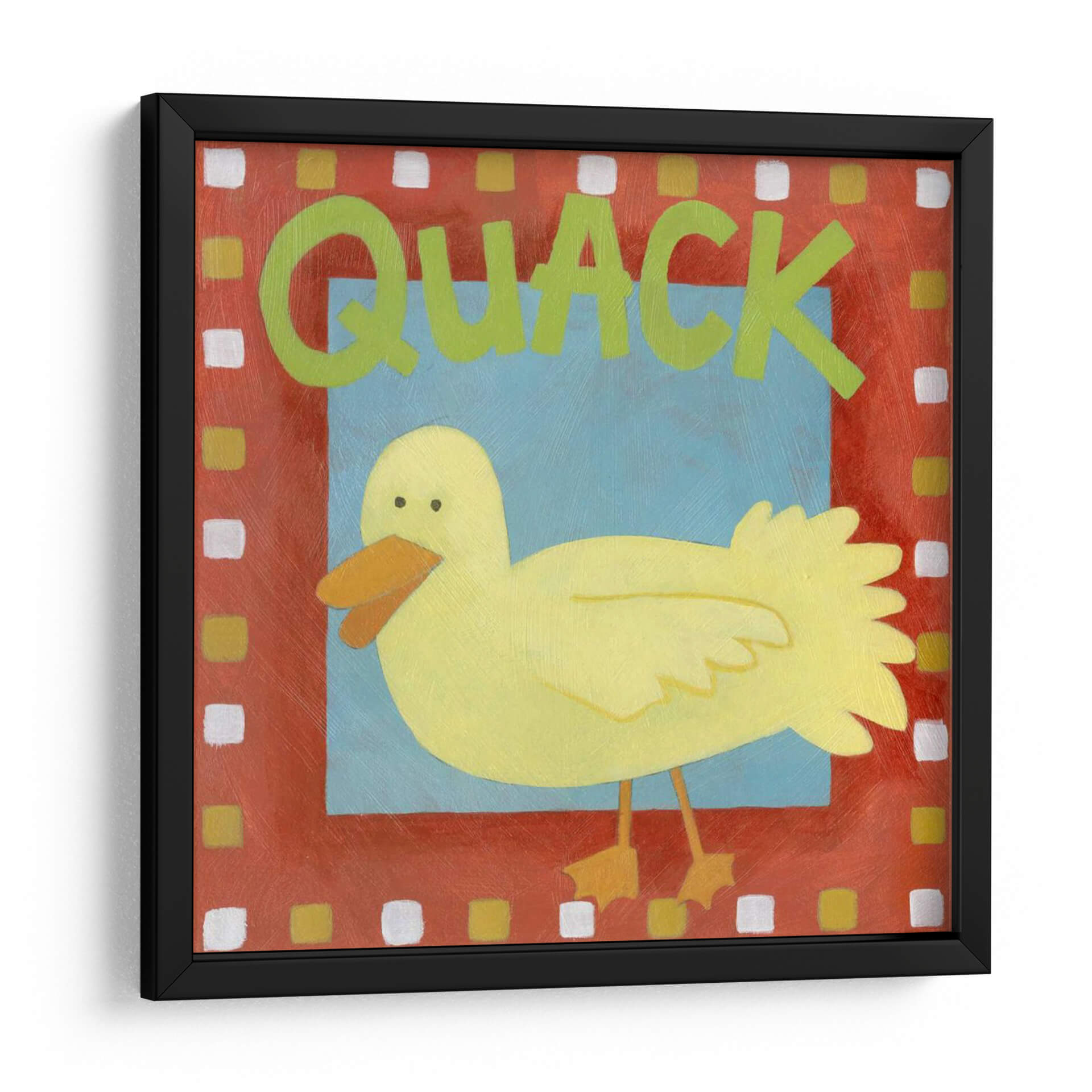 Aporta un toque de alegría y encanto infantil a tu hogar con este vibrante cuadro decorativo titulado 'Curandero', una obra de Megan Meagher. La pieza presenta un tierno pato amarillo con la palabra "QUACK" escrita en letras verdes brillantes sobre un fondo azul cielo. Un borde festivo de cuadros rojos y multicolores, con toques de blanco y dorado, enmarca esta escena juguetona. El estilo artístico, con pinceladas visibles y un aire casi primitivista, transmite una sensación de inocencia y diversión. Los colores primarios y brillantes crean una atmósfera optimista y enérgica, ideal para habitaciones infantiles, guarderías o cualquier espacio que busque un acento lúdico y lleno de vida. Este cuadro decorativo es perfecto para quienes buscan añadir personalidad y un toque de humor a la decoración de paredes, generando sonrisas y conversaciones. Su diseño simple pero efectivo lo convierte en una pieza versátil que complementa estilos decorativos modernos, eclécticos o temáticos. Transforma cualquier rincón en un espacio más acogedor y alegre con esta encantadora obra de arte.