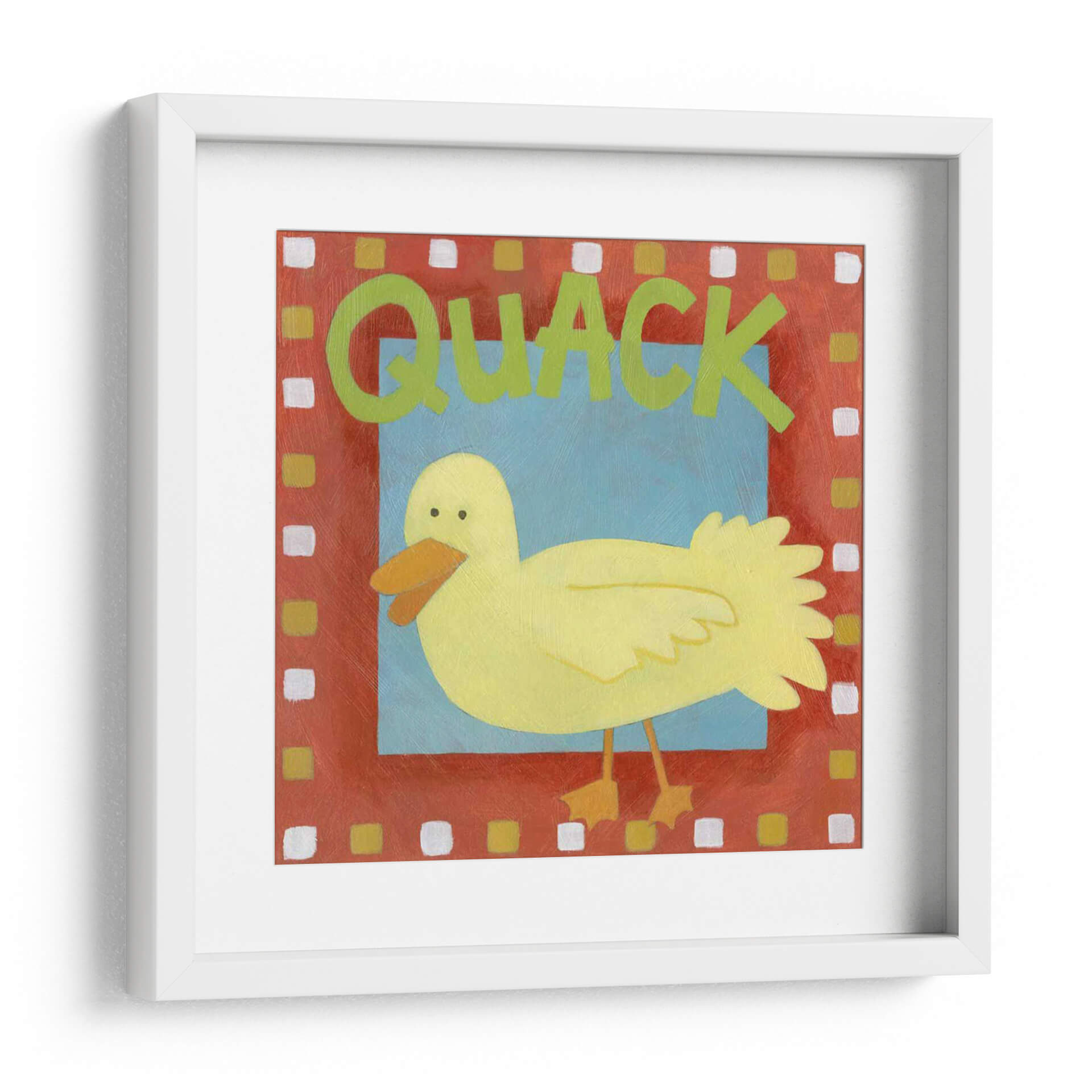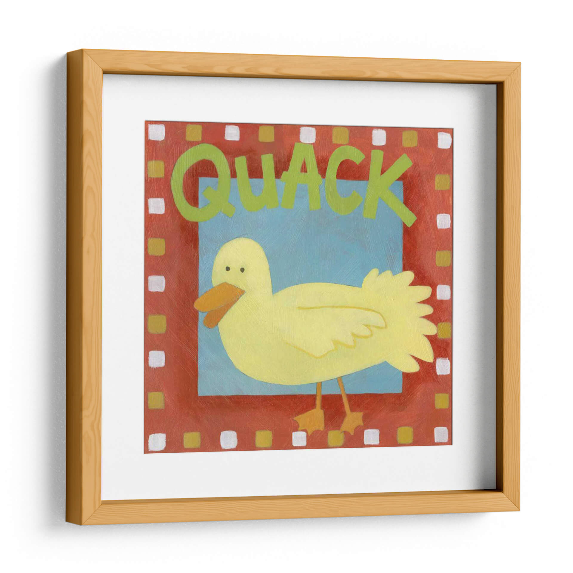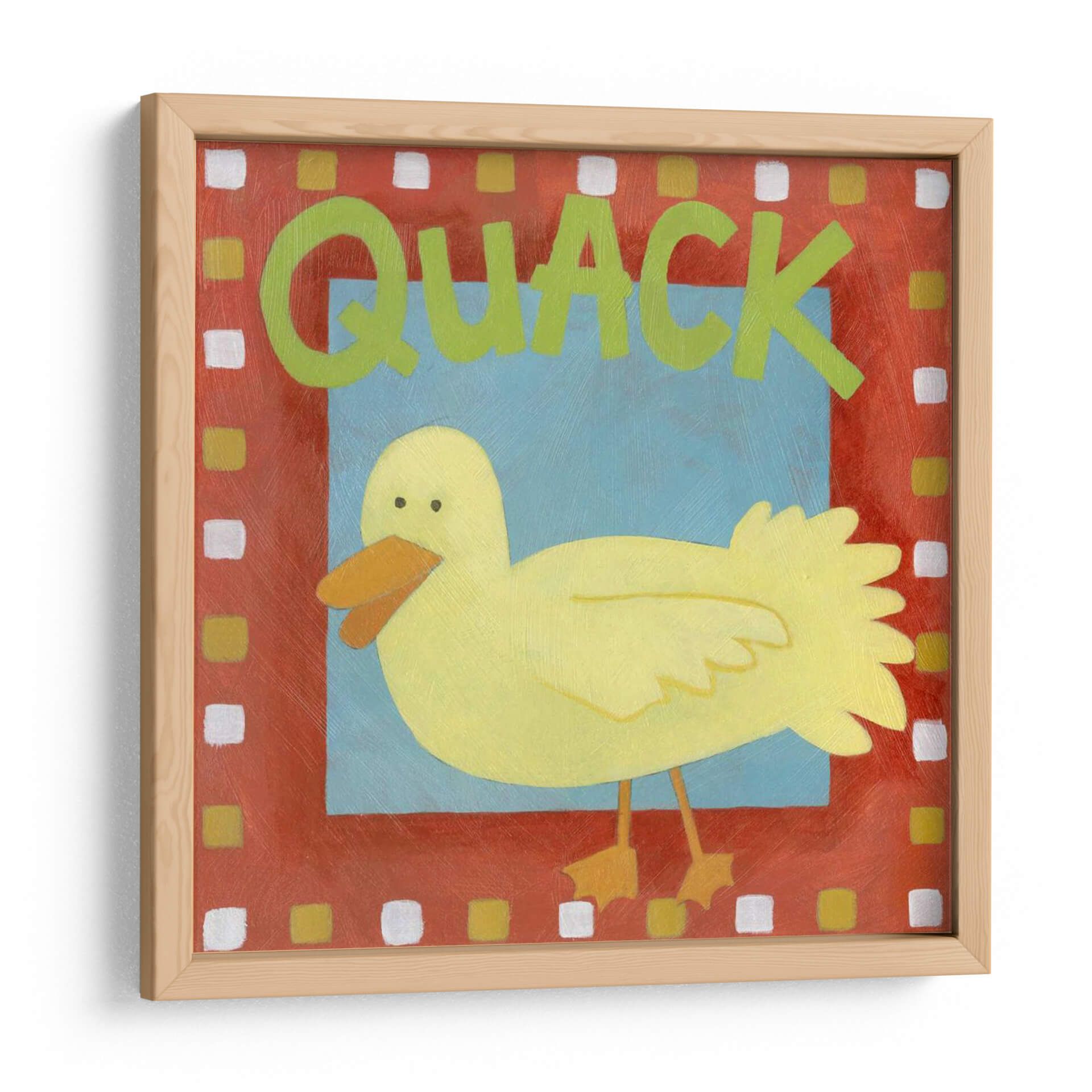 Aporta un toque de alegría y encanto infantil a tu hogar con este vibrante cuadro decorativo titulado 'Curandero', una obra de Megan Meagher. La pieza presenta un tierno pato amarillo con la palabra "QUACK" escrita en letras verdes brillantes sobre un fondo azul cielo. Un borde festivo de cuadros rojos y multicolores, con toques de blanco y dorado, enmarca esta escena juguetona. El estilo artístico, con pinceladas visibles y un aire casi primitivista, transmite una sensación de inocencia y diversión. Los colores primarios y brillantes crean una atmósfera optimista y enérgica, ideal para habitaciones infantiles, guarderías o cualquier espacio que busque un acento lúdico y lleno de vida. Este cuadro decorativo es perfecto para quienes buscan añadir personalidad y un toque de humor a la decoración de paredes, generando sonrisas y conversaciones. Su diseño simple pero efectivo lo convierte en una pieza versátil que complementa estilos decorativos modernos, eclécticos o temáticos. Transforma cualquier rincón en un espacio más acogedor y alegre con esta encantadora obra de arte.