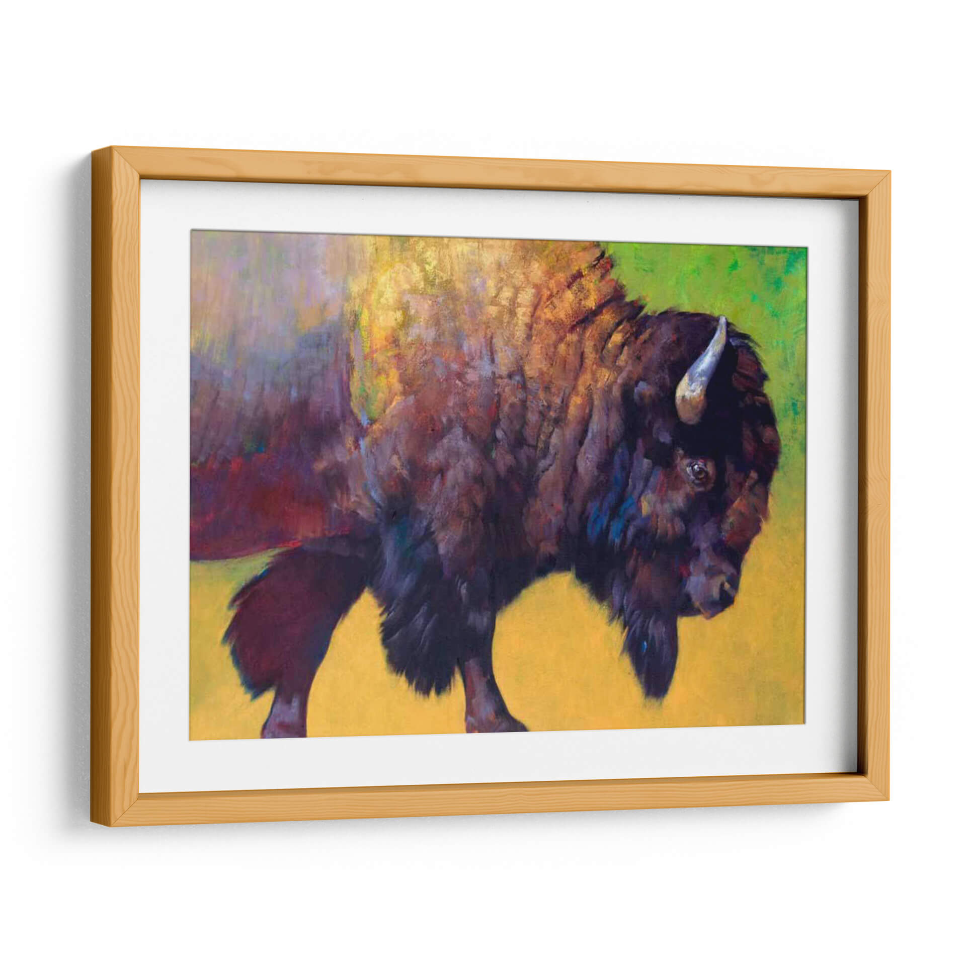 Sumérgete en la majestuosidad de la naturaleza con este cautivador cuadro decorativo de un bisonte, una obra de arte que evoca fuerza y conexión con la vida salvaje. La artista Julie T. Chapman captura la esencia de este imponente animal a través de pinceladas audaces y una paleta de colores vibrantes que fusionan tonos tierra profundos con explosiones de amarillo y verde. La composición se centra en la poderosa presencia del bisonte, con un tratamiento pictórico que sugiere movimiento y vitalidad, haciendo que la obra parezca casi tridimensional. Los detalles sutiles en el pelaje y la mirada penetrante invitan a la contemplación, creando una atmósfera de respeto y admiración por la naturaleza indómita. Este cuadro decorativo es ideal para quienes buscan infundir carácter y energía en sus espacios, ya sea en una sala de estar moderna, un estudio rústico o una oficina que aspire a la grandeza. Su estilo expresionista y el uso del color lo convierten en una pieza de conversación que transformará cualquier pared en un testimonio de la belleza salvaje.