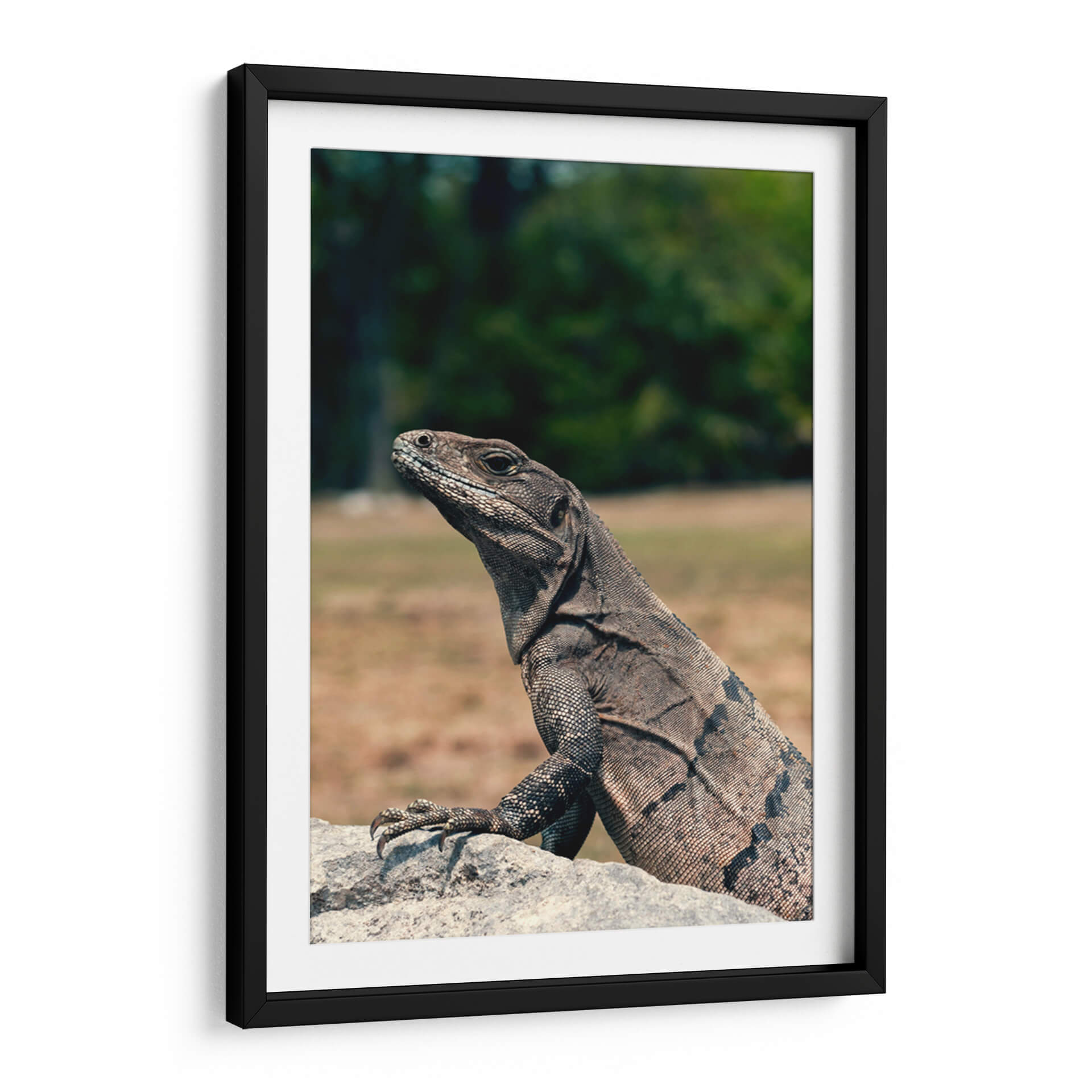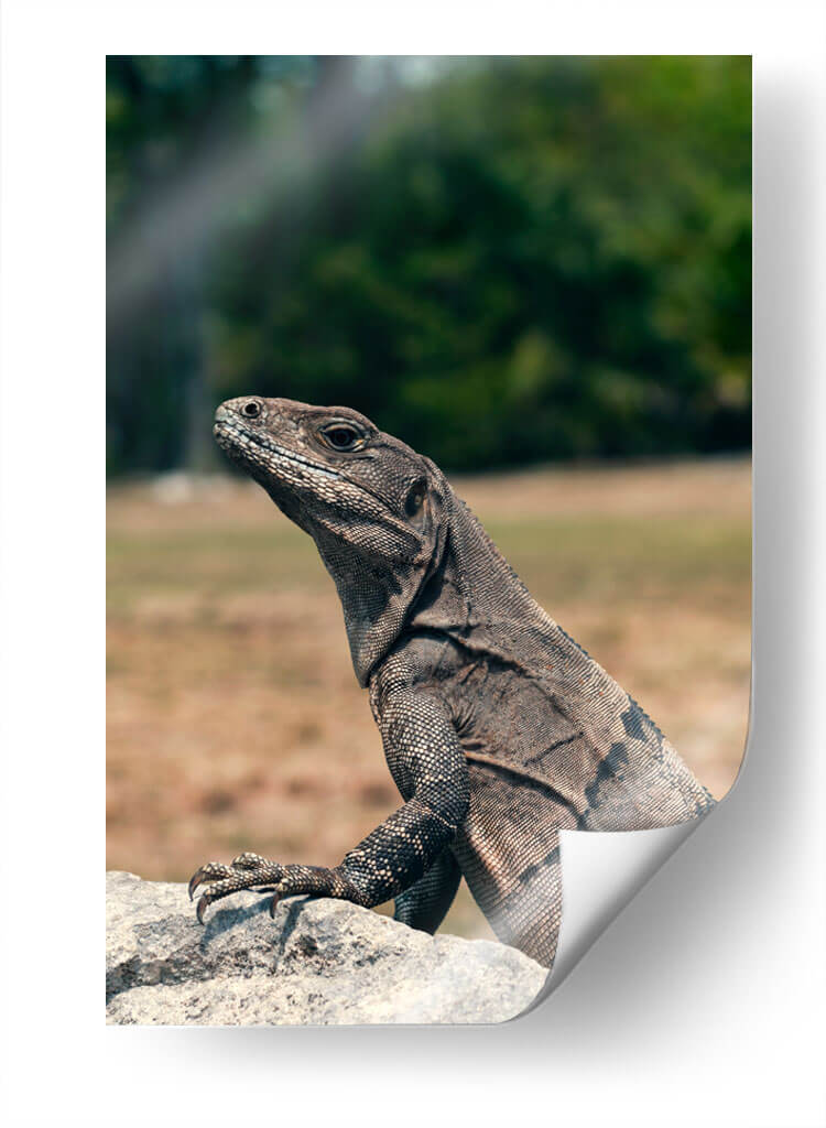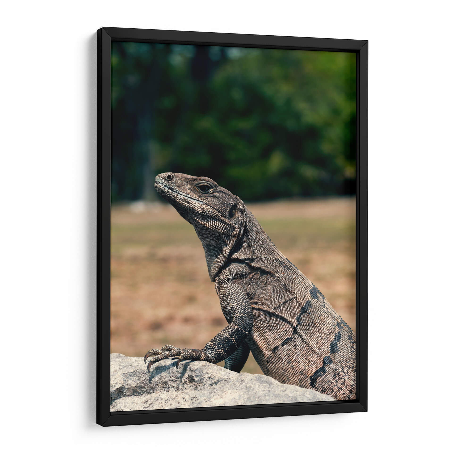 Captura la esencia de la naturaleza salvaje con este impresionante cuadro decorativo 'El Curioso'. La obra presenta un primer plano detallado de una iguana, posada majestuosamente sobre una roca, con su mirada penetrante dirigida hacia el horizonte. Los tonos tierra y verdes profundos del fondo contrastan sutilmente con las escamas intrincadas y la textura de la piel del reptil, creando una atmósfera de misterio y conexión con el mundo natural. Este cuadro es una pieza de arte contemporáneo que evoca una sensación de calma y contemplación, perfecta para añadir un toque de sofisticación orgánica a cualquier espacio. Su realismo fotográfico y la composición enfocada en la mirada del animal lo convierten en un punto focal intrigante para salas de estar, estudios u oficinas, invitando a la reflexión sobre la vida silvestre y la belleza del mundo natural. Ideal para amantes de la naturaleza, la fauna exótica o aquellos que buscan una decoración de pared única y llena de carácter.