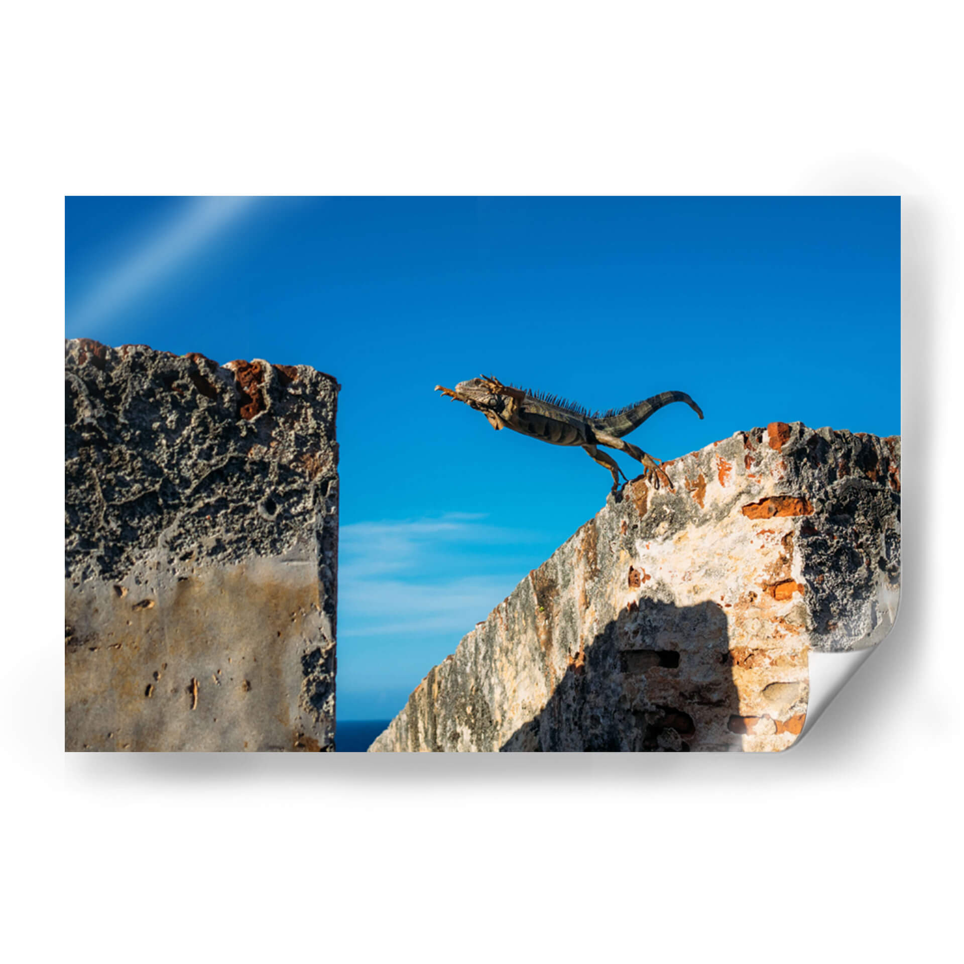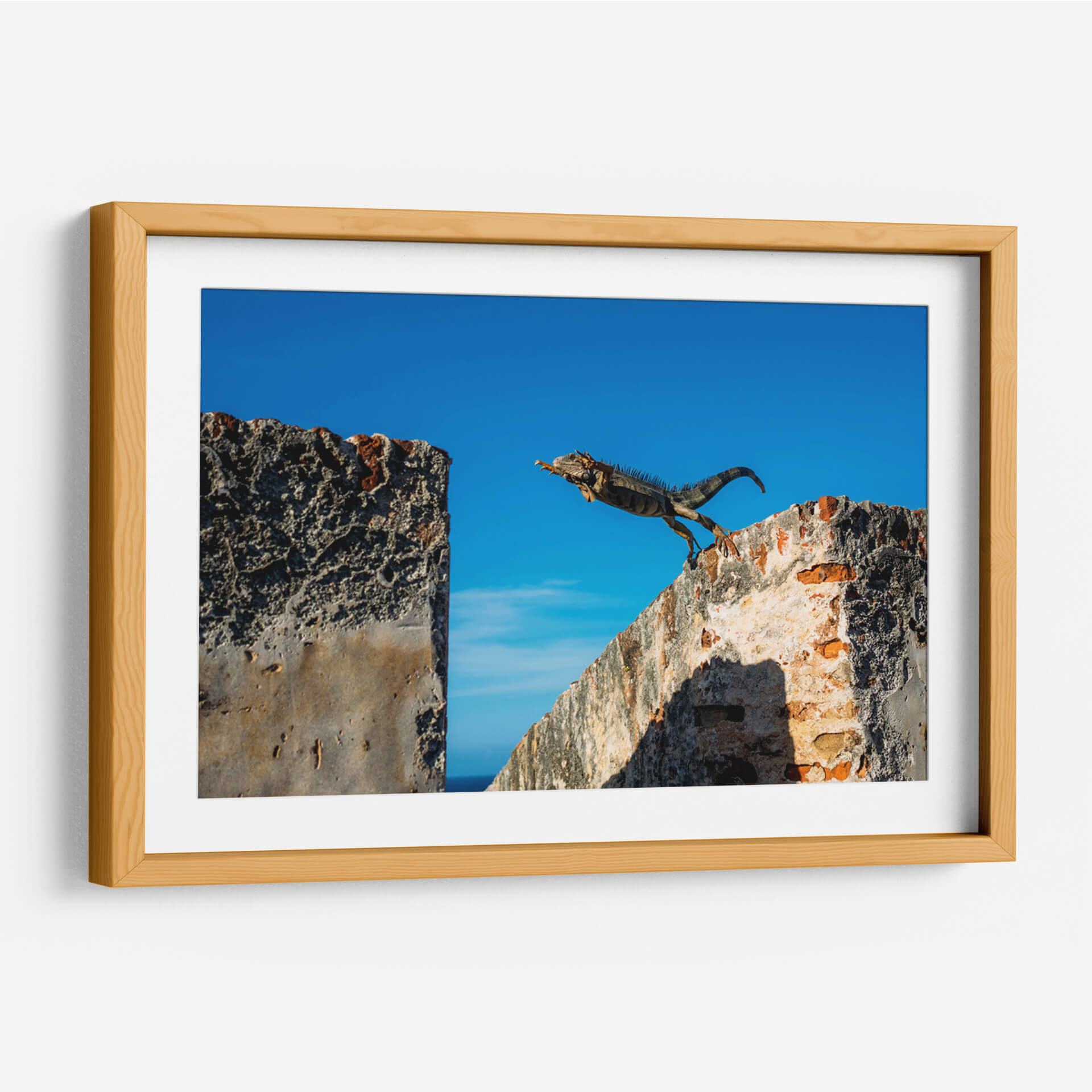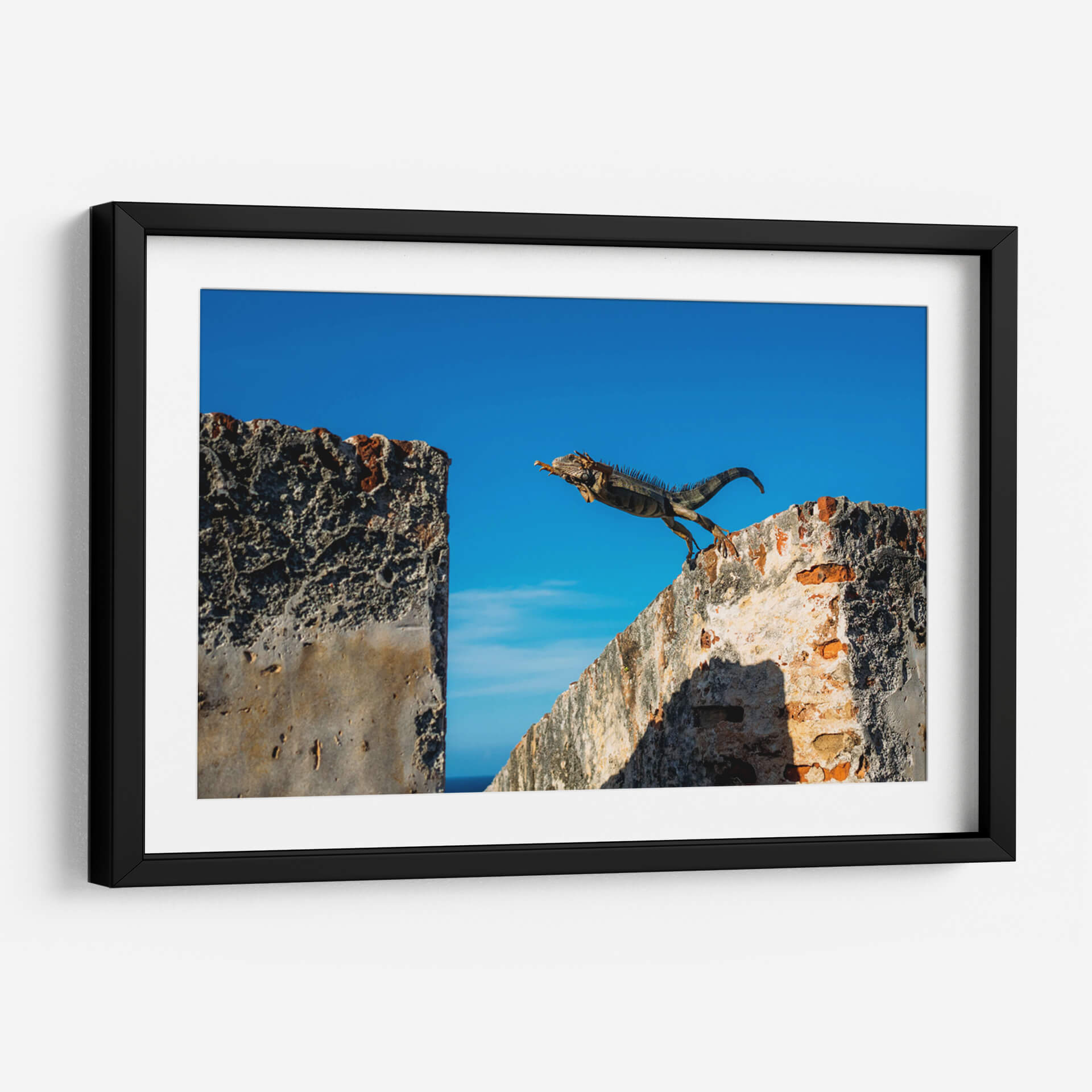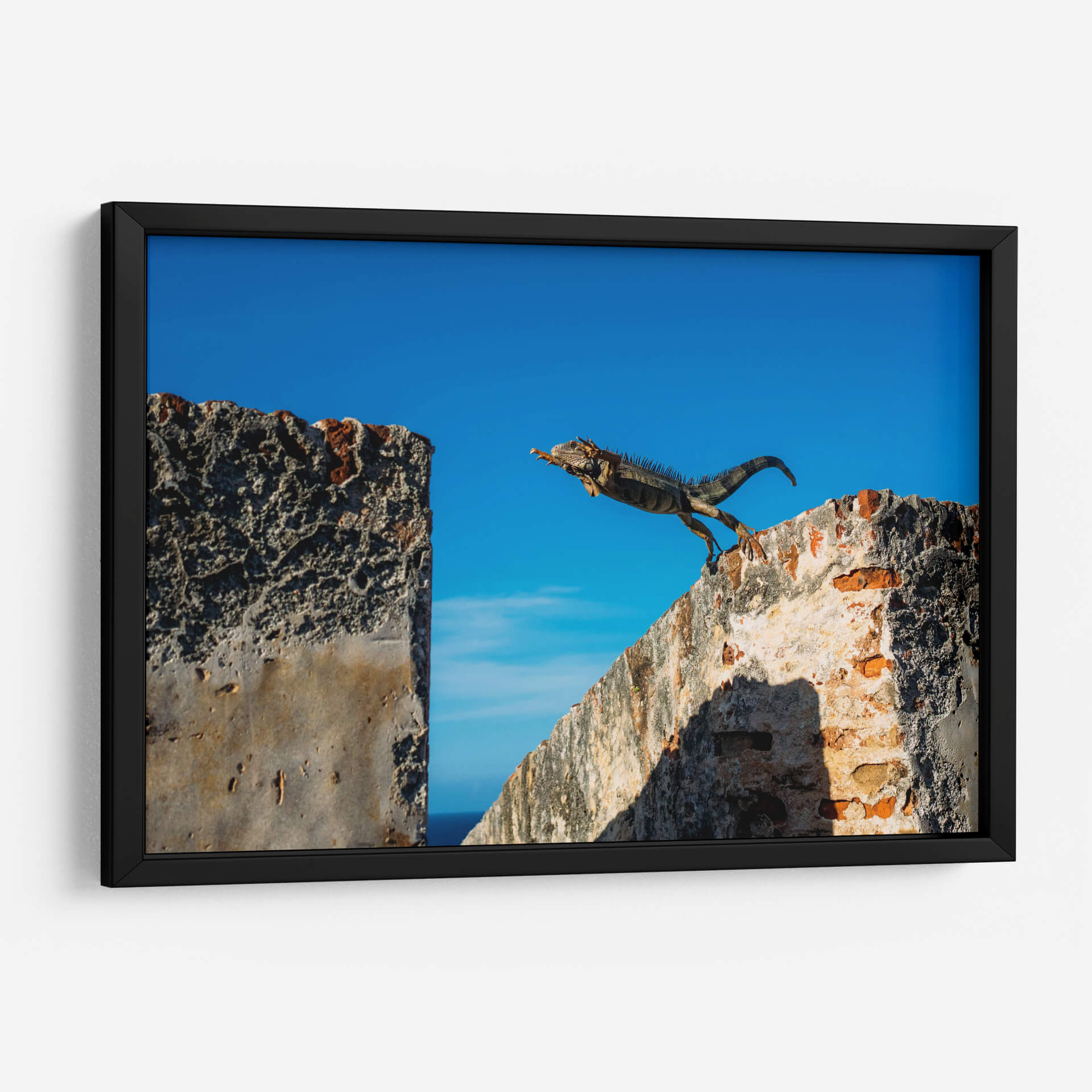 Captura la audacia y la naturaleza en movimiento con "El Salto de la Iguana", un cuadro decorativo que inmortaliza un momento de pura adrenalina. La obra presenta una iguana en pleno vuelo, saltando entre dos estructuras de piedra con una textura desgastada que evoca historia y fortaleza. El vibrante cielo azul profundo y la sutil presencia del mar al fondo contrastan maravillosamente con los tonos ocres, grises y rojizos de los muros de ladrillo y concreto. La composición dinámica, con la iguana capturada en su punto álgido de movimiento, crea una sensación de energía y libertad. Este cuadro decorativo es perfecto para añadir un toque de intriga y carácter a cualquier espacio, ya sea una sala de estar moderna, un despacho con personalidad o un rincón que necesite una chispa de vida. Ideal para amantes de la fauna, la fotografía de naturaleza y aquellos que buscan piezas de arte únicas que inspiren valentía y aventura. Los detalles de la textura de las ruinas y la escama de la iguana están representados con una claridad asombrosa, haciendo que esta pieza sea un verdadero punto focal. Transforma tus paredes con la fuerza y la belleza de este instante congelado en el tiempo.