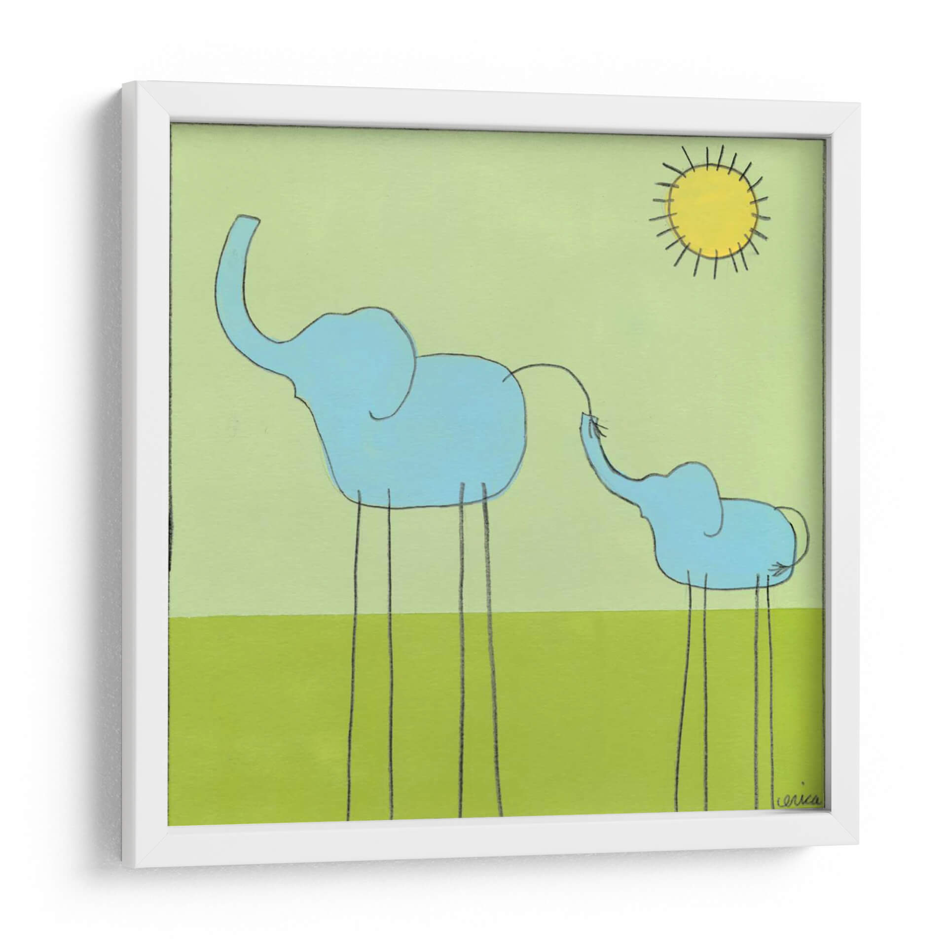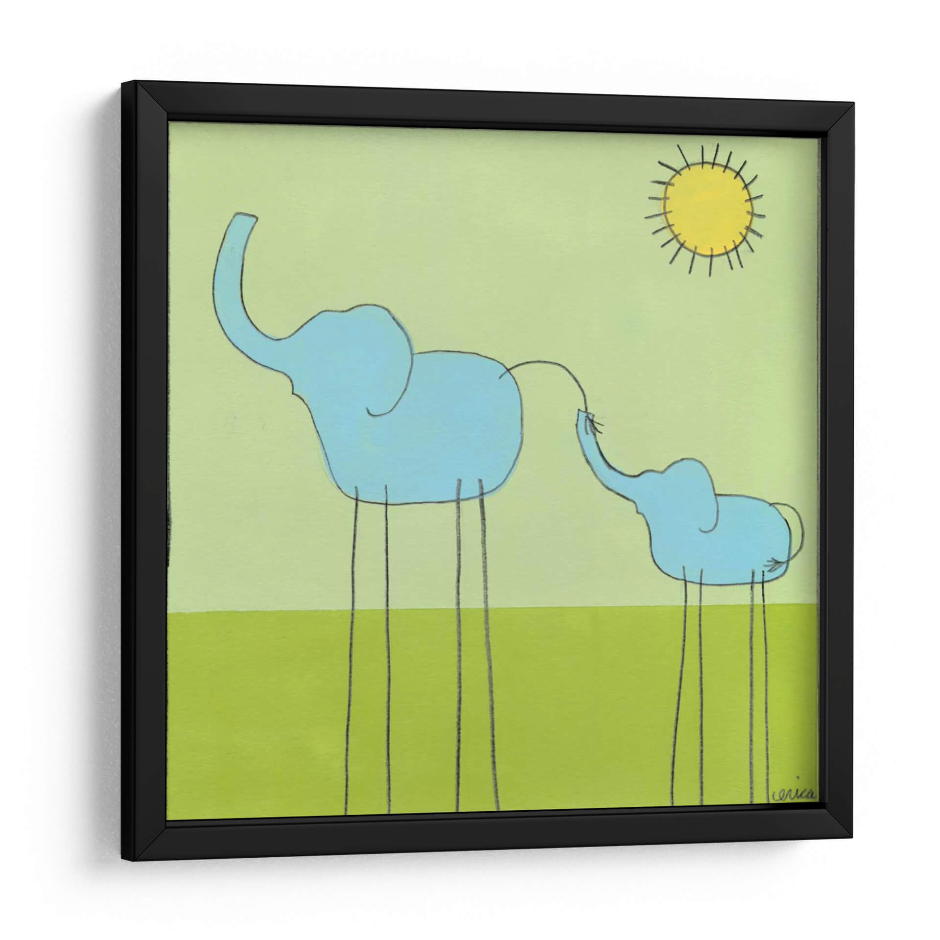 Captura la inocencia y la ternura con este encantador cuadro decorativo que presenta dos elefantes azules estilizados. La obra, titulada 'Elefante De La Pierna De Palo Ii' del artista June Erica Vess, evoca una sensación de juego y conexión familiar. Los elefantes, con sus siluetas simples y líneas limpias, se alzan sobre patas delgadas, añadiendo un toque de fantasía y originalidad a la composición. El fondo se divide en dos tonos de verde, uno más pálido en la parte superior donde un sol radiante y juguetón ilumina la escena, y otro más vibrante en la base, simulando un prado. Esta paleta de colores pastel y terrosos crea una atmósfera serena y alegre, perfecta para cualquier espacio que necesite un toque de calidez y personalidad. El estilo minimalista y el trazo casi infantil transmiten una simplicidad que invita a la reflexión y a la sonrisa. Ideal para decorar habitaciones infantiles, estudios o salones que busquen un aire desenfadado y artístico. Este cuadro es una pieza única que habla de momentos sencillos y lazos afectivos, aportando un punto de dulzura y arte contemporáneo a tu hogar. Su diseño versátil se adapta a diversos estilos decorativos, desde el moderno hasta el escandinavo o bohemio, convirtiéndose en un foco de atención y conversación.