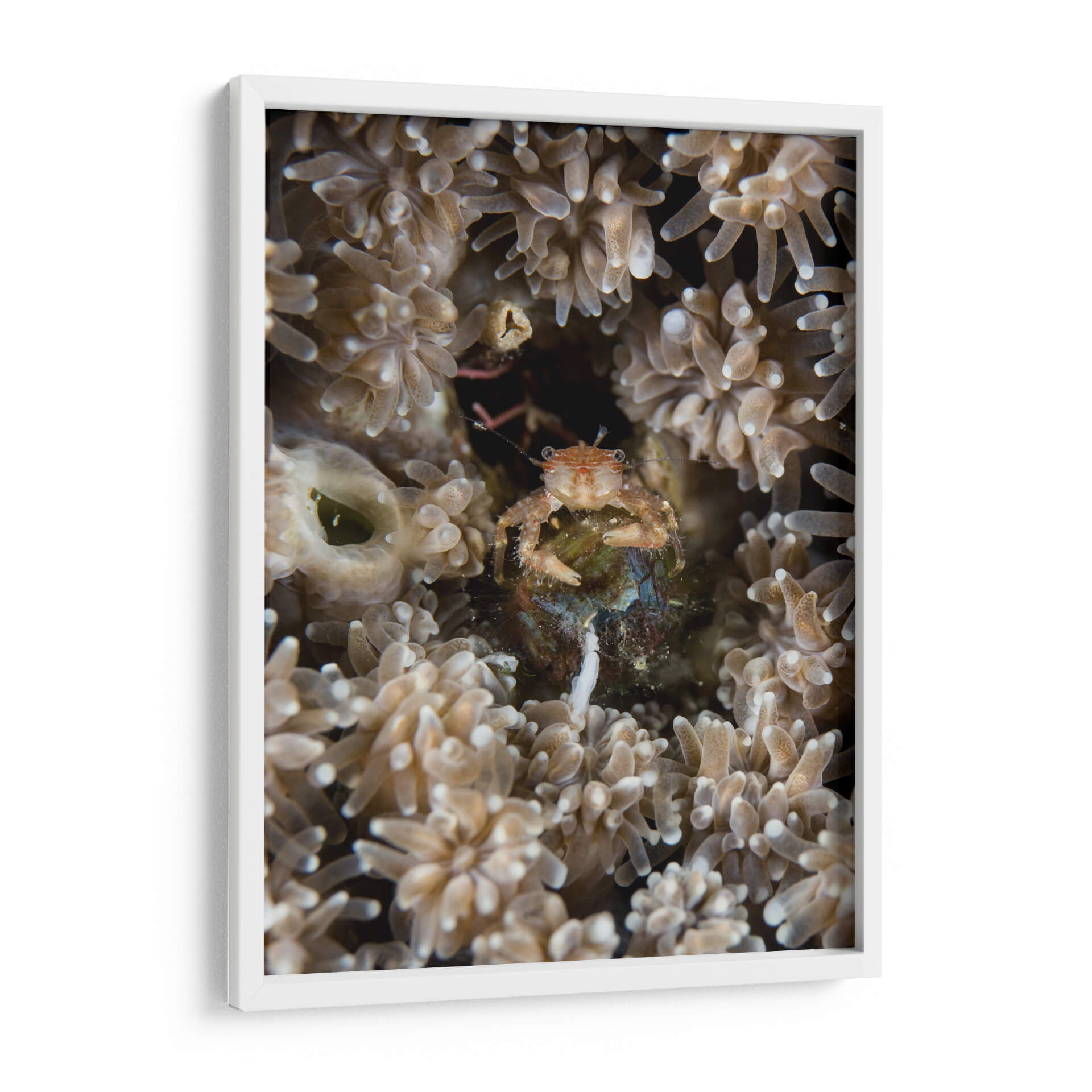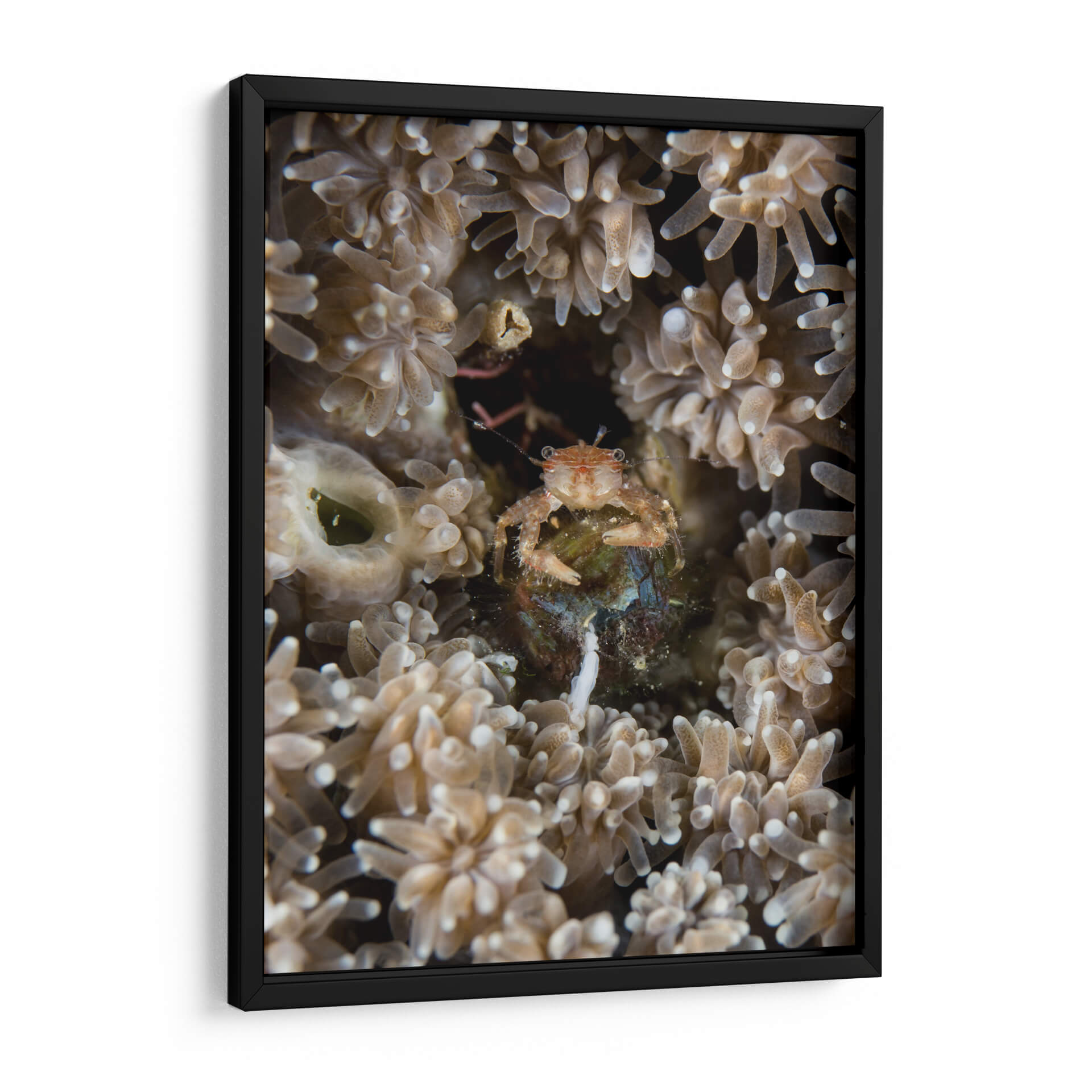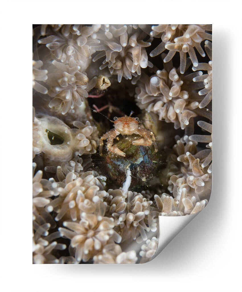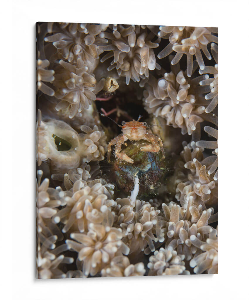 Sumérgete en las profundidades marinas con "Escondite", un cuadro decorativo que captura la fascinante vida subacuática. Esta obra maestra visual te transporta a un mundo de texturas delicadas y colores terrosos, donde un pequeño cangrejo se resguarda entre corales y anémonas. La composición íntima y el enfoque detallado invitan a la contemplación, revelando la belleza oculta en los pequeños detalles del océano. Ideal para añadir un toque de misterio y naturaleza a tu hogar u oficina, este cuadro evoca una sensación de calma y asombro ante la complejidad del ecosistema marino. Su paleta de tonos suaves y naturales se integra armoniosamente en cualquier decoración, desde la más rústica hasta la más moderna, creando un punto focal sereno y cautivador. "Escondite" no es solo una pieza de arte, sino una ventana a un universo silencioso y vibrante, perfecto para inspirar tranquilidad y curiosidad en tu espacio.