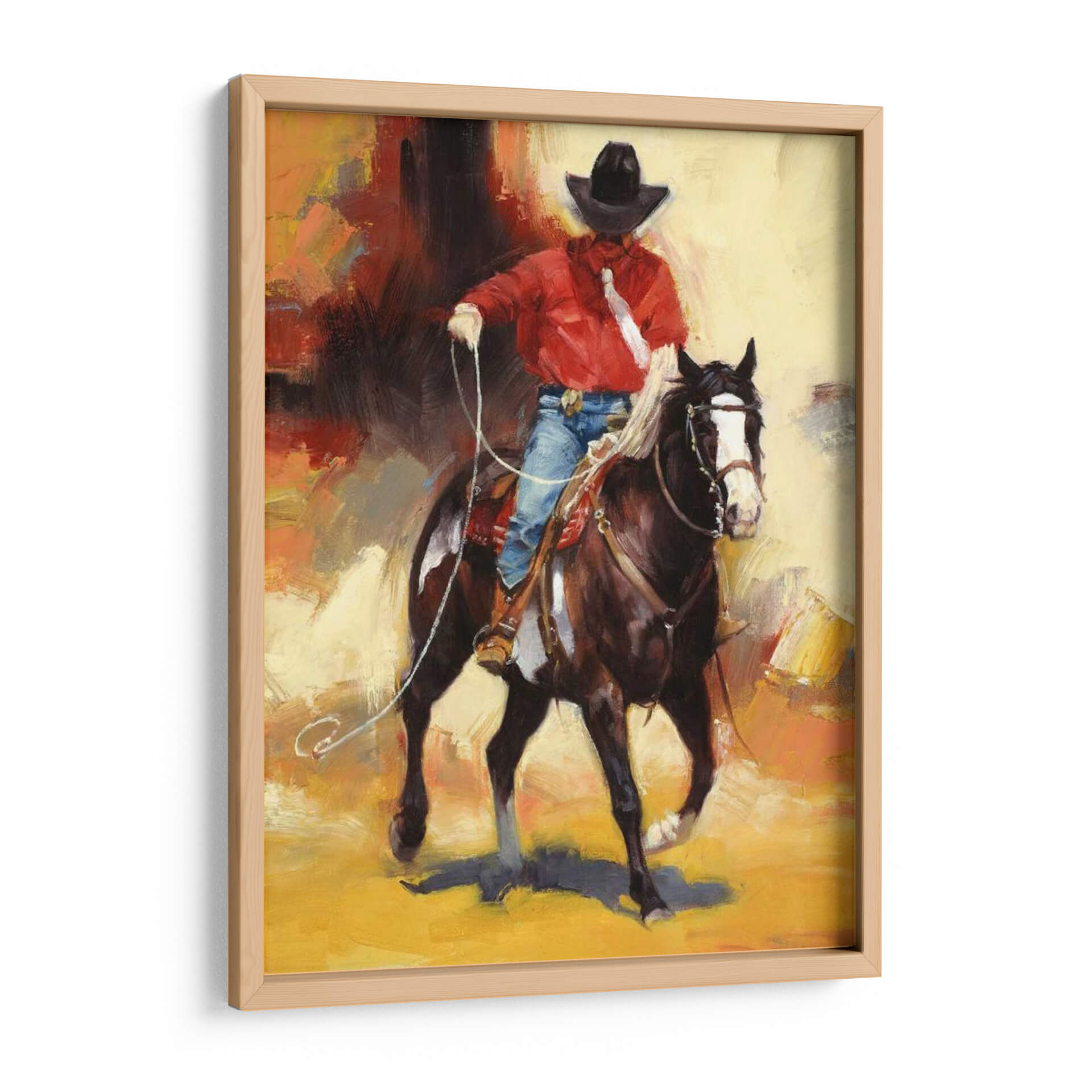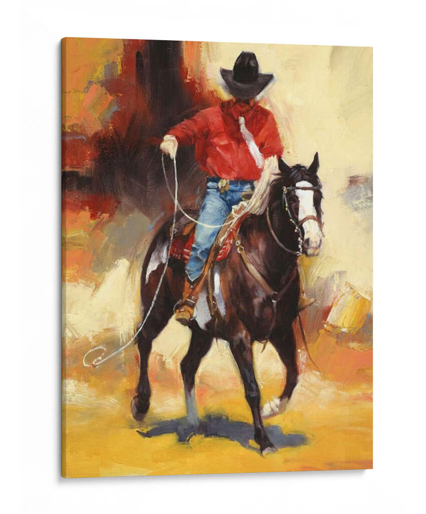 Sumérgete en la dinámica y apasionante escena del oeste americano con "Estilo Rodeo", una obra de arte cautivadora de Julie T. Chapman. Este cuadro decorativo captura la esencia de un jinete experto en plena acción, con su caballo en movimiento y el lazo listo para ser lanzado. La paleta de colores vibrantes, dominada por cálidos tonos ocres, rojos intensos y acentos de azul y negro, evoca la energía y el polvo del rodeo. El estilo pictórico, con pinceladas expresivas y una composición que enfoca la figura central del jinete y su montura, transmite una sensación de movimiento y dramatismo. Es una pieza ideal para añadir un toque de fuerza y carácter a cualquier espacio, ya sea una sala de estar rústica, un estudio o una oficina que busque inspiración en la aventura y la tradición. "Estilo Rodeo" no es solo una decoración, es una ventana a un mundo de destreza, coraje y la indomable espíritu del oeste, perfecto para quienes aprecian el arte figurativo con una fuerte carga emocional y un acabado contemporáneo. Añade esta pieza única a tu colección y deja que la adrenalina del rodeo invada tus paredes.
