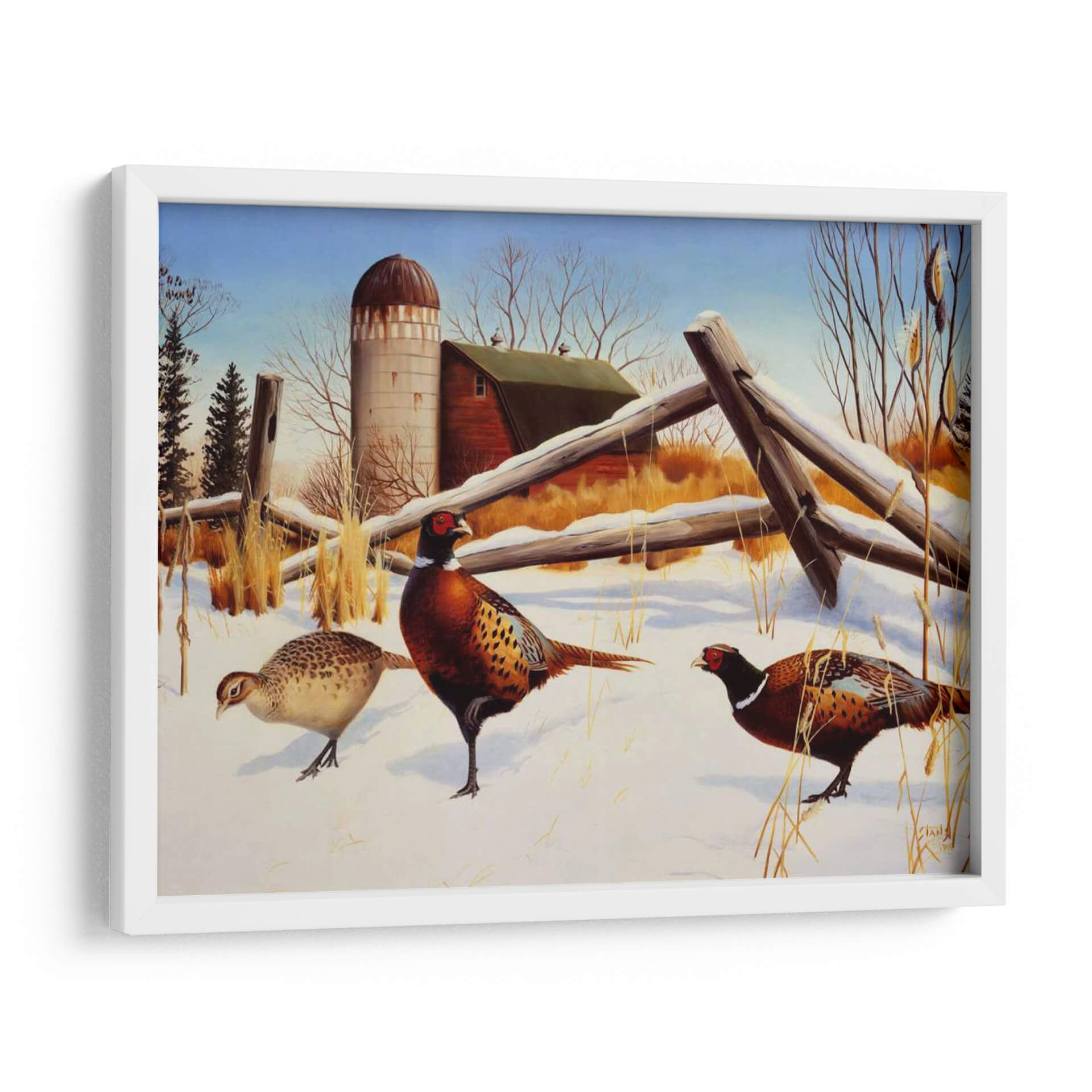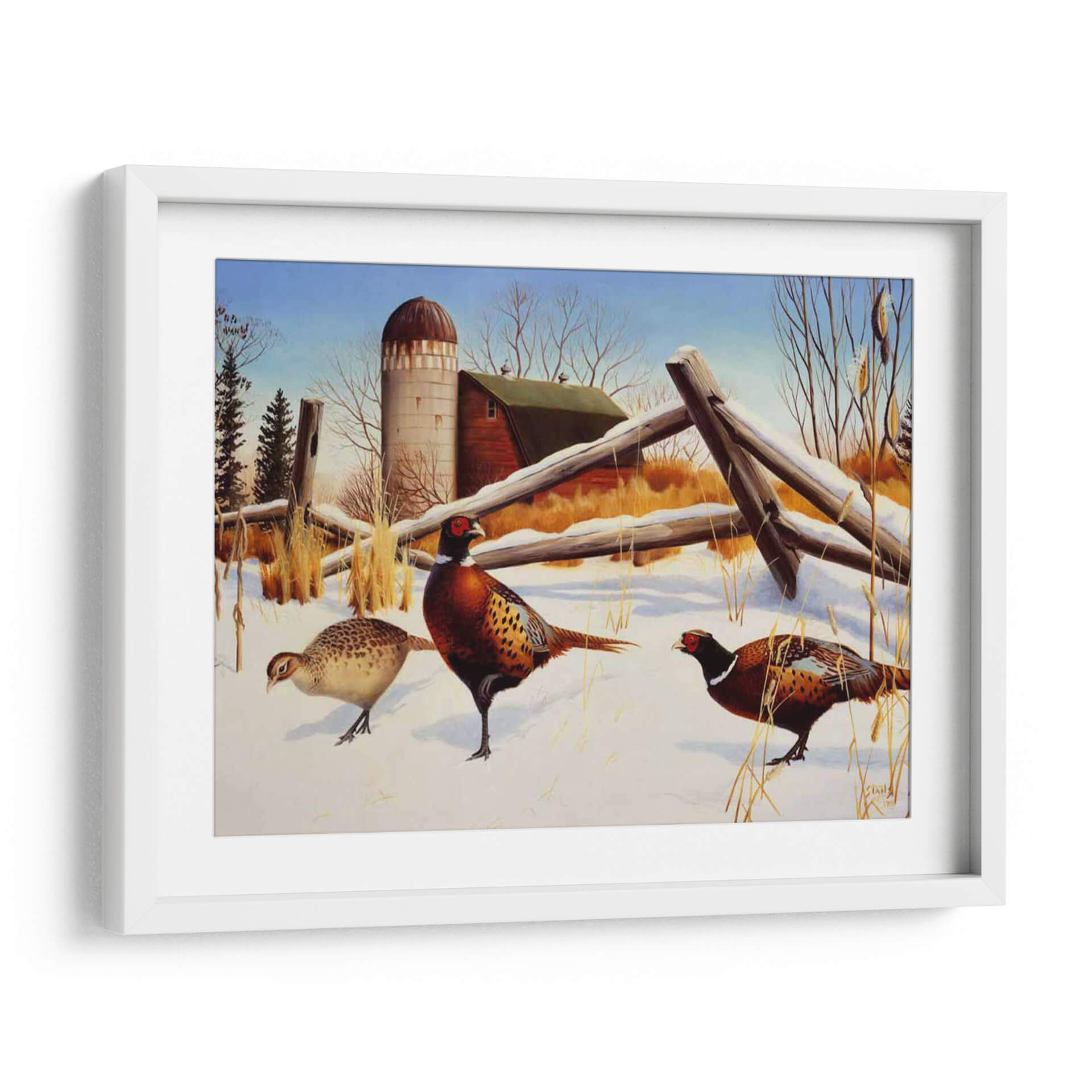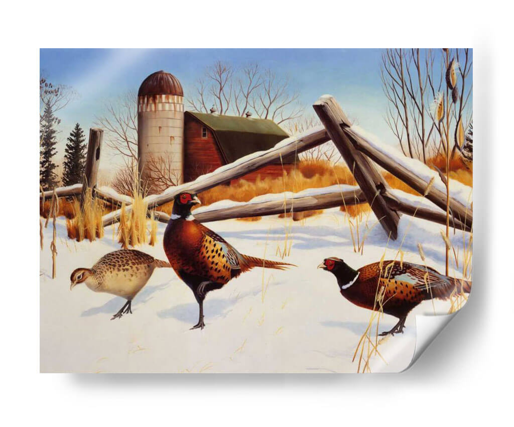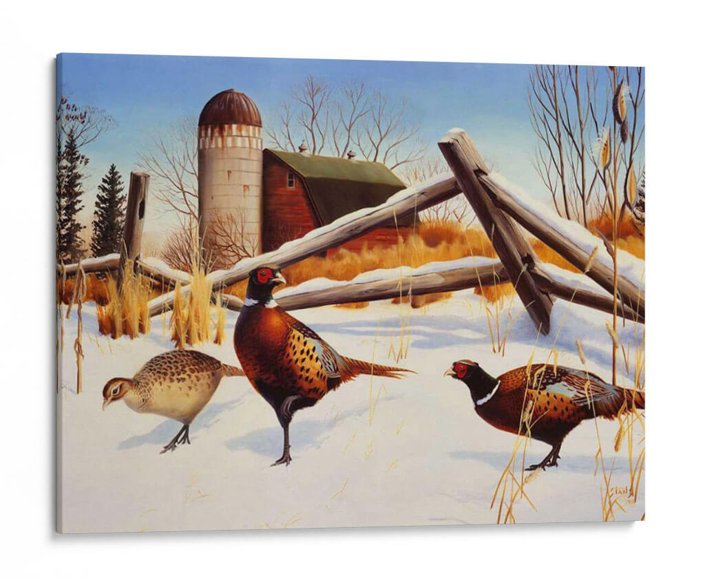 Sumérgete en la serena belleza invernal con "Faisanes II", una cautivadora obra de arte del artista Leo Stans. Este cuadro decorativo captura la esencia de un paisaje rural cubierto de nieve, donde tres faisanes de plumaje vibrante se mueven con gracia sobre la blanca alfombra. La composición, dominada por tonos tierra cálidos, el blanco puro de la nieve y el azul claro del cielo, crea una atmósfera de paz y tranquilidad. Los detalles intrincados de las aves, desde sus coloridas plumas hasta sus penetrantes ojos, demuestran la maestría del artista. El fondo presenta elementos rústicos como un granero y un silo, evocando una sensación de nostalgia y la vida sencilla del campo. "Faisanes II" es una pieza ideal para añadir un toque de naturaleza y serenidad a tu hogar u oficina, perfecto para salones, dormitorios o estudios que buscan una conexión con el mundo natural. Su estilo realista con toques de pintura clásica lo convierte en un elemento decorativo atemporal que embellecerá cualquier espacio con su encanto campestre y la elegancia de estas aves majestuosas, invitando a la contemplación y al aprecio por la fauna invernal.