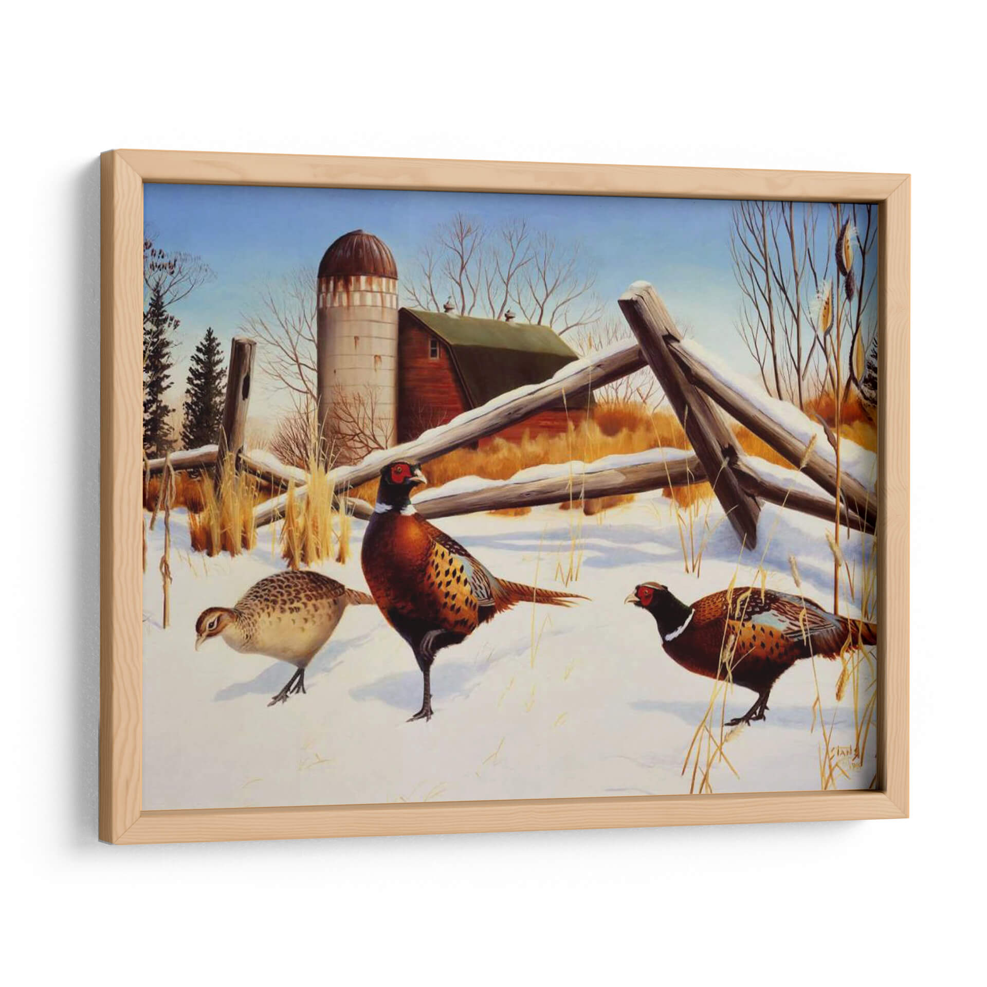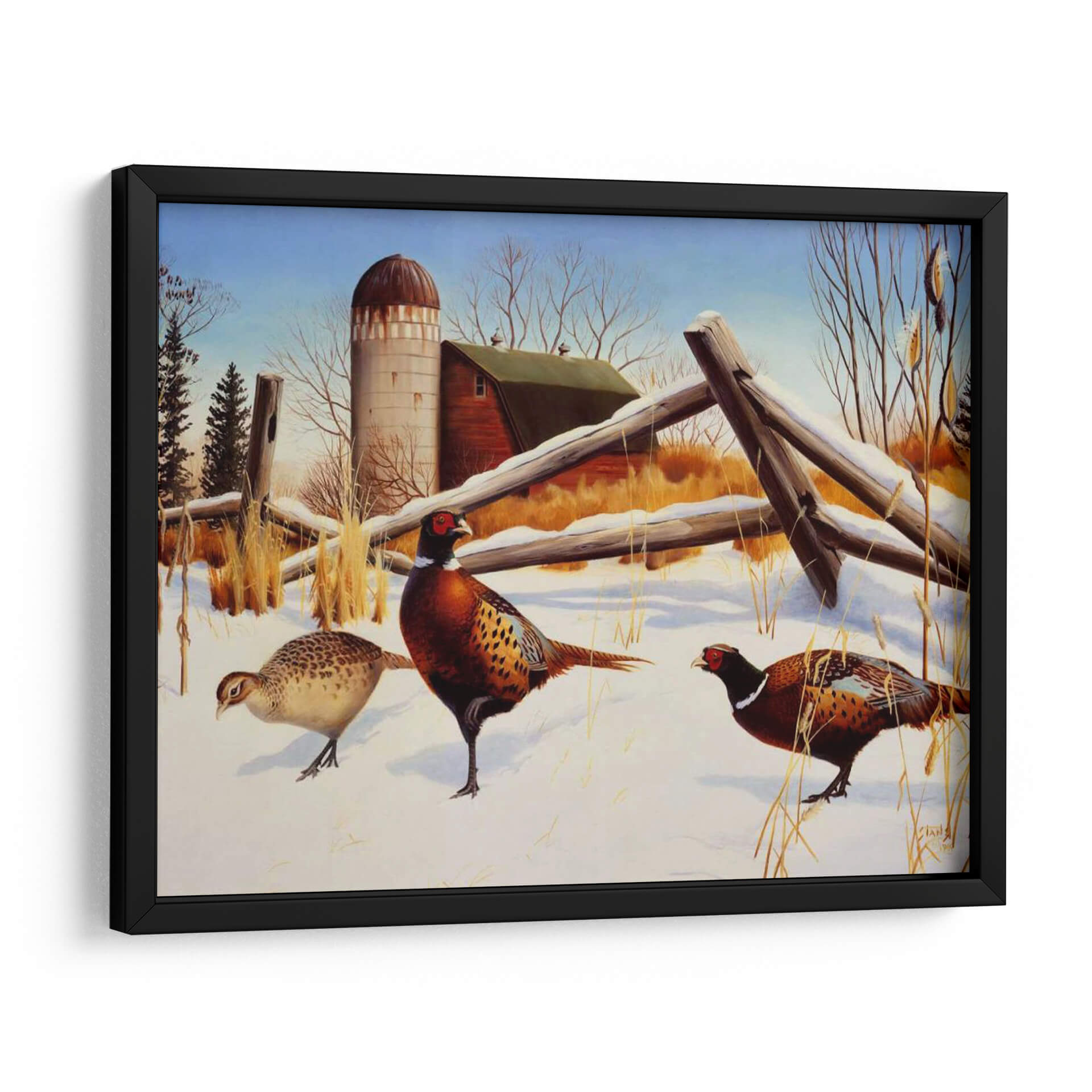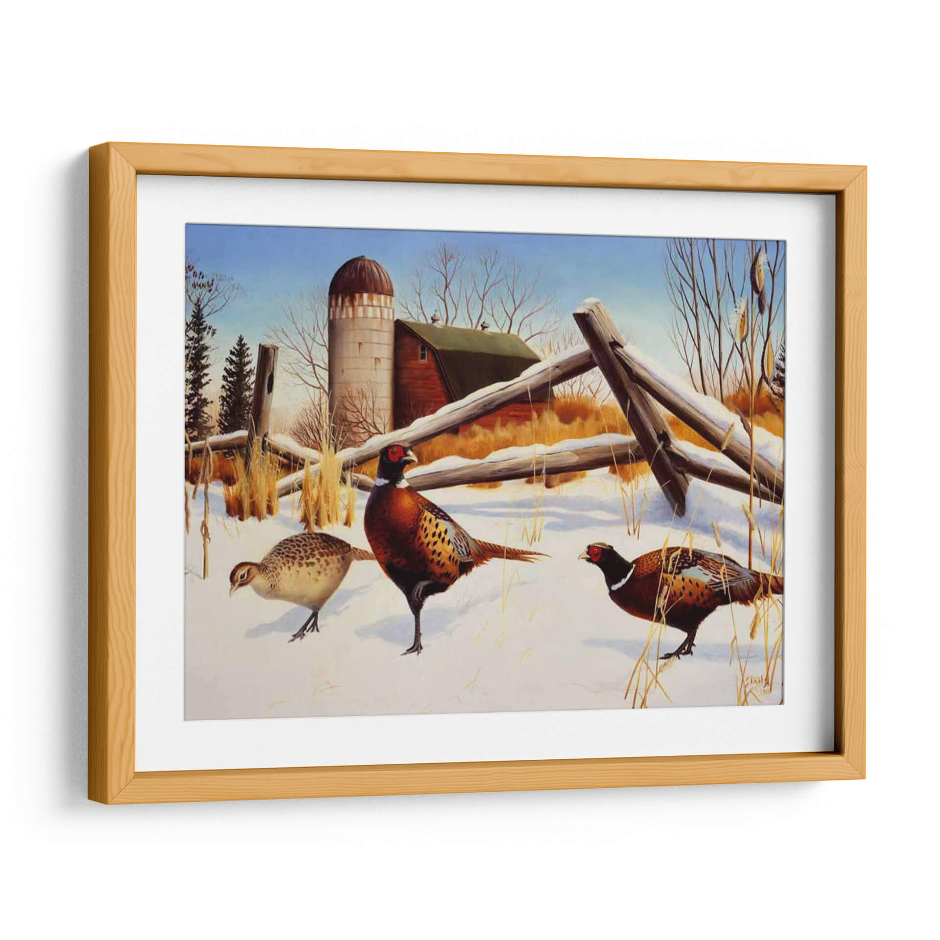 Sumérgete en la serena belleza invernal con "Faisanes II", una cautivadora obra de arte del artista Leo Stans. Este cuadro decorativo captura la esencia de un paisaje rural cubierto de nieve, donde tres faisanes de plumaje vibrante se mueven con gracia sobre la blanca alfombra. La composición, dominada por tonos tierra cálidos, el blanco puro de la nieve y el azul claro del cielo, crea una atmósfera de paz y tranquilidad. Los detalles intrincados de las aves, desde sus coloridas plumas hasta sus penetrantes ojos, demuestran la maestría del artista. El fondo presenta elementos rústicos como un granero y un silo, evocando una sensación de nostalgia y la vida sencilla del campo. "Faisanes II" es una pieza ideal para añadir un toque de naturaleza y serenidad a tu hogar u oficina, perfecto para salones, dormitorios o estudios que buscan una conexión con el mundo natural. Su estilo realista con toques de pintura clásica lo convierte en un elemento decorativo atemporal que embellecerá cualquier espacio con su encanto campestre y la elegancia de estas aves majestuosas, invitando a la contemplación y al aprecio por la fauna invernal.