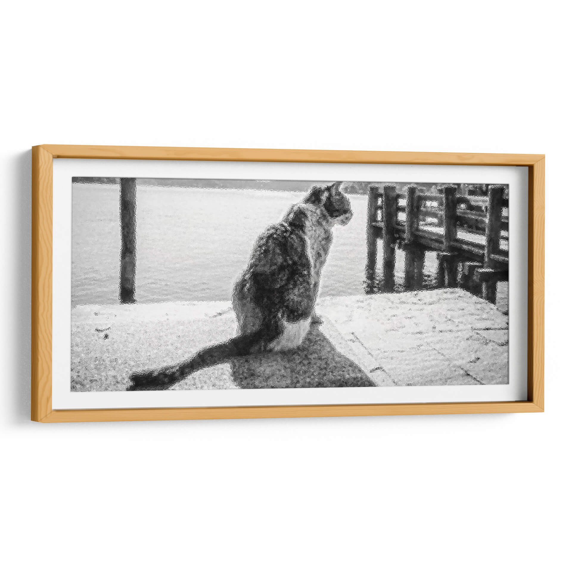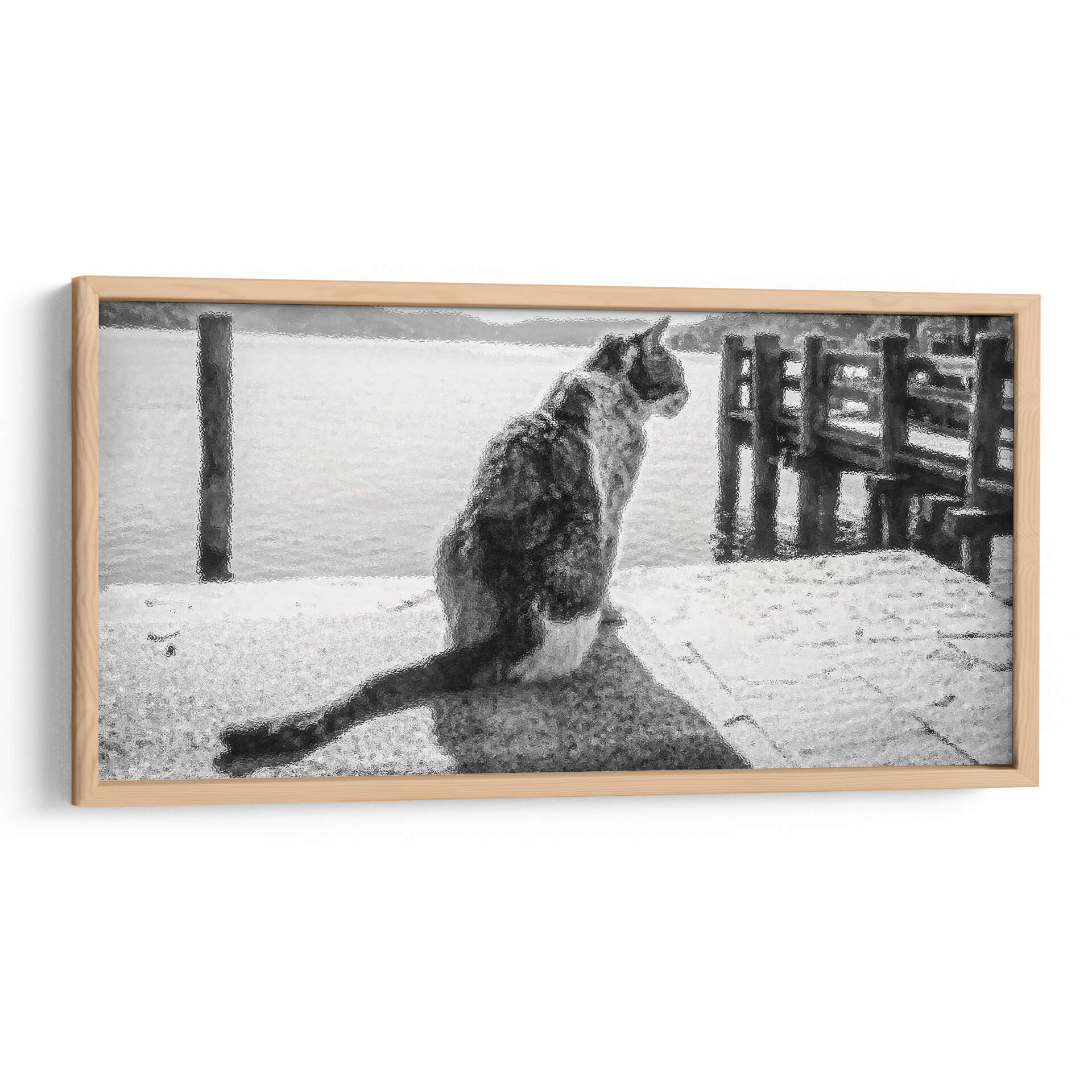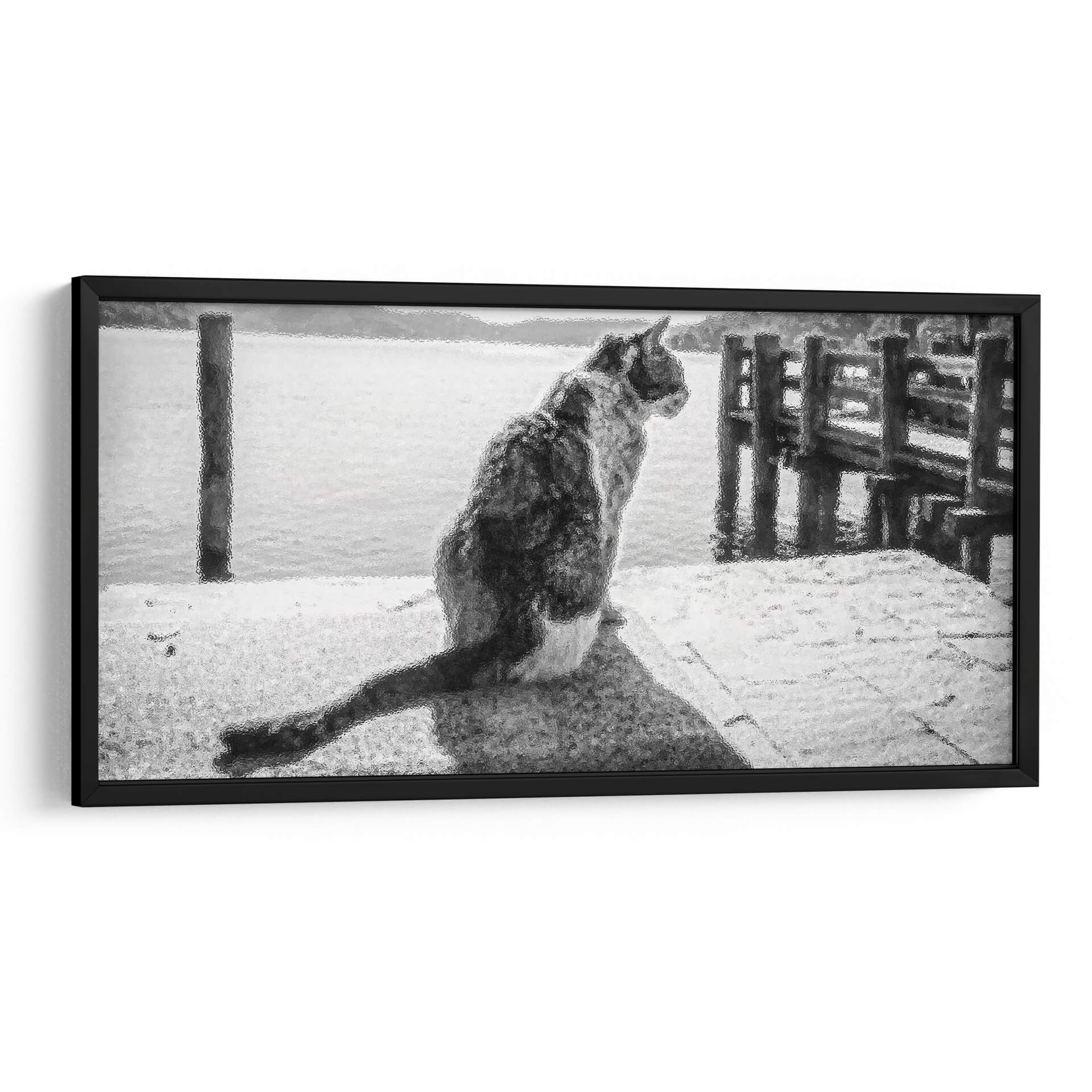 Sumérgete en la serena contemplación de "GATO EN EL MUELLE", una obra maestra de Ariadne Contreras que captura un momento de profunda quietud junto al mar. Este cuadro decorativo, con su atmósfera monocromática y su textura evocadora, transporta al espectador a un muelle tranquilo donde un gato, de espaldas al observador, mira hacia el horizonte acuático. La paleta de grises y blancos crea una sensación de paz y reflexión, ideal para espacios que buscan un toque de serenidad y elegancia sutil. La composición, centrada en la figura del felino y el vasto mar que se extiende ante él, invita a la introspección y a la conexión con la naturaleza. Las sutiles texturas añaden profundidad y un interés visual cautivador, haciendo de esta pieza un punto focal discreto pero poderoso. Perfecta para salas de estar, estudios o dormitorios, "GATO EN EL MUELLE" es más que una simple decoración; es una invitación a detenerse, observar y encontrar la belleza en los momentos de calma. Añade una pieza de arte contemporáneo que no solo embellece tu hogar, sino que también evoca una profunda sensación de tranquilidad y misterio, resonando con amantes de los animales y del arte abstracto.