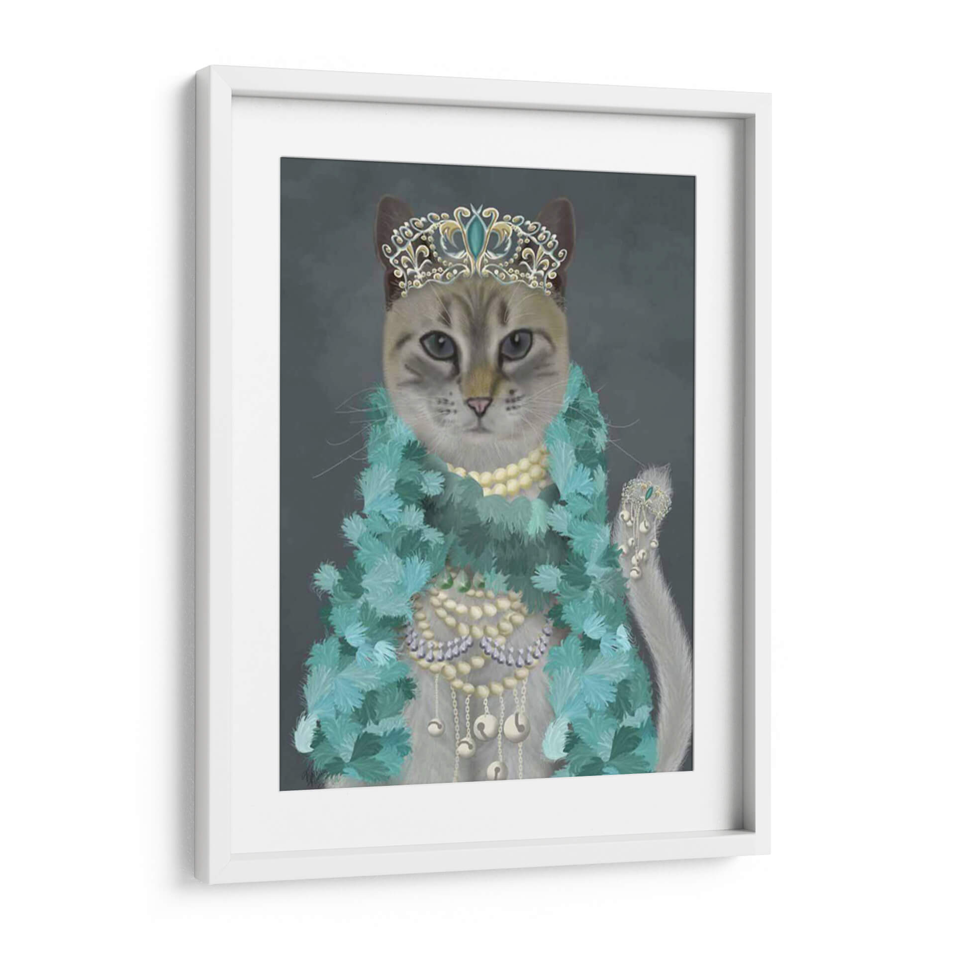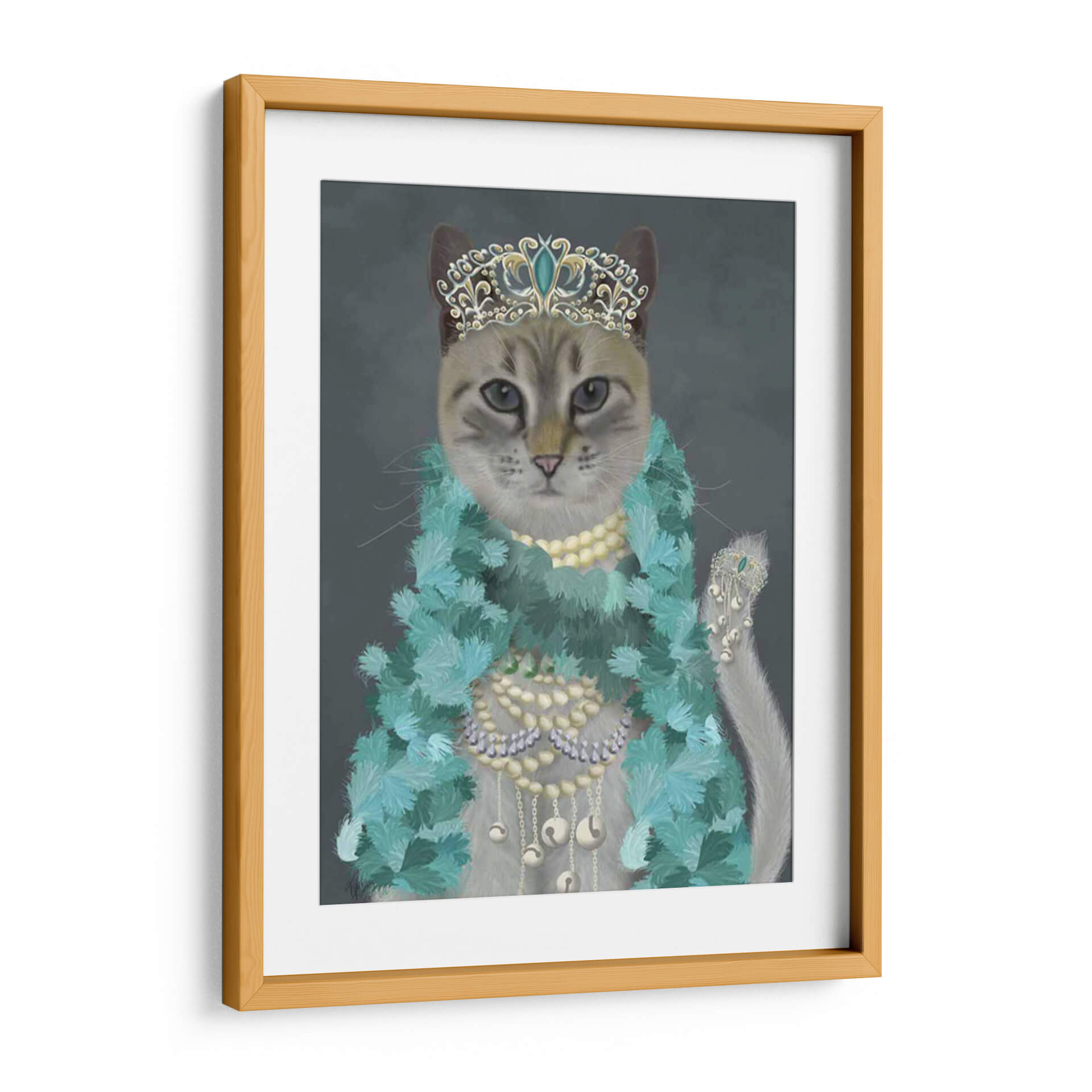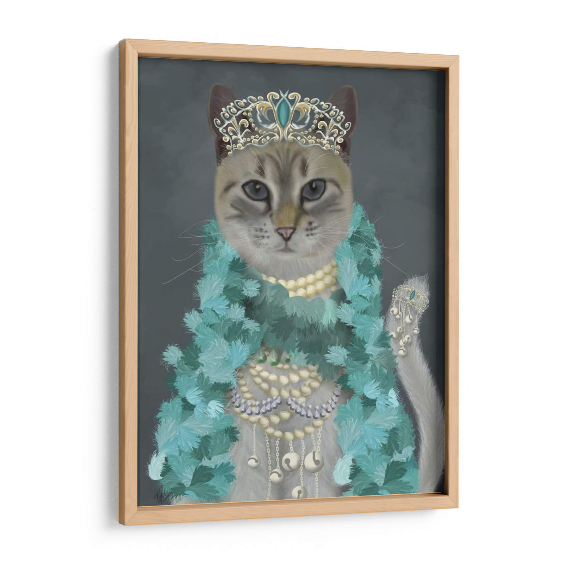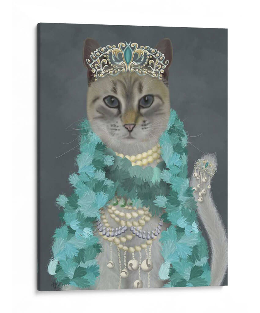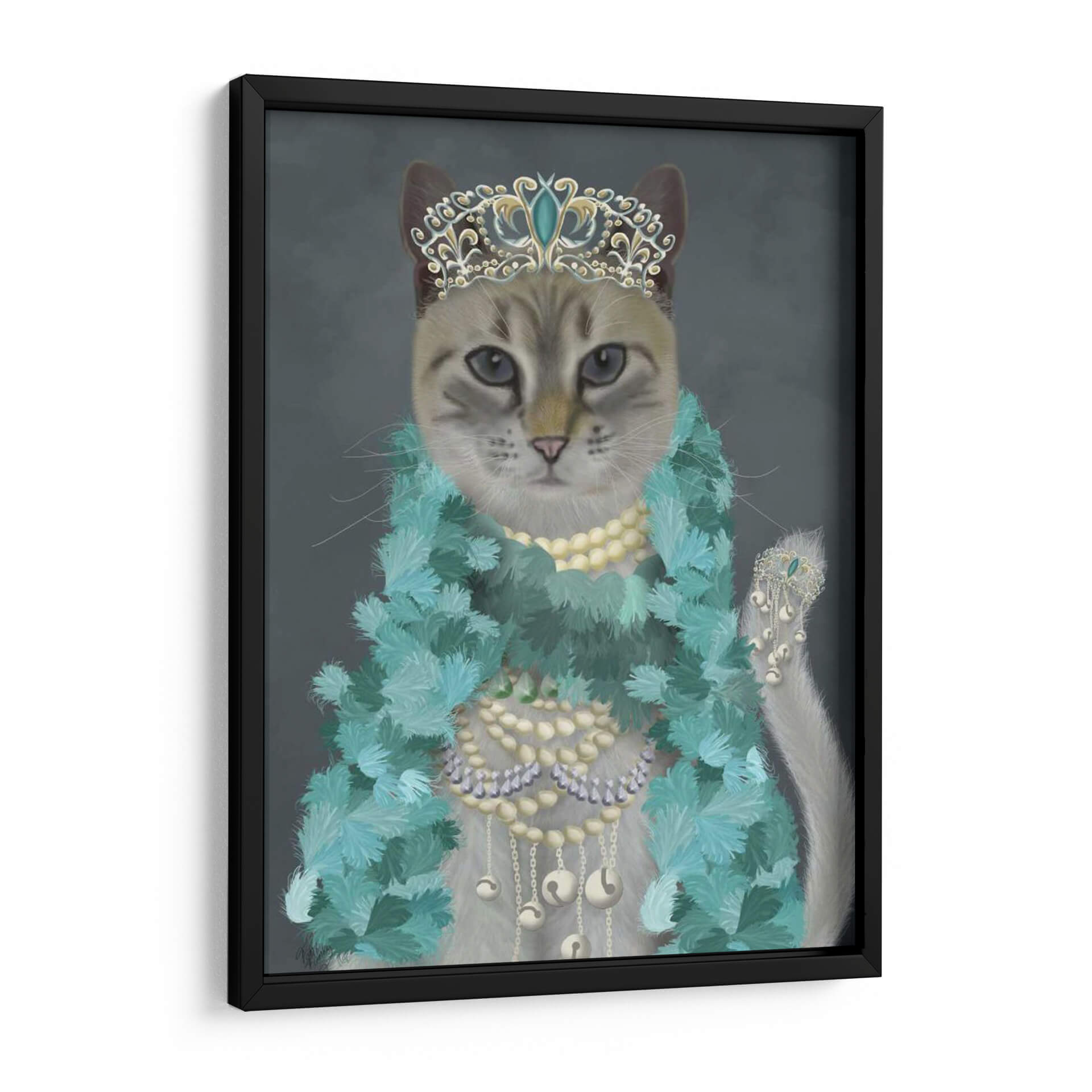 Este cautivador cuadro decorativo presenta un retrato de un gato gris ataviado con una majestuosa corona y un collar de perlas, junto con un exuberante adorno de plumas turquesas. La obra, titulada "Gato Gris Con Campanas, Retrato" y creada por Fab Funky, captura la esencia de la elegancia y la sofisticación con un toque de fantasía. Los tonos grises y plateados del felino contrastan maravillosamente con el vibrante color turquesa de sus accesorios, creando una paleta de colores armoniosa y atractiva. El estilo artístico, que combina realismo en el retrato del gato con elementos decorativos estilizados, resulta en una pieza única que evoca una sensación de realeza juguetona y encanto. La mirada directa del gato y la suntuosidad de sus adornos invitan a la contemplación, añadiendo un punto focal distintivo a cualquier estancia. Este cuadro es ideal para espacios que buscan un toque de originalidad y personalidad, como una sala de estar moderna, un estudio o incluso una habitación infantil con un diseño audaz. Su composición centra la atención en el felino, asegurando que cada detalle, desde el brillo de la corona hasta la textura de las plumas, sea apreciado.