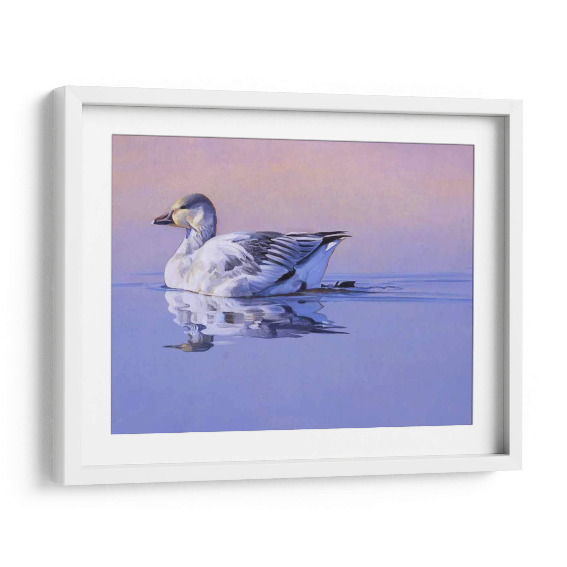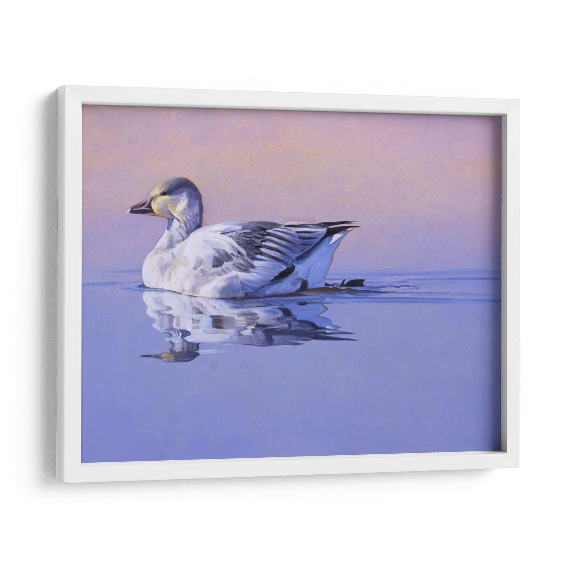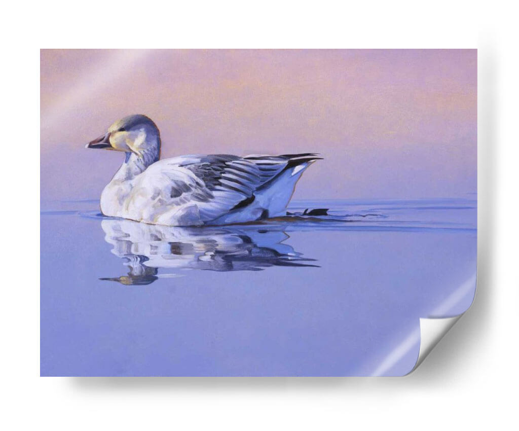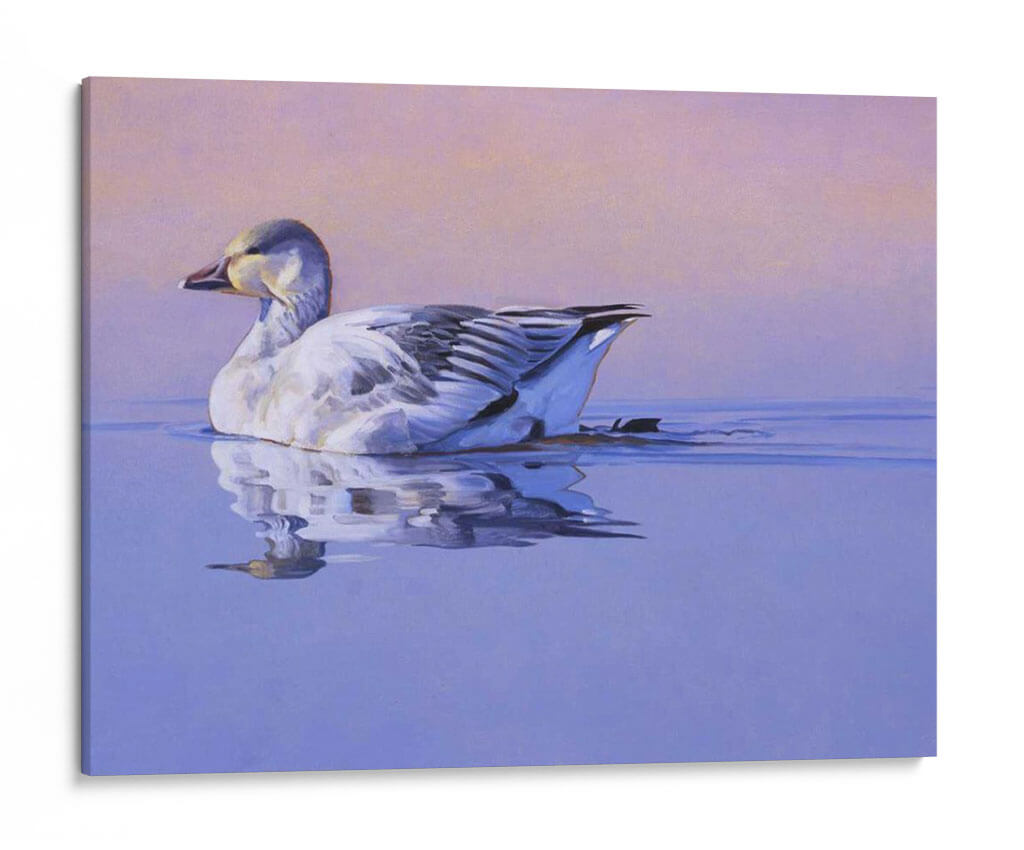 Captura la serenidad y la belleza de la naturaleza con "Gloria De La Mañana", una obra de arte contemporáneo que evoca paz y tranquilidad. Esta pieza presenta un ganso blanco majestuoso nadando plácidamente en aguas serenas, con un reflejo detallado que duplica su elegancia. La paleta de colores se compone de tonos suaves de lavanda y rosa pálido en el cielo, que contrastan armónicamente con los azules profundos del agua y los sutiles grises y blancos del ave. La delicadeza en la pincelada y la composición equilibrada invitan a la contemplación, creando una atmósfera de calma absoluta. Este cuadro decorativo es ideal para cualquier espacio que busque un toque de naturaleza y serenidad, como dormitorios, estudios o salas de estar. Su estilo realista, con toques impresionistas en el fondo, lo convierte en una adición versátil para decoraciones modernas o clásicas. "Gloria De La Mañana" no es solo una imagen, es una invitación a la introspección y a la apreciación de los momentos de quietud en nuestro entorno. Añade esta pieza única a tu colección y transforma tu hogar en un santuario de paz y buen gusto.