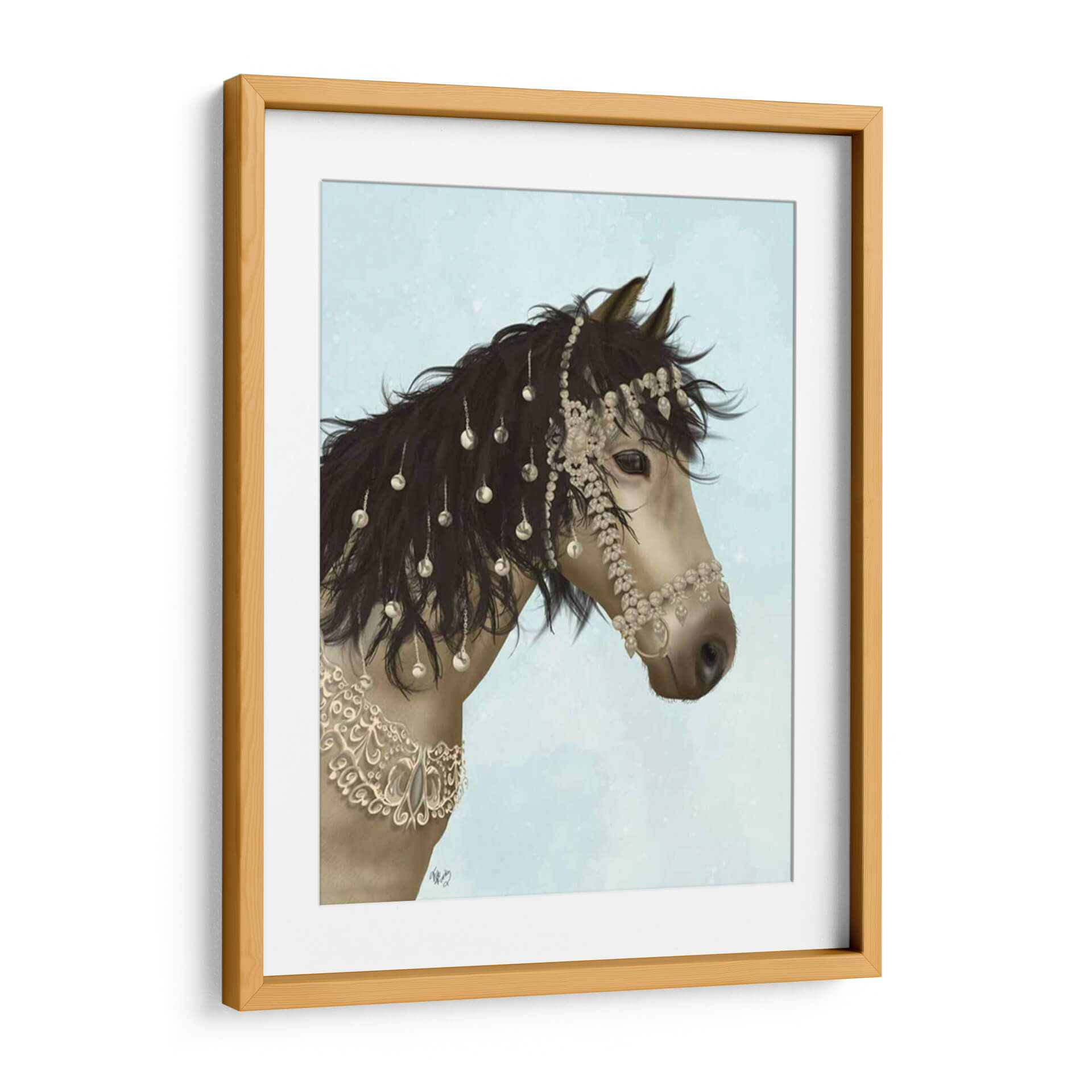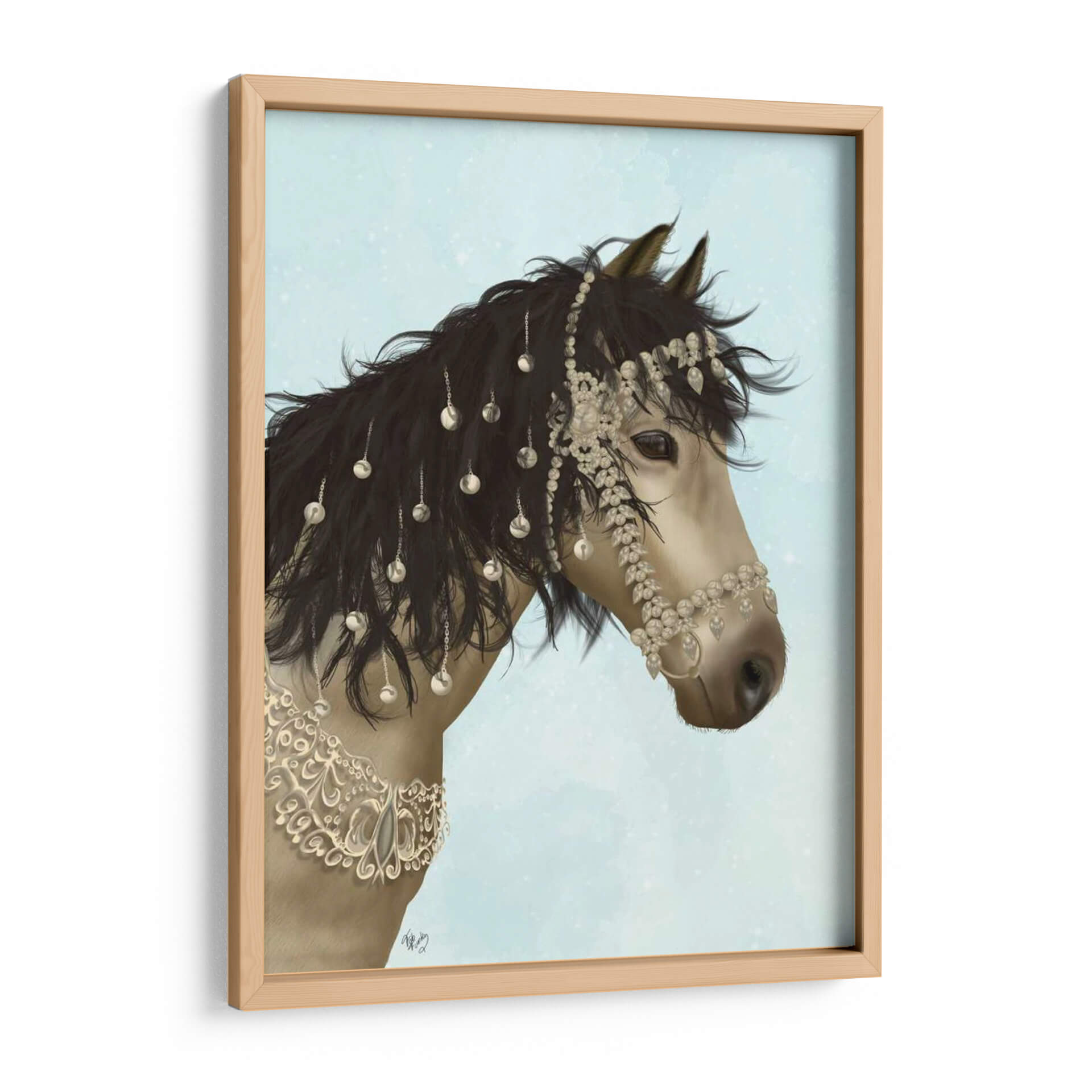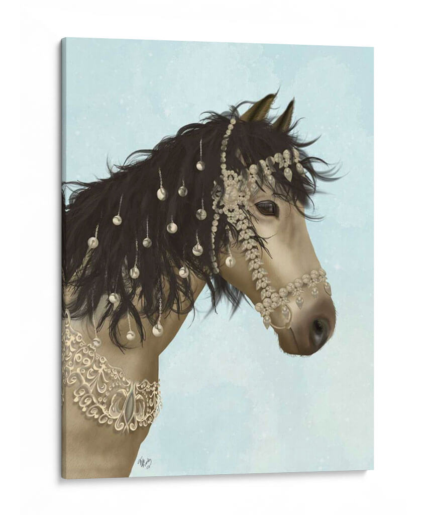 Transforma tu espacio con la majestuosa presencia de "Horse Buckskin Con Brida Enjoyada", una obra de arte que captura la elegancia y el espíritu indomable del caballo. Este cuadro decorativo presenta un primer plano de un caballo de pelaje buckskin, cuya crin oscura se adorna con intrincadas joyas y abalorios que brillan con un delicado resplandor. La brida enjoyada, ricamente detallada con cristales y adornos de filigrana, realza la nobleza del animal, creando un punto focal cautivador. El fondo, un cielo azul claro con sutiles motas de luz, evoca una sensación de serenidad y amplitud, permitiendo que la majestuosidad del caballo sea la protagonista indiscutible. Los tonos tierra del caballo contrastan armoniosamente con el azul etéreo, creando una paleta de colores equilibrada y sofisticada. Ideal para salones modernos, oficinas elegantes o dormitorios que buscan un toque de distinción y poder. Esta pieza de arte contemporáneo, con su detallada ilustración digital, aporta un aire de lujo y sofisticación, convirtiéndose en un elemento decorativo que inspira admiración y evoca la fuerza y la belleza de la naturaleza.