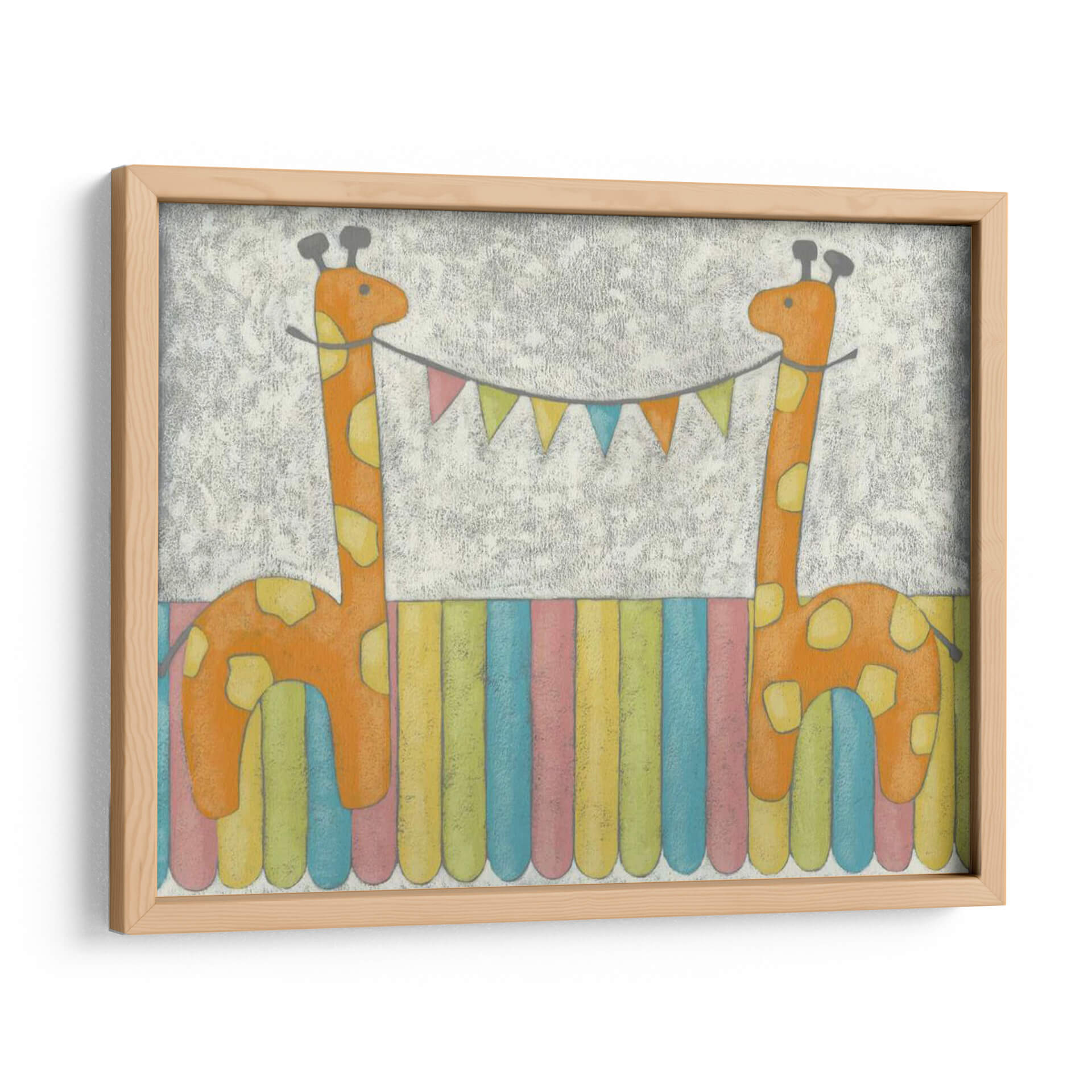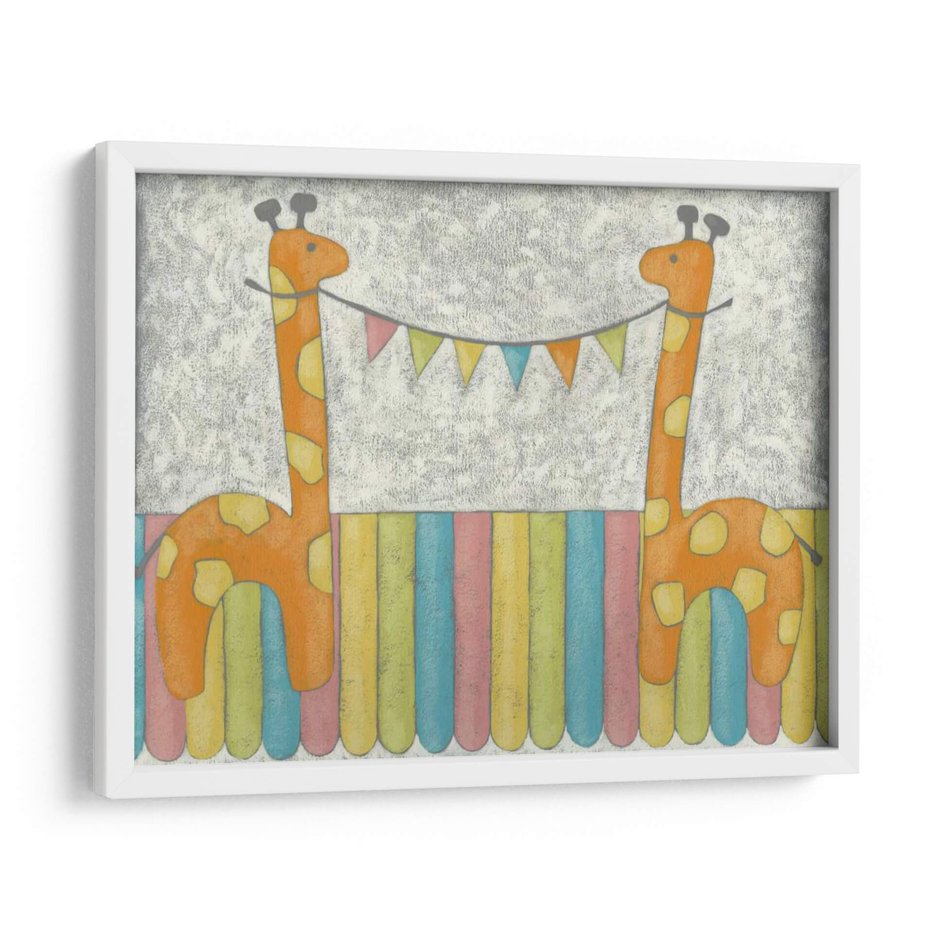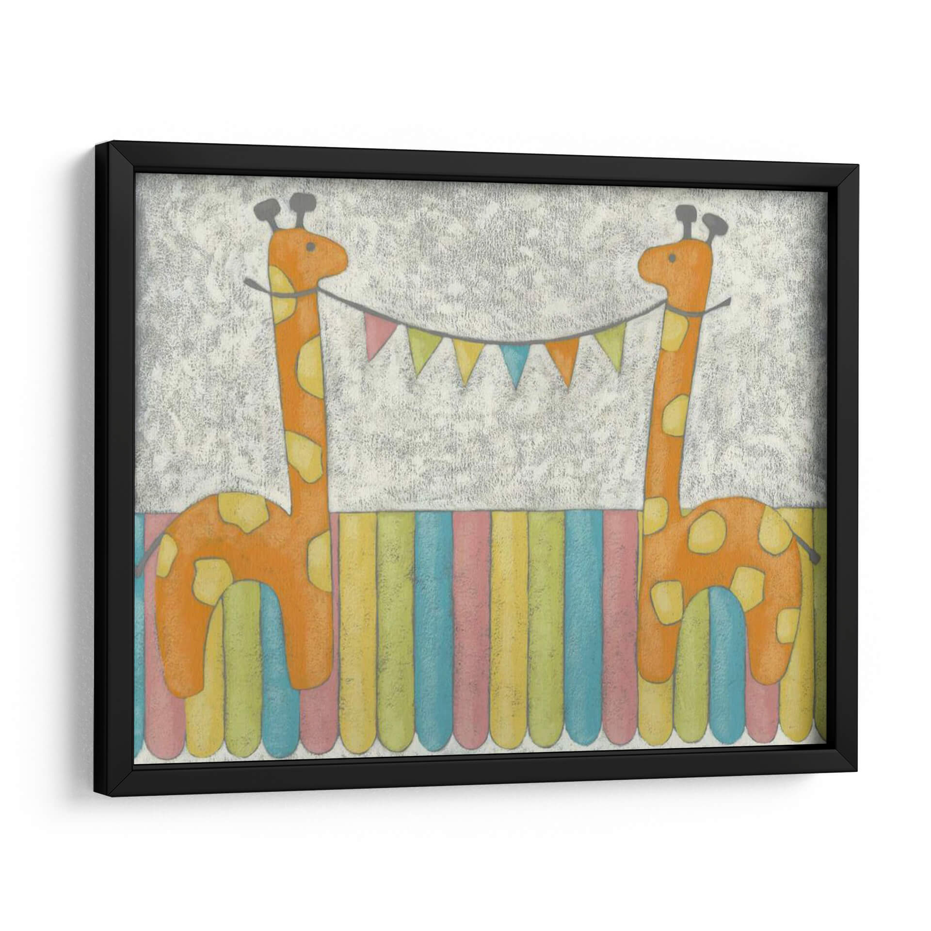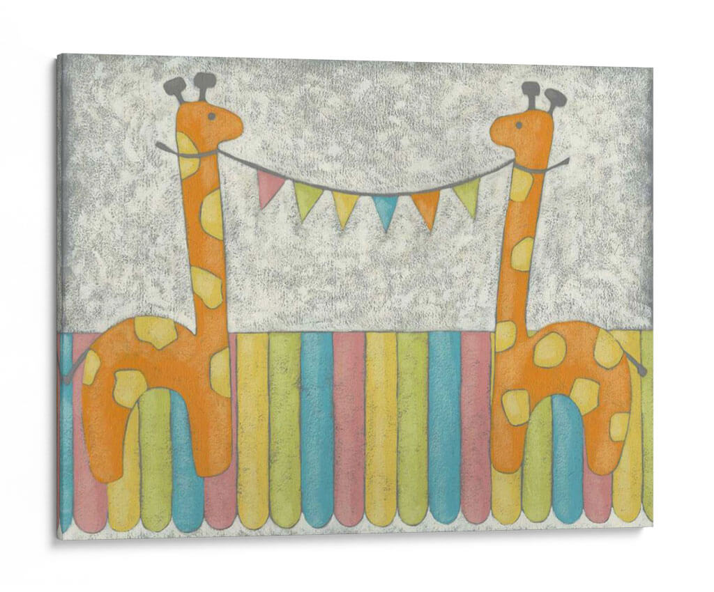 Emb El cuadro decorativo "Jirafas De Carnaval" de Chariklia Zarris es una obra vibrante y encantadora que inyecta alegría y un toque de fantasía a cualquier espacio. Presenta dos adorables jirafas de un naranja cálido, decoradas con manchas amarillas, que parecen celebrar un momento festivo. Sostienen entre ellas una guirnalda de banderines multicolores, añadiendo un aire de celebración y diversión. El fondo texturizado en tonos grises y el suelo compuesto por vibrantes franjas verticales de colores pastel (azul, rosa, amarillo, verde) crean un ambiente lúdico y alegre. El estilo pictórico, con un toque infantil y tierno, es perfecto para habitaciones de niños, guarderías o cualquier estancia que busque un punto focal lleno de optimismo y dulzura. Esta pieza es ideal para añadir un toque de color y personalidad, evocando sentimientos de felicidad y despreocupación. Su diseño único y su temática animal la convierten en una adición encantadora a la decoración de interiores, capaz de transformar un espacio ordinario en un rincón lleno de magia y buen humor, resonando con la ternura de la infancia y la celebración de la vida. Las Jirafas de Carnaval son una invitación a la sonrisa y al juego en tu hogar.