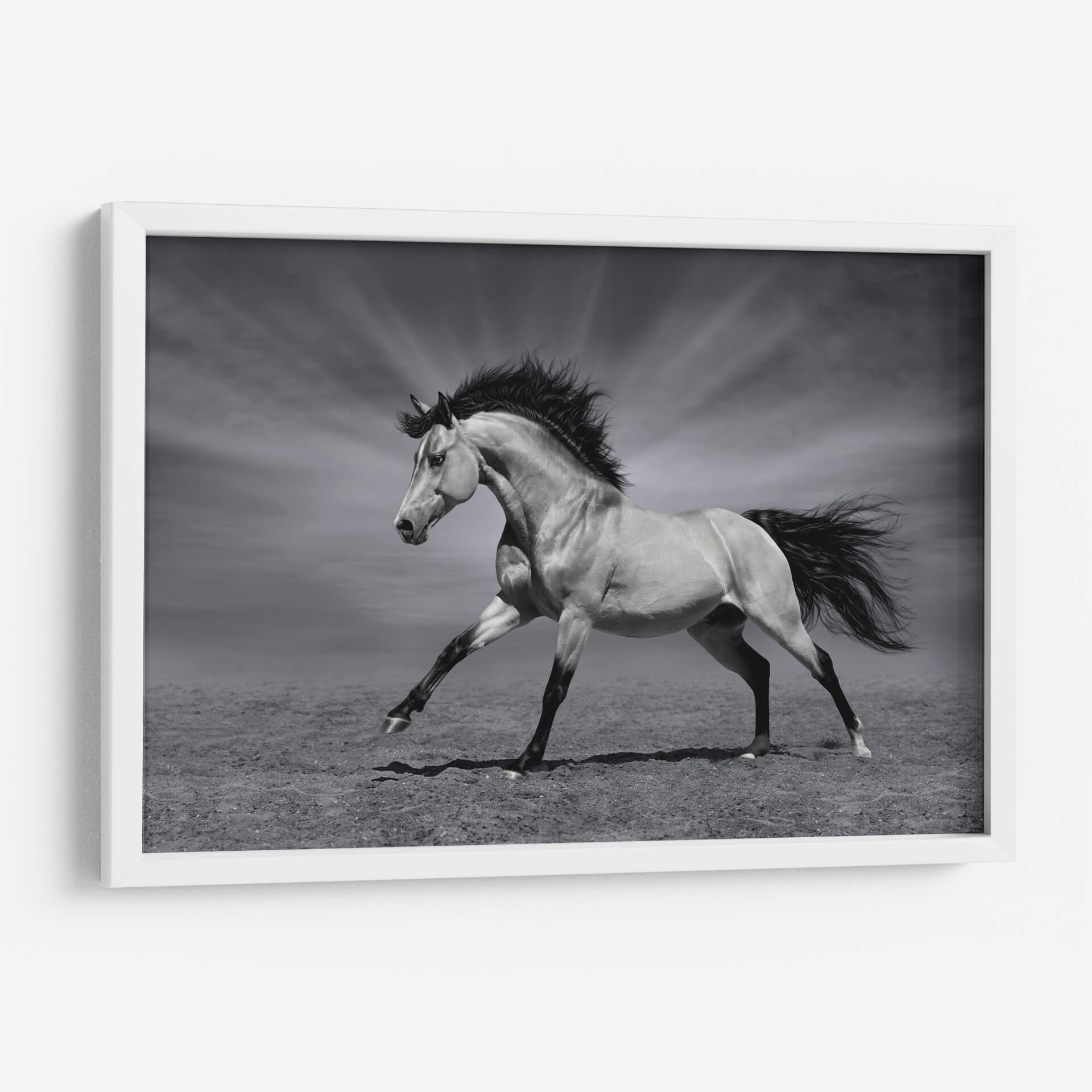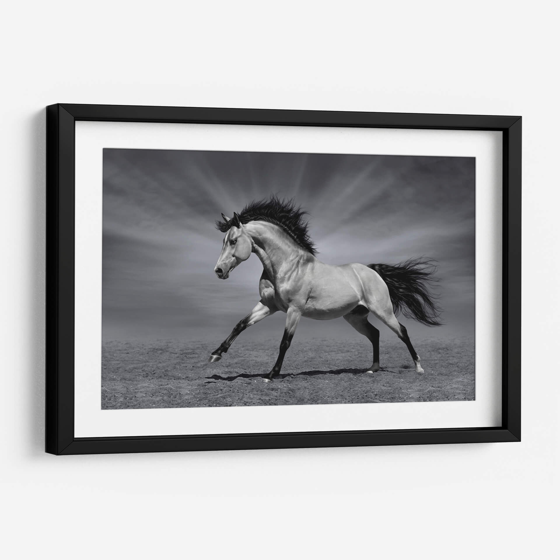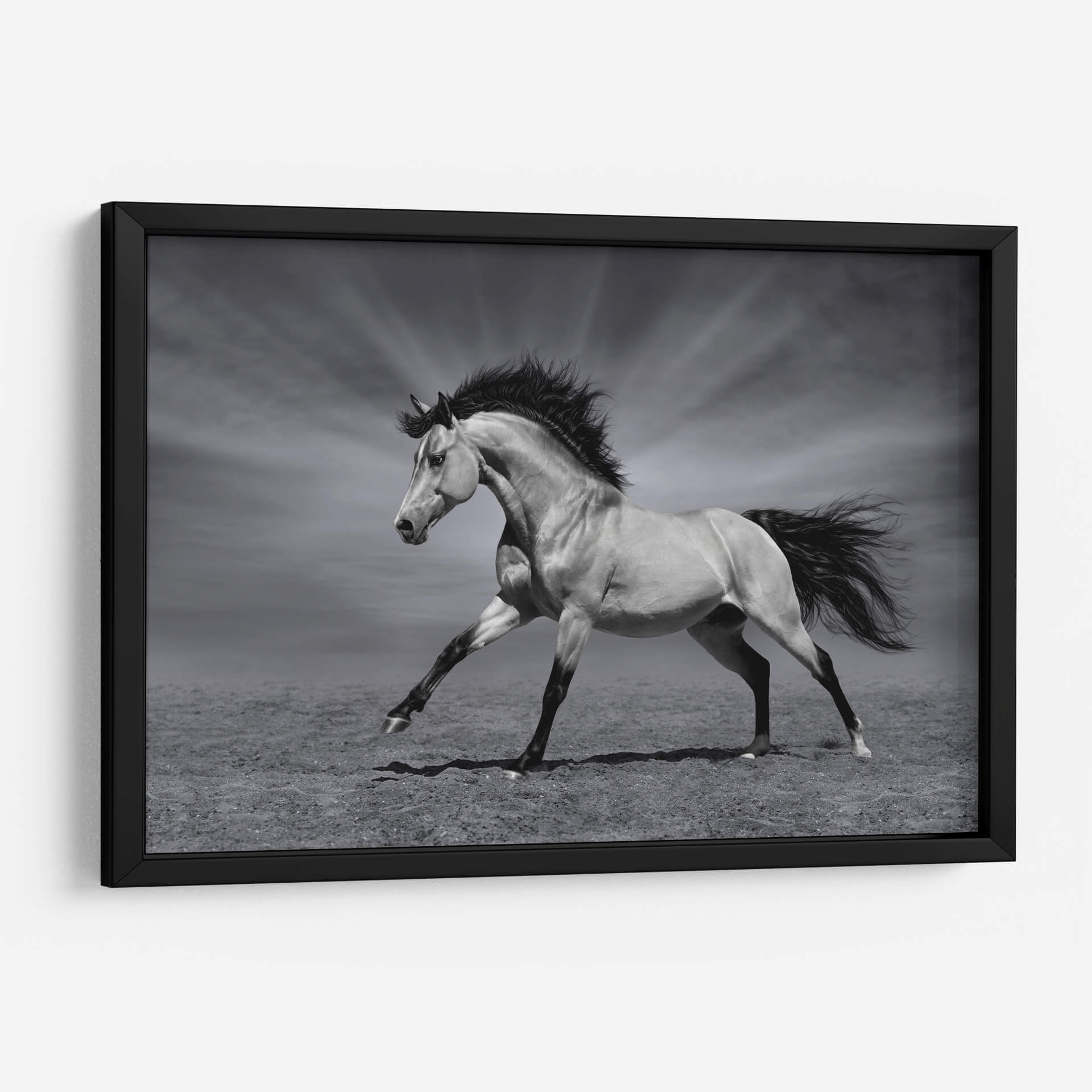 Captura la esencia indomable de la naturaleza con "La Fuerza del Caballo", un cuadro decorativo que emana poder y elegancia. Esta obra maestra en blanco y negro presenta un magnífico caballo en pleno galope, con su crin al viento y una postura que refleja pura vitalidad y libertad. La cuidada iluminación resalta la musculatura del animal y crea un contraste dramático con el fondo, donde unos rayos de luz emergen de un cielo nublado, añadiendo un toque de majestuosidad y misterio. El estilo fotográfico realista, combinado con una paleta de grises sutiles, otorga a esta pieza una atemporalidad que se adapta a cualquier estilo de decoración, desde el moderno hasta el clásico. Ideal para salones, estudios o cualquier espacio que busque un punto focal impactante y lleno de energía. Este cuadro decorativo no solo embellecerá tus paredes, sino que también inspirará un sentimiento de fuerza y determinación en tu día a día, convirtiéndose en una adición significativa a tu colección de arte.