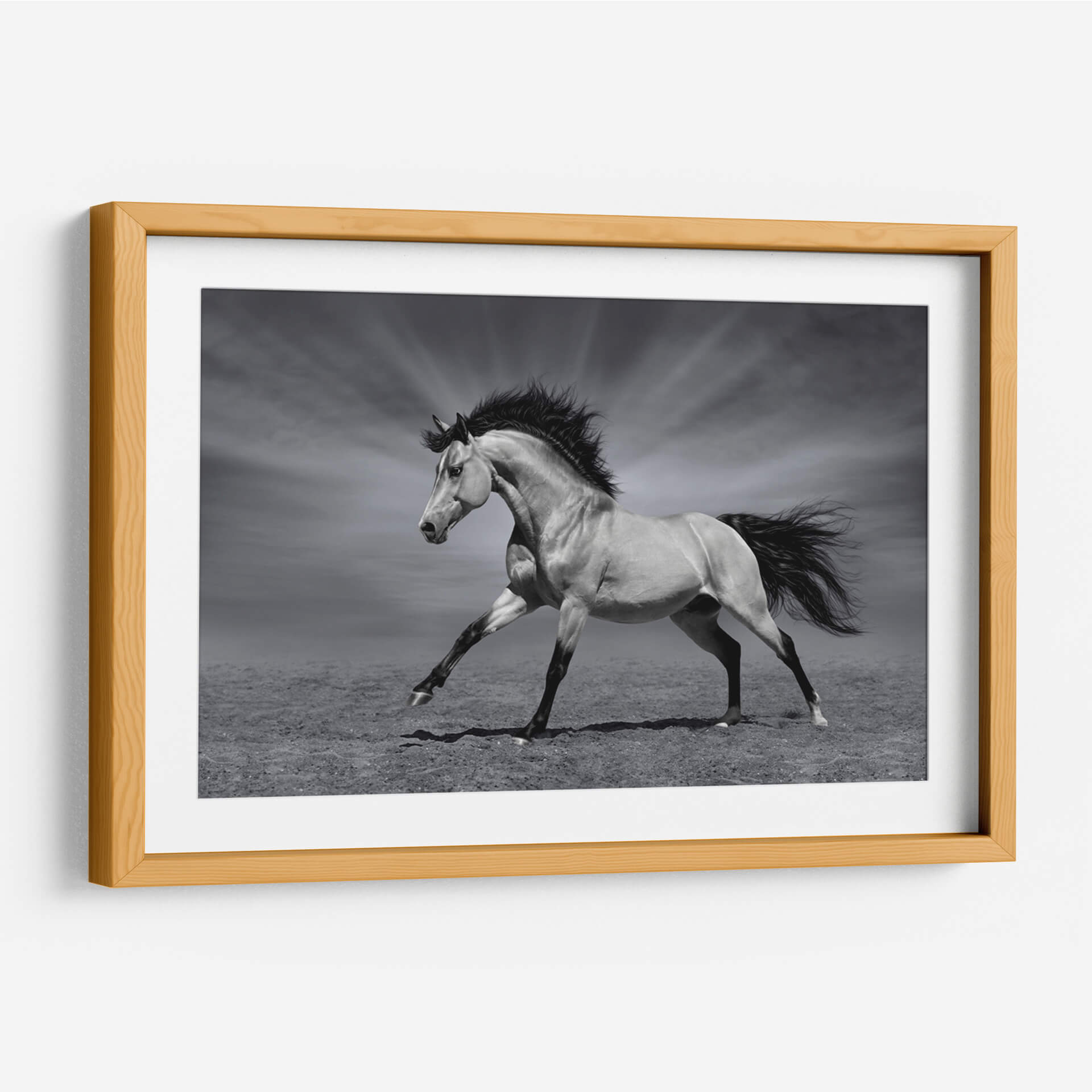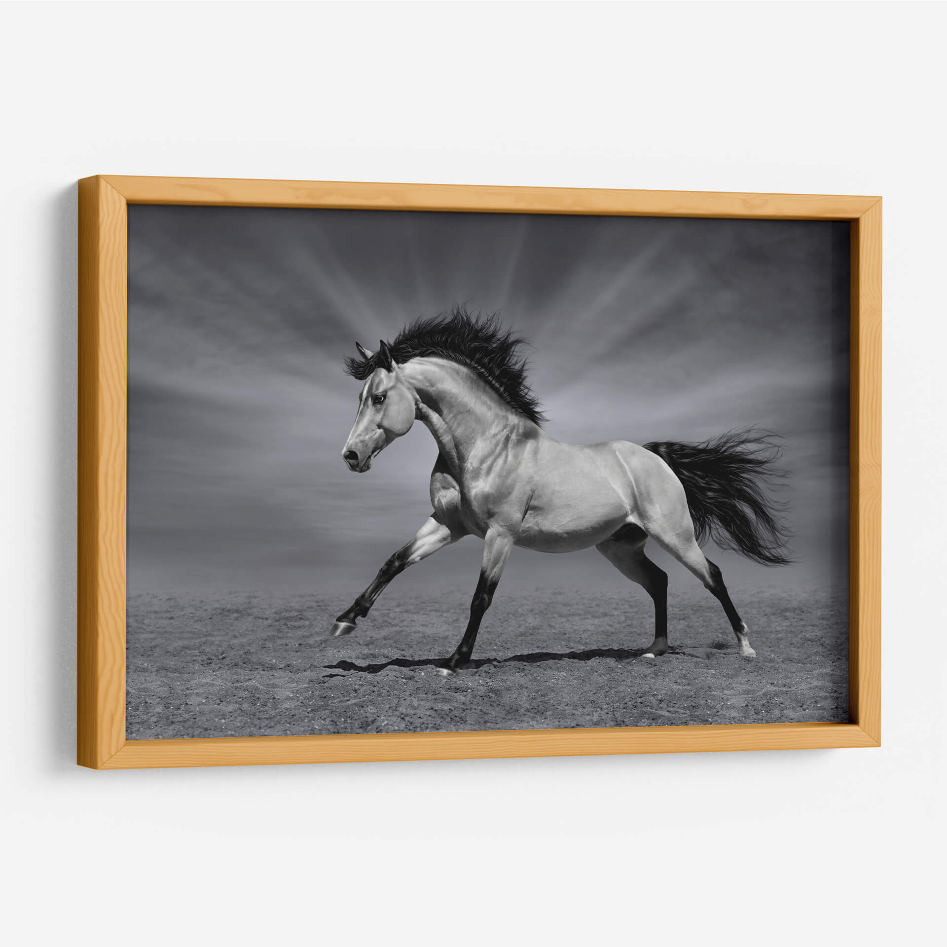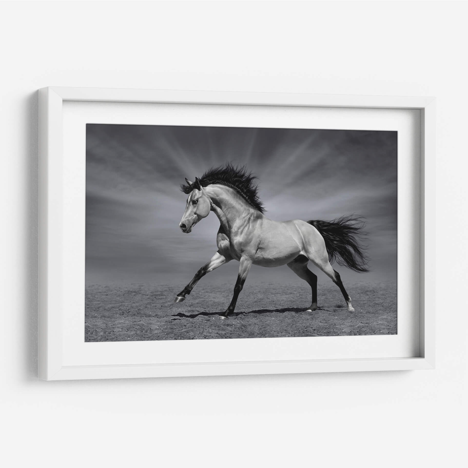 Captura la esencia indomable de la naturaleza con "La Fuerza del Caballo", un cuadro decorativo que emana poder y elegancia. Esta obra maestra en blanco y negro presenta un magnífico caballo en pleno galope, con su crin al viento y una postura que refleja pura vitalidad y libertad. La cuidada iluminación resalta la musculatura del animal y crea un contraste dramático con el fondo, donde unos rayos de luz emergen de un cielo nublado, añadiendo un toque de majestuosidad y misterio. El estilo fotográfico realista, combinado con una paleta de grises sutiles, otorga a esta pieza una atemporalidad que se adapta a cualquier estilo de decoración, desde el moderno hasta el clásico. Ideal para salones, estudios o cualquier espacio que busque un punto focal impactante y lleno de energía. Este cuadro decorativo no solo embellecerá tus paredes, sino que también inspirará un sentimiento de fuerza y determinación en tu día a día, convirtiéndose en una adición significativa a tu colección de arte.