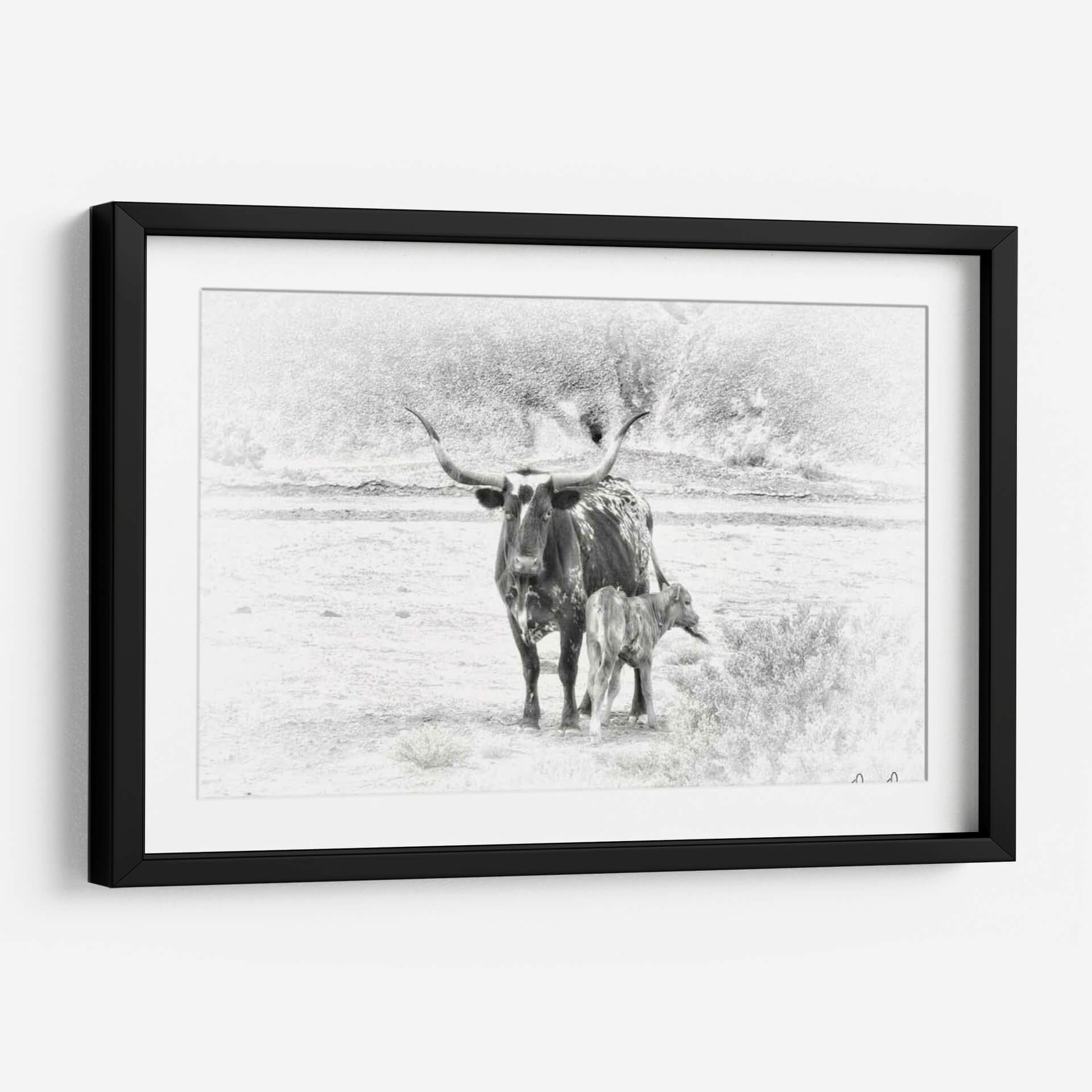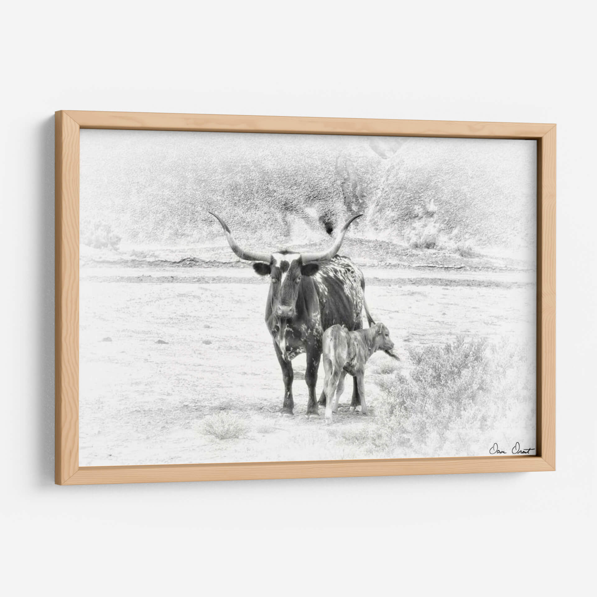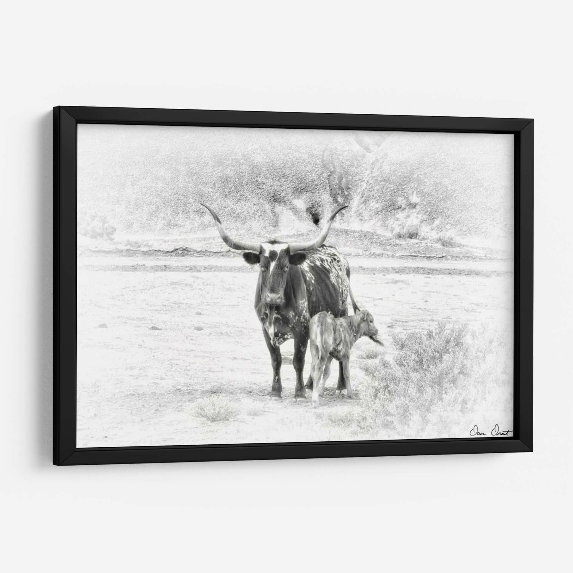 Captura la esencia del espíritu salvaje con "Longhorn Y Bebe", una obra de arte en blanco y negro del artista David Drost. Esta pieza evoca una poderosa conexión entre la madre y su cría, inmortalizada en un entorno desértico o árido. La detallada textura del pelaje de los longhorns, junto con la suavidad de las colinas en el fondo, crea una atmósfera de calma y resiliencia. La composición se centra en la imponente figura de la vaca longhorn y su ternero juguetón, transmitiendo una sensación de protección y ternura en medio de la vastedad. El estilo fotográfico, con su paleta monocromática, resalta la fuerza y la belleza natural de estos animales emblemáticos. Este cuadro decorativo es perfecto para añadir un toque de carácter y profundidad a cualquier espacio, ya sea una sala de estar rústica, una oficina con temática country o un dormitorio que busque serenidad. Su impacto visual lo convierte en un punto focal memorable, invitando a la contemplación y al aprecio por la vida en su forma más pura. Ideal para amantes de la naturaleza, la fotografía artística y la decoración con alma.