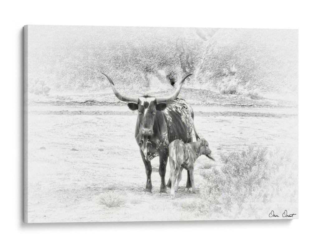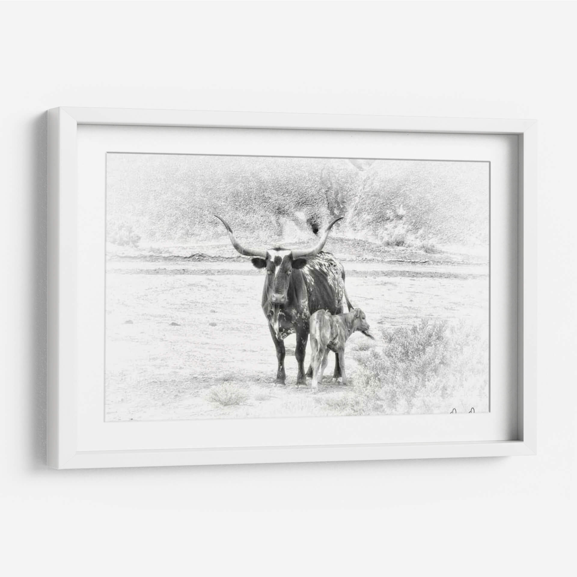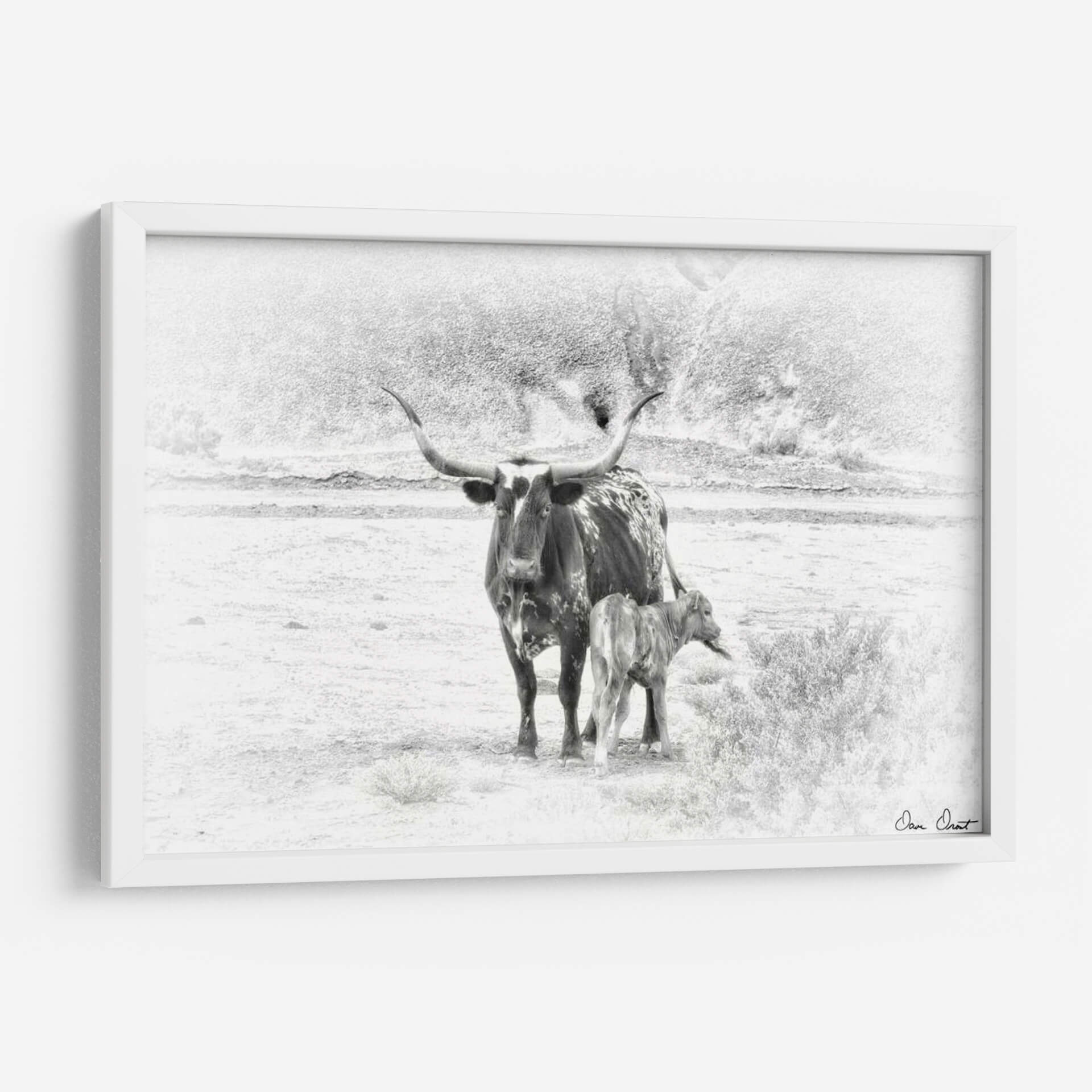 Captura la esencia del espíritu salvaje con "Longhorn Y Bebe", una obra de arte en blanco y negro del artista David Drost. Esta pieza evoca una poderosa conexión entre la madre y su cría, inmortalizada en un entorno desértico o árido. La detallada textura del pelaje de los longhorns, junto con la suavidad de las colinas en el fondo, crea una atmósfera de calma y resiliencia. La composición se centra en la imponente figura de la vaca longhorn y su ternero juguetón, transmitiendo una sensación de protección y ternura en medio de la vastedad. El estilo fotográfico, con su paleta monocromática, resalta la fuerza y la belleza natural de estos animales emblemáticos. Este cuadro decorativo es perfecto para añadir un toque de carácter y profundidad a cualquier espacio, ya sea una sala de estar rústica, una oficina con temática country o un dormitorio que busque serenidad. Su impacto visual lo convierte en un punto focal memorable, invitando a la contemplación y al aprecio por la vida en su forma más pura. Ideal para amantes de la naturaleza, la fotografía artística y la decoración con alma.