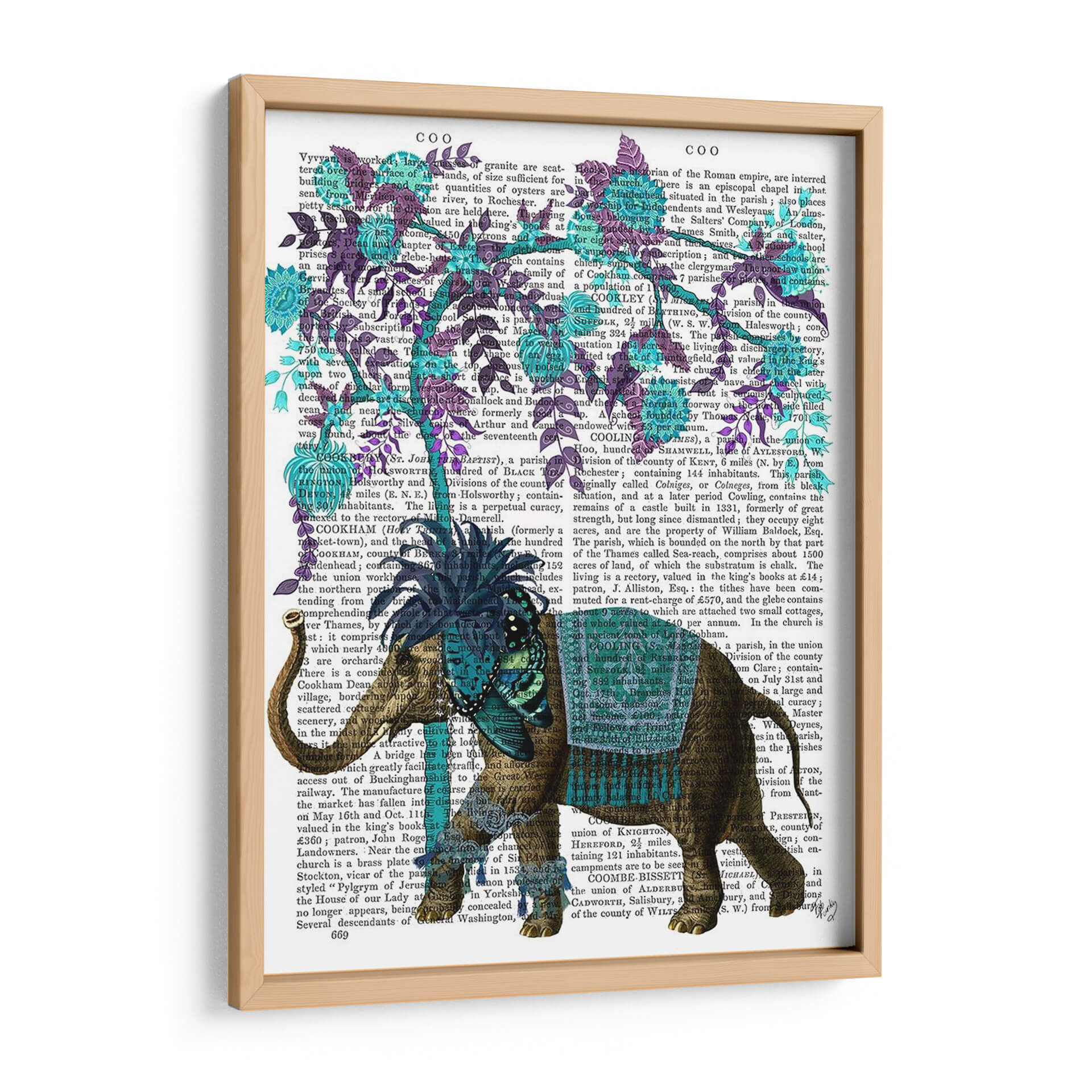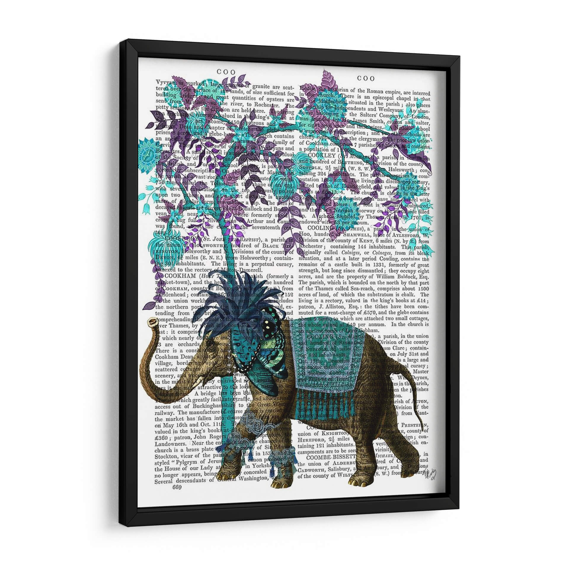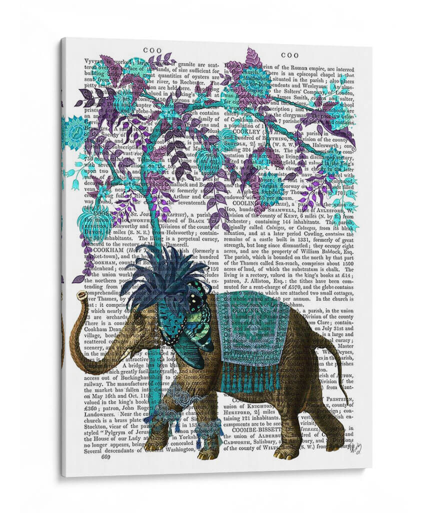 Sumérgete en la majestuosidad de "Niraj Elefante, Árbol Azul" de Fab Funky, una obra de arte digital que transforma un fondo de texto vintage en un lienzo vibrante. Este cuadro decorativo presenta un elefante ricamente adornado, con detalles intrincados en tonos marrones y dorados, realzado por un taparrabos azul turquesa y un adorno en la cabeza adornado con mariposas y flores en el mismo tono. El azul profundo del árbol, con sus hojas y flores delicadas, contrasta maravillosamente con el tono terroso del elefante y el trasfondo sepia del texto antiguo. La composición es fascinante, yuxtaponiendo la fuerza y la presencia del elefante con la delicadeza botánica del árbol, creando una pieza única que evoca una sensación de fantasía y elegancia. Ideal para aquellos que buscan añadir un toque de originalidad y color a su hogar u oficina, este cuadro decorativo es perfecto para salas de estar, estudios o dormitorios, aportando un aire de sofisticación exótica y un punto de conversación intrigante. Descubre la magia de la fusión entre lo antiguo y lo contemporáneo con esta cautivadora pieza de arte mural.