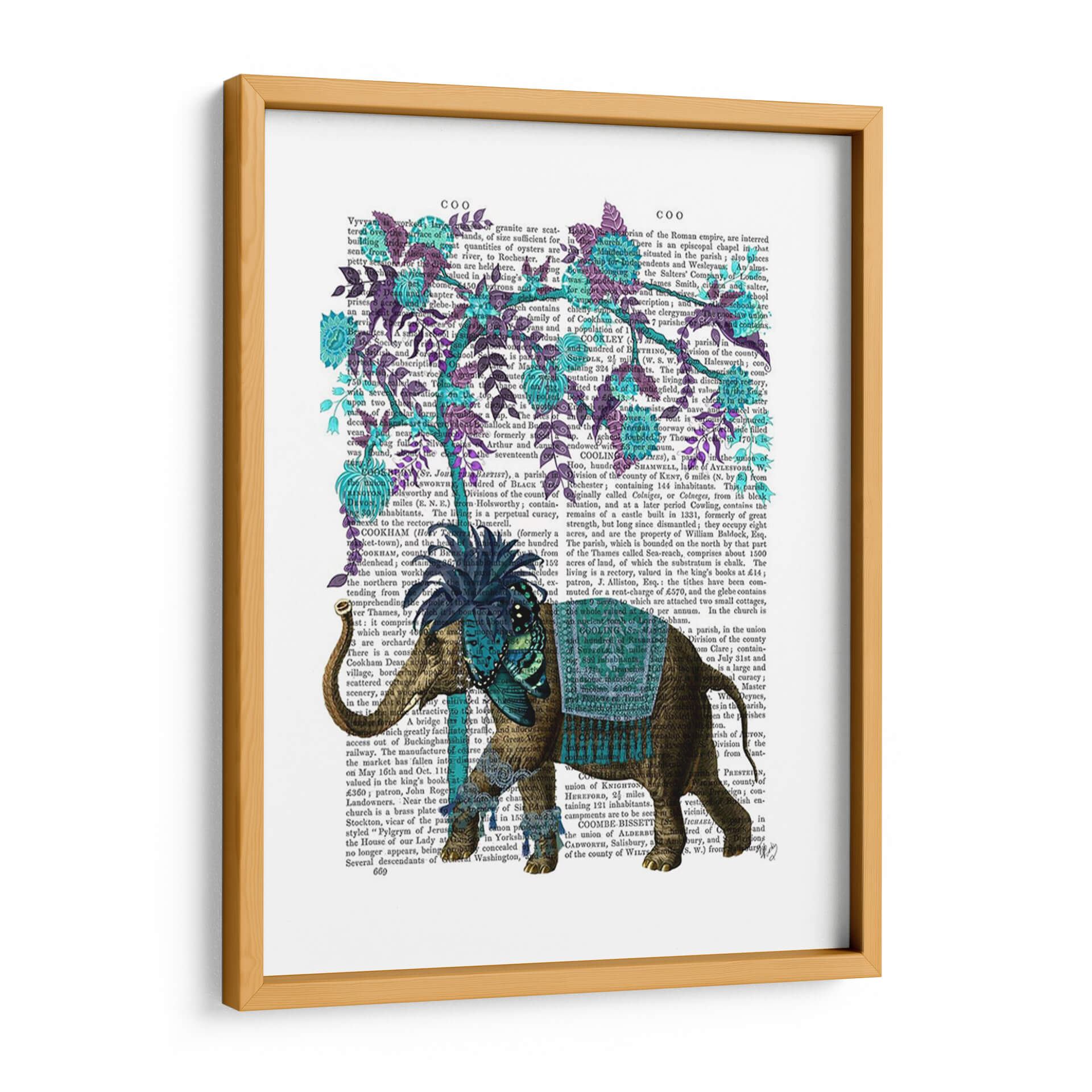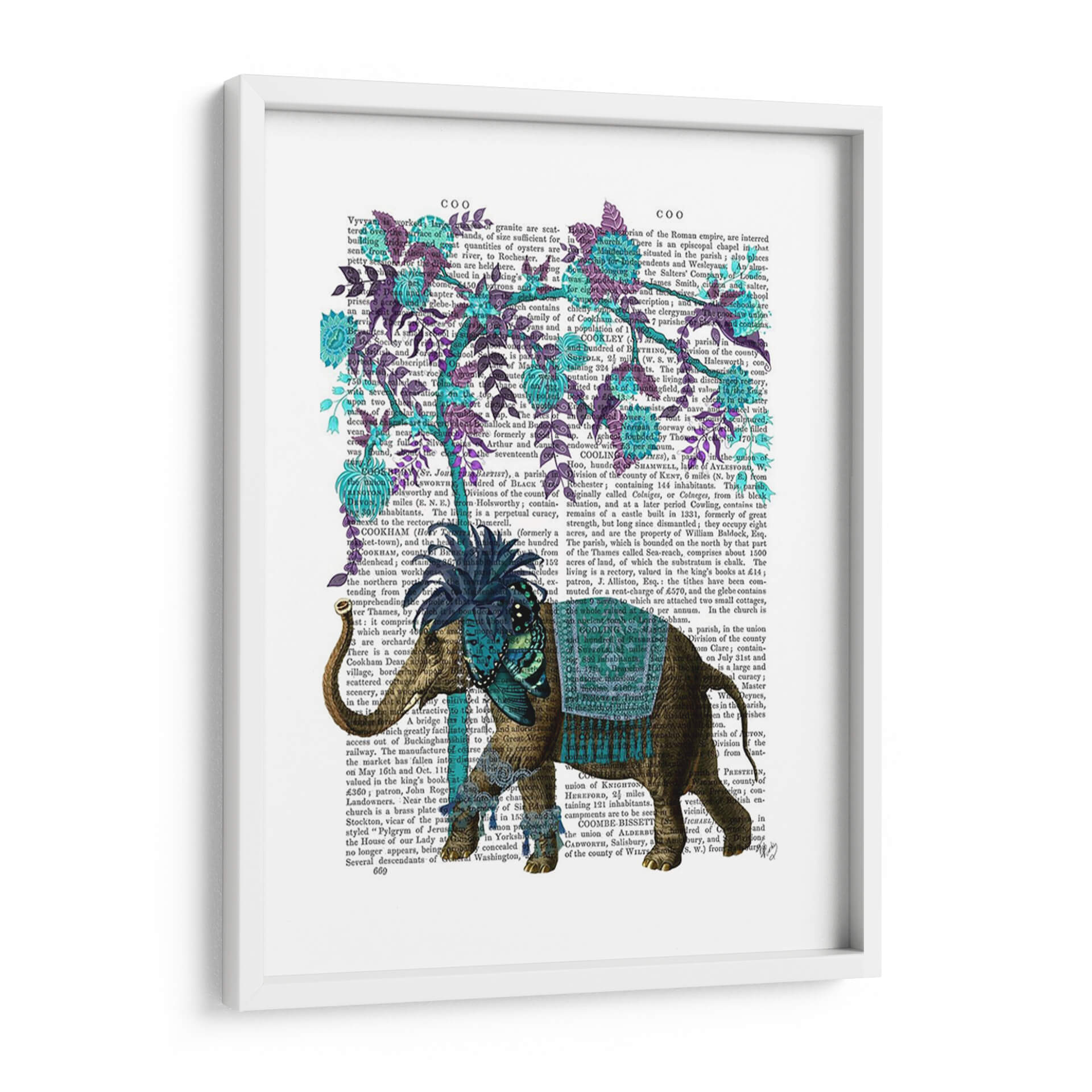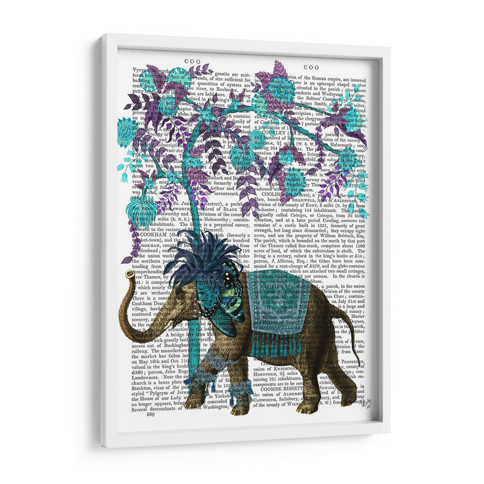 Sumérgete en la majestuosidad de "Niraj Elefante, Árbol Azul" de Fab Funky, una obra de arte digital que transforma un fondo de texto vintage en un lienzo vibrante. Este cuadro decorativo presenta un elefante ricamente adornado, con detalles intrincados en tonos marrones y dorados, realzado por un taparrabos azul turquesa y un adorno en la cabeza adornado con mariposas y flores en el mismo tono. El azul profundo del árbol, con sus hojas y flores delicadas, contrasta maravillosamente con el tono terroso del elefante y el trasfondo sepia del texto antiguo. La composición es fascinante, yuxtaponiendo la fuerza y la presencia del elefante con la delicadeza botánica del árbol, creando una pieza única que evoca una sensación de fantasía y elegancia. Ideal para aquellos que buscan añadir un toque de originalidad y color a su hogar u oficina, este cuadro decorativo es perfecto para salas de estar, estudios o dormitorios, aportando un aire de sofisticación exótica y un punto de conversación intrigante. Descubre la magia de la fusión entre lo antiguo y lo contemporáneo con esta cautivadora pieza de arte mural.