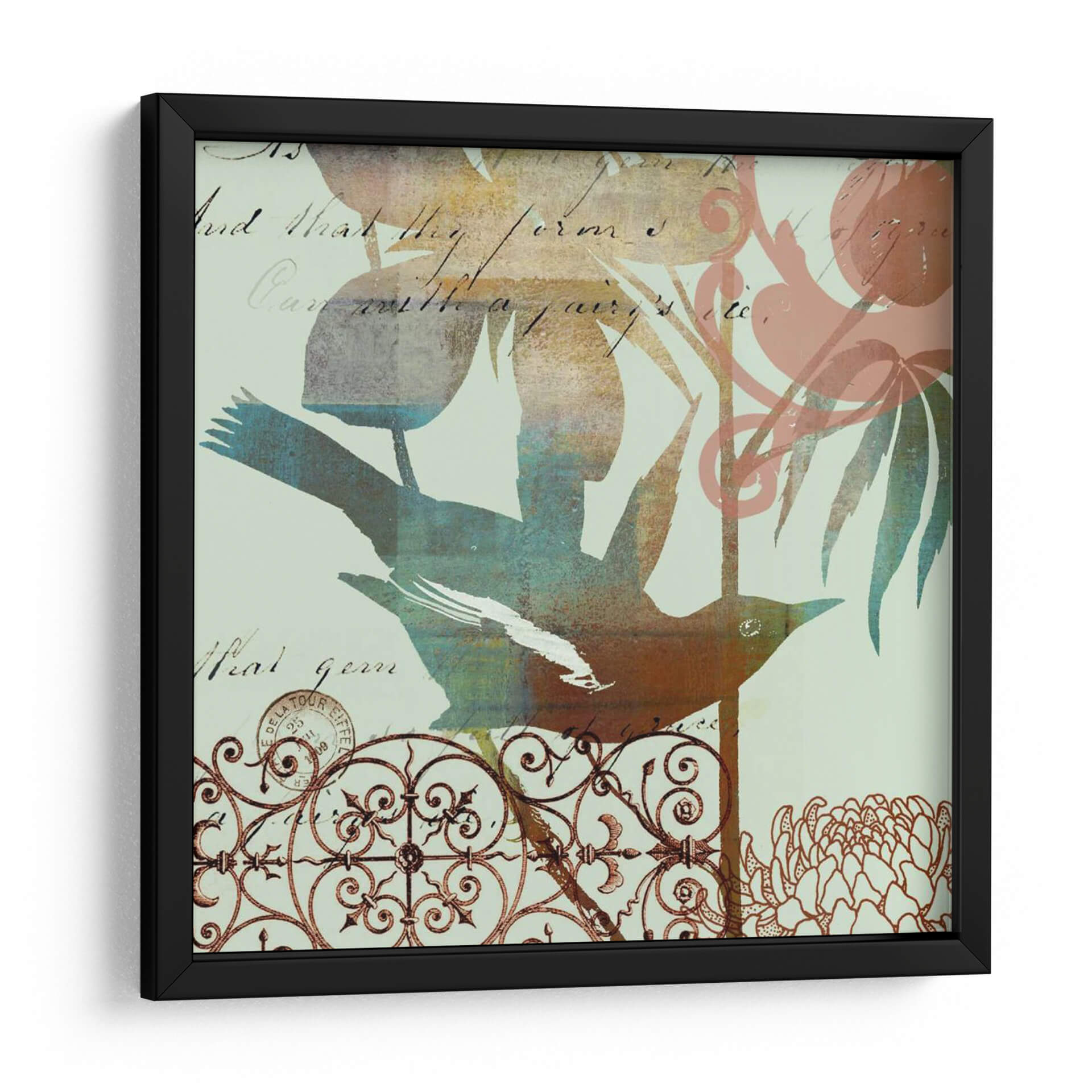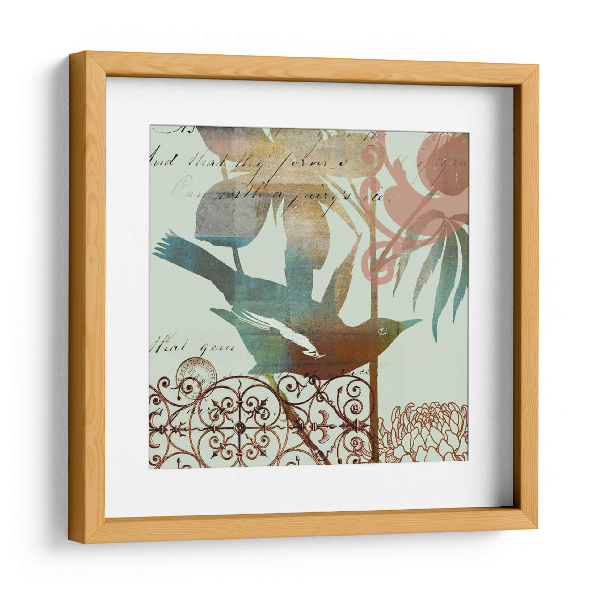 Captura la imaginación con "Pájaro Fantasioso I", una obra de arte que fusiona lo etéreo con lo terrenal. Esta pieza presenta un pájaro estilizado en tonos tierra y azules vibrantes, posado delicadamente sobre una intrincada reja ornamental que evoca un jardín secreto. El fondo, sutilmente texturizado con fragmentos de escritura antigua, añade una capa de misterio y nostalgia, invitando a la contemplación. Las hojas y flores de contorno suave, representadas en tonos pastel y terrosos, complementan la figura central, creando una composición equilibrada y armoniosa. El estilo artístico, una mezcla de collage digital y elementos gráficos, resulta en una estética contemporánea con un toque vintage. "Pájaro Fantasioso I" es ideal para infundir serenidad y un aire de cuento de hadas en cualquier espacio, desde una sala de estar acogedora hasta un estudio tranquilo o un dormitorio. Este cuadro decorativo es perfecto para quienes buscan añadir un elemento de ensueño y sofisticación a su decoración, celebrando la belleza sutil de la naturaleza y el paso del tiempo.