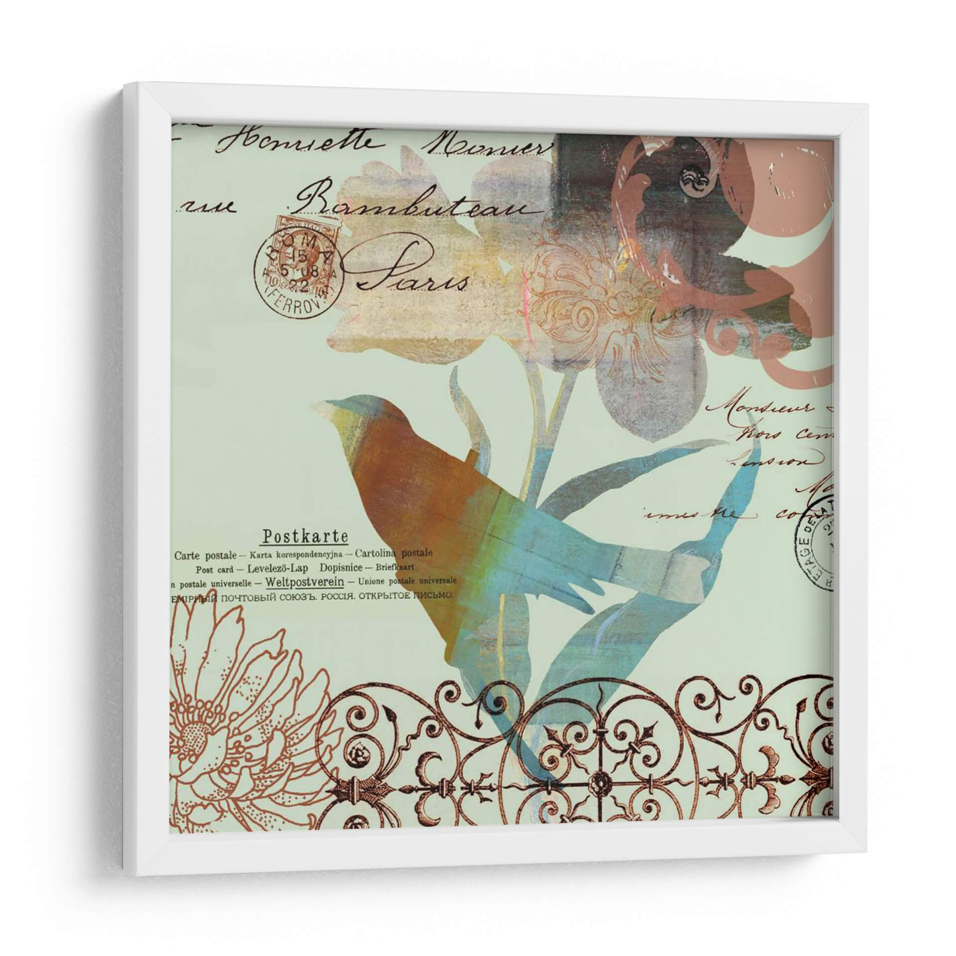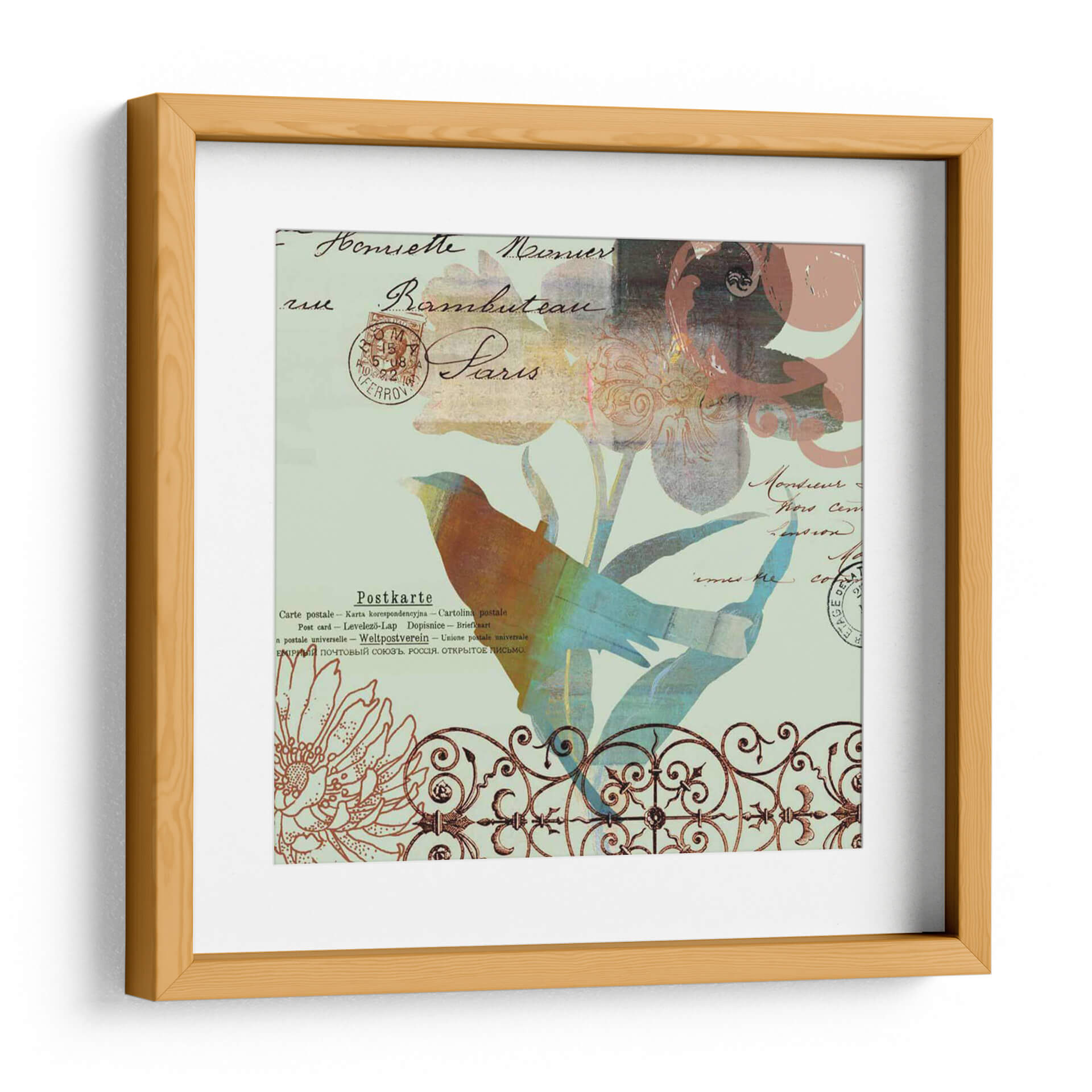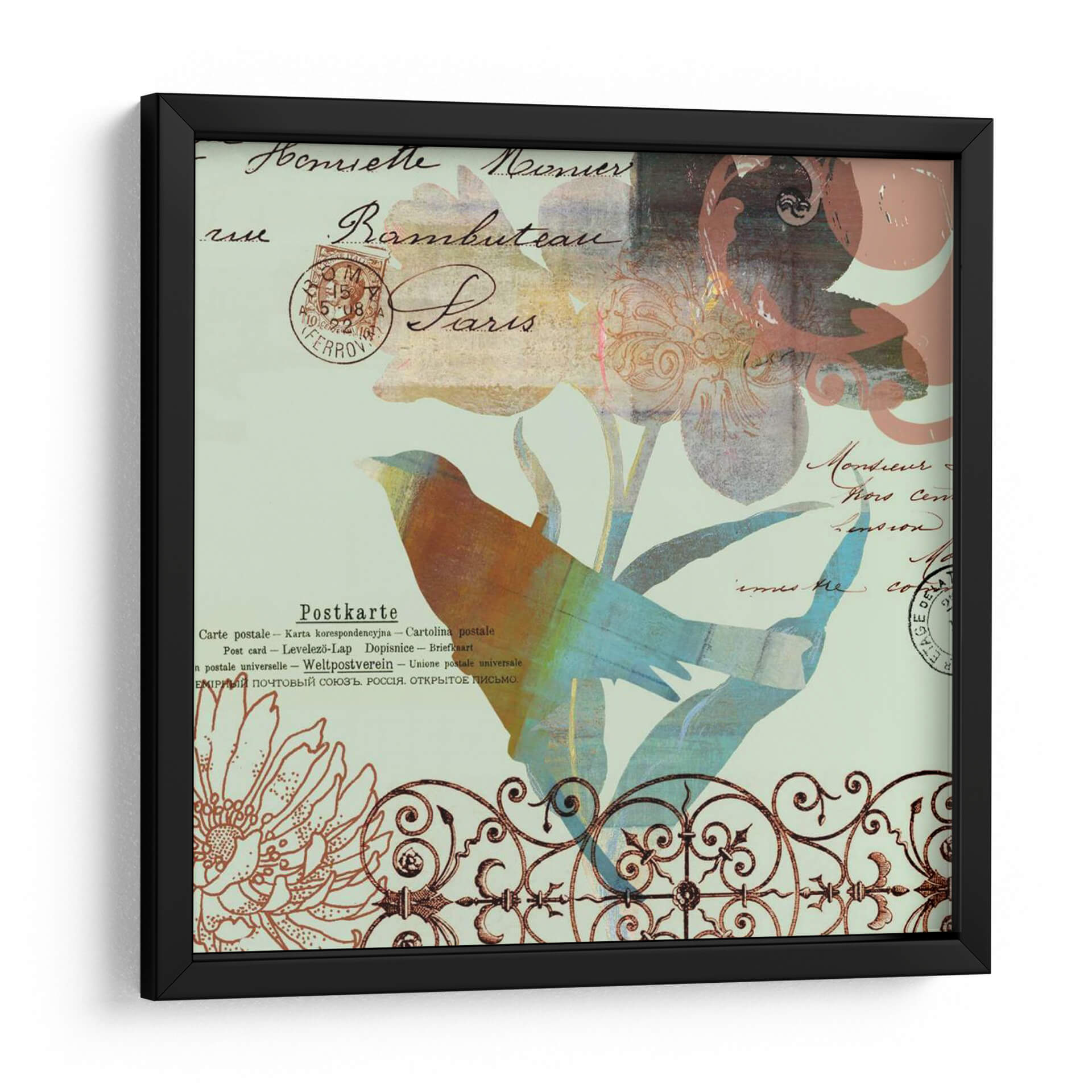 Descubre la encantadora obra de arte "Pájaro Fantasioso II" de W. Green-Aldridge, una pieza que evoca la nostalgia y la belleza de las cartas antiguas y la naturaleza. Este cuadro decorativo fusiona elementos surrealistas con un toque vintage, presentando un pájaro vibrante en tonos azules y anaranjados, posado sobre un fondo texturizado que simula postales y caligrafía francesa. Los delicados detalles florales y los sellos postales añaden capas de historia y sofisticación, creando una atmósfera etérea y soñadora. Los colores suaves, dominados por el aguamarina, el coral y toques de sepia, aportan una sensación de calma y elegancia, perfectos para cualquier espacio que busque un acento artístico único. Ideal para salones, dormitorios o estudios, este lienzo transformará tu pared en una ventana a un mundo de fantasía y recuerdos. La composición equilibrada y el estilo distintivo de Green-Aldridge hacen de "Pájaro Fantasioso II" una adición memorable a tu colección de arte de pared contemporáneo, invitando a la contemplación y al diálogo.