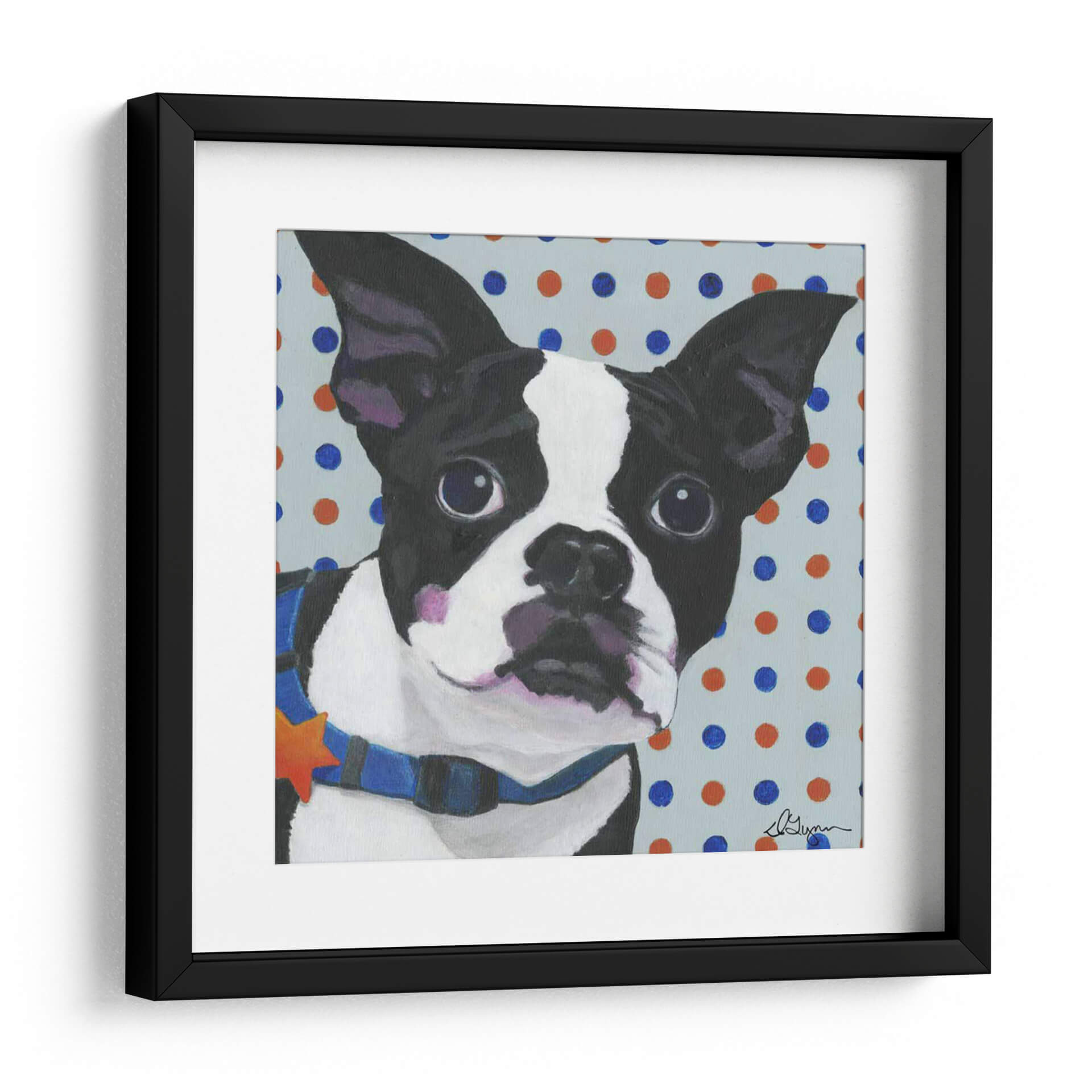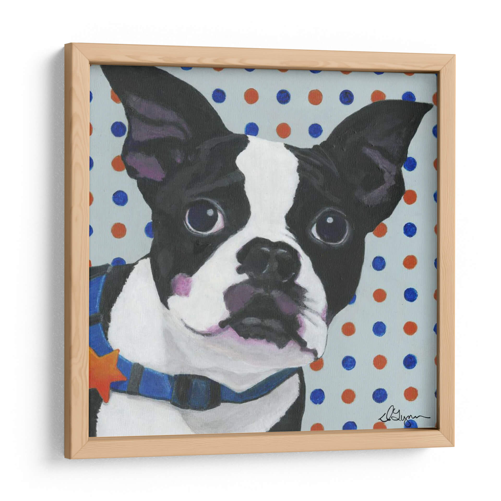 Inunda tu espacio con la encantadora personalidad de este Boston Terrier en un cuadro decorativo de Dlynn Roll. La obra captura la esencia juguetona y leal de la raza con un estilo vibrante y audaz. El primer plano del carismático perro, con sus grandes ojos expresivos y su collar azul adornado con una estrella naranja, capta inmediatamente la atención. El fondo, salpicado de lunares en tonos azul y naranja sobre un suave gris azulado, añade un toque de alegría y modernidad a la composición. Esta pieza es ideal para amantes de los perros y para quienes buscan añadir un punto de interés visual y calidez a su hogar u oficina. El trazo enérgico y la paleta de colores contrastantes crean una atmósfera animada pero acogedora, perfecta para salas de estar, estudios o habitaciones infantiles. Este cuadro decorativo, titulado "Perros Dlynns - Diesel", es más que una simple imagen; es una celebración del vínculo entre humanos y mascotas, y una forma de infundir carácter y estilo en cualquier ambiente. Su diseño único lo convierte en una pieza de conversación que sin duda alegrará cualquier rincón.