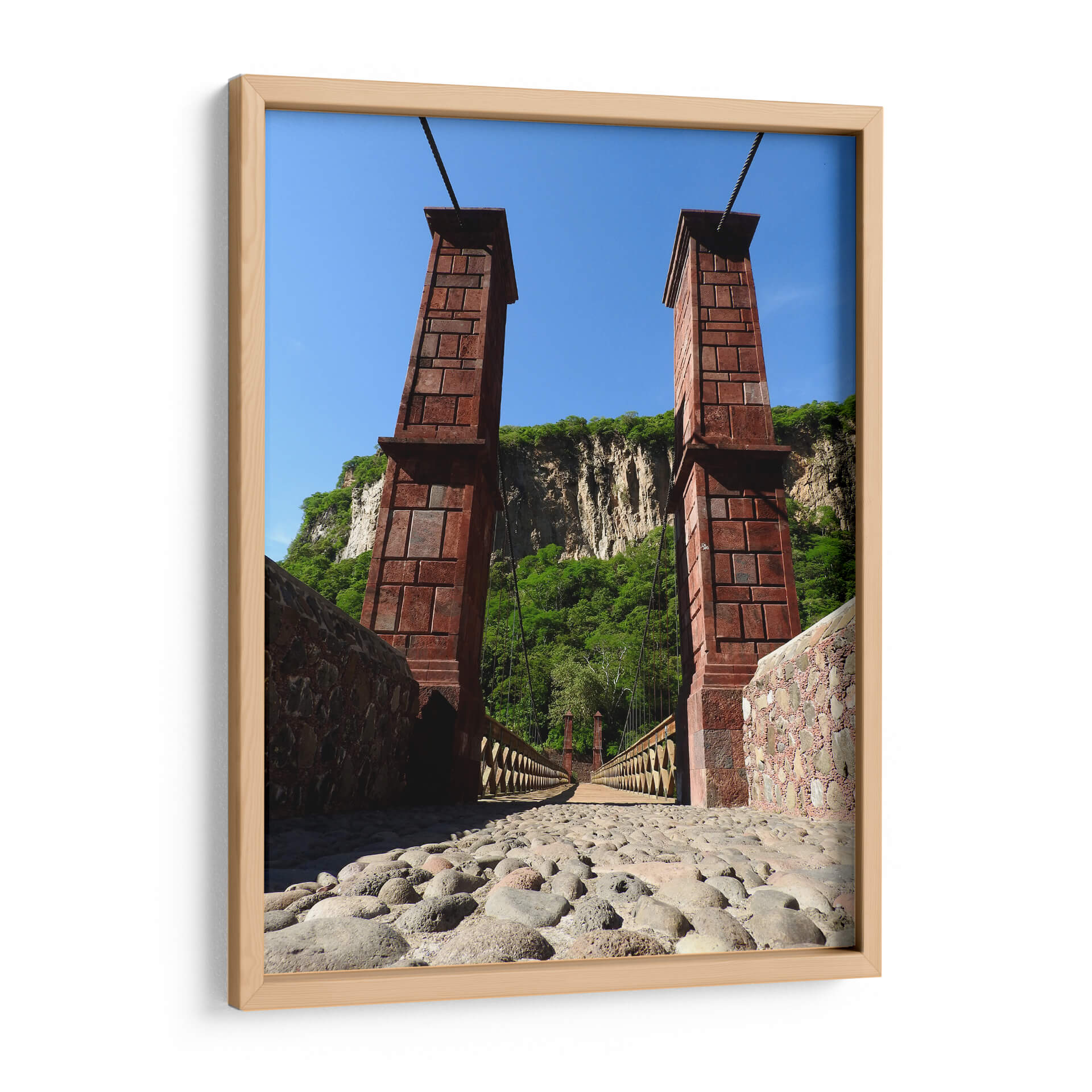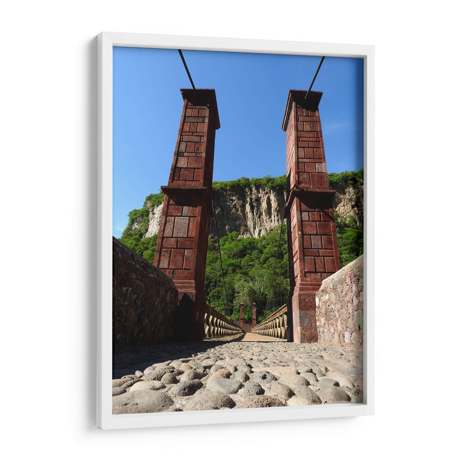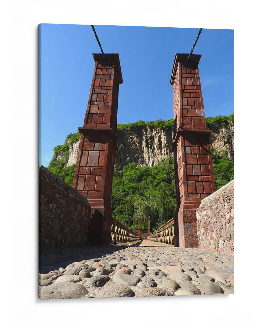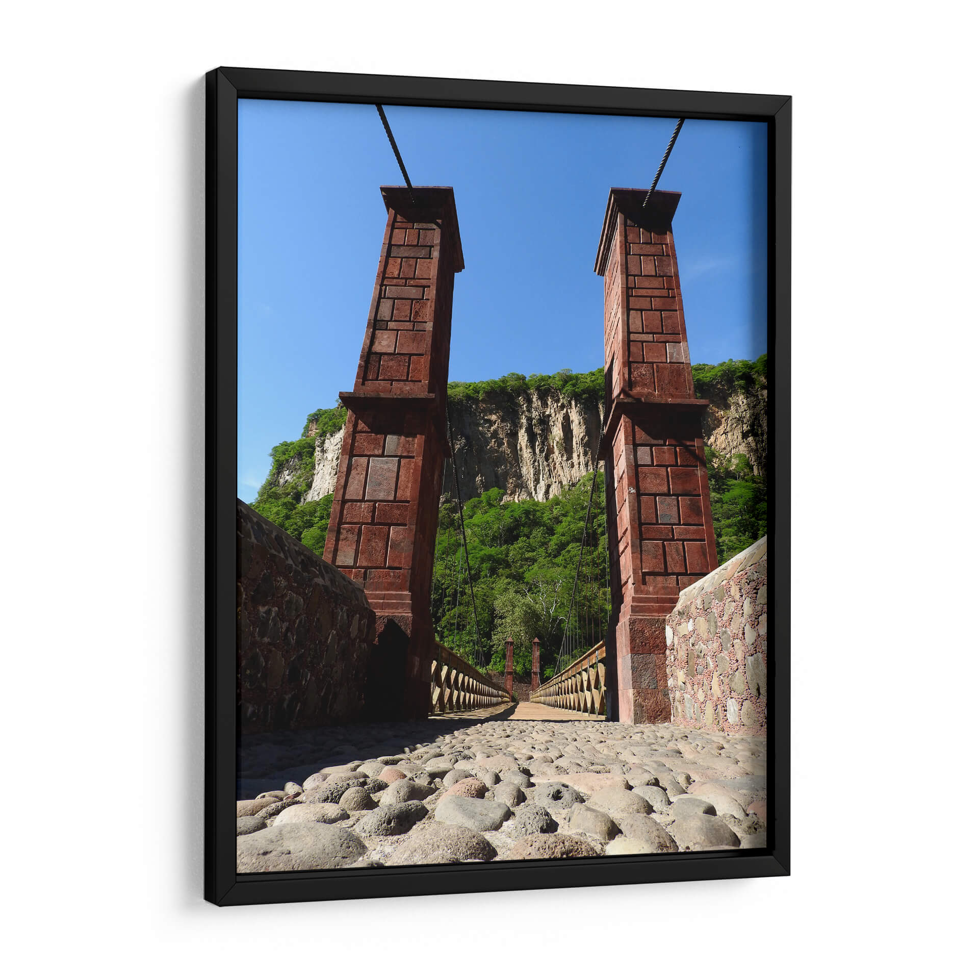 Sumérgete en la majestuosidad de 'Puente', una obra de arte de Hugo Segura que captura la esencia de la aventura y la conexión. Este cuadro decorativo te transporta a un paisaje imponente donde la arquitectura rústica de un puente de suspensión se alza contra un cañón verde vibrante bajo un cielo azul radiante. La perspectiva baja y el camino empedrado invitan a un viaje visual, invitando al espectador a cruzar hacia lo desconocido. Los pilares de ladrillo y piedra, con sus tonos cálidos y terrosos, contrastan maravillosamente con el verdor exuberante de la vegetación que rodea el cañón y el azul intenso del firmamento. La composición, que evoca una sensación de profundidad y escala, es perfecta para añadir un toque de grandeza y exploración a cualquier espacio. Ideal para salones, estudios o recibidores, este lienzo es una invitación a la contemplación y al descubrimiento, añadiendo carácter y una atmósfera de serenidad aventurera a tu hogar u oficina. Descubre la belleza de la ingeniería humana en armonía con la naturaleza y deja que este cuadro decorativo sea el punto focal de tu decoración.
