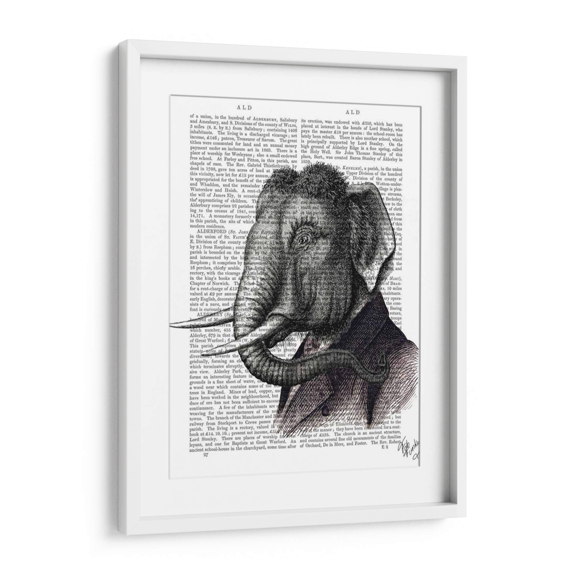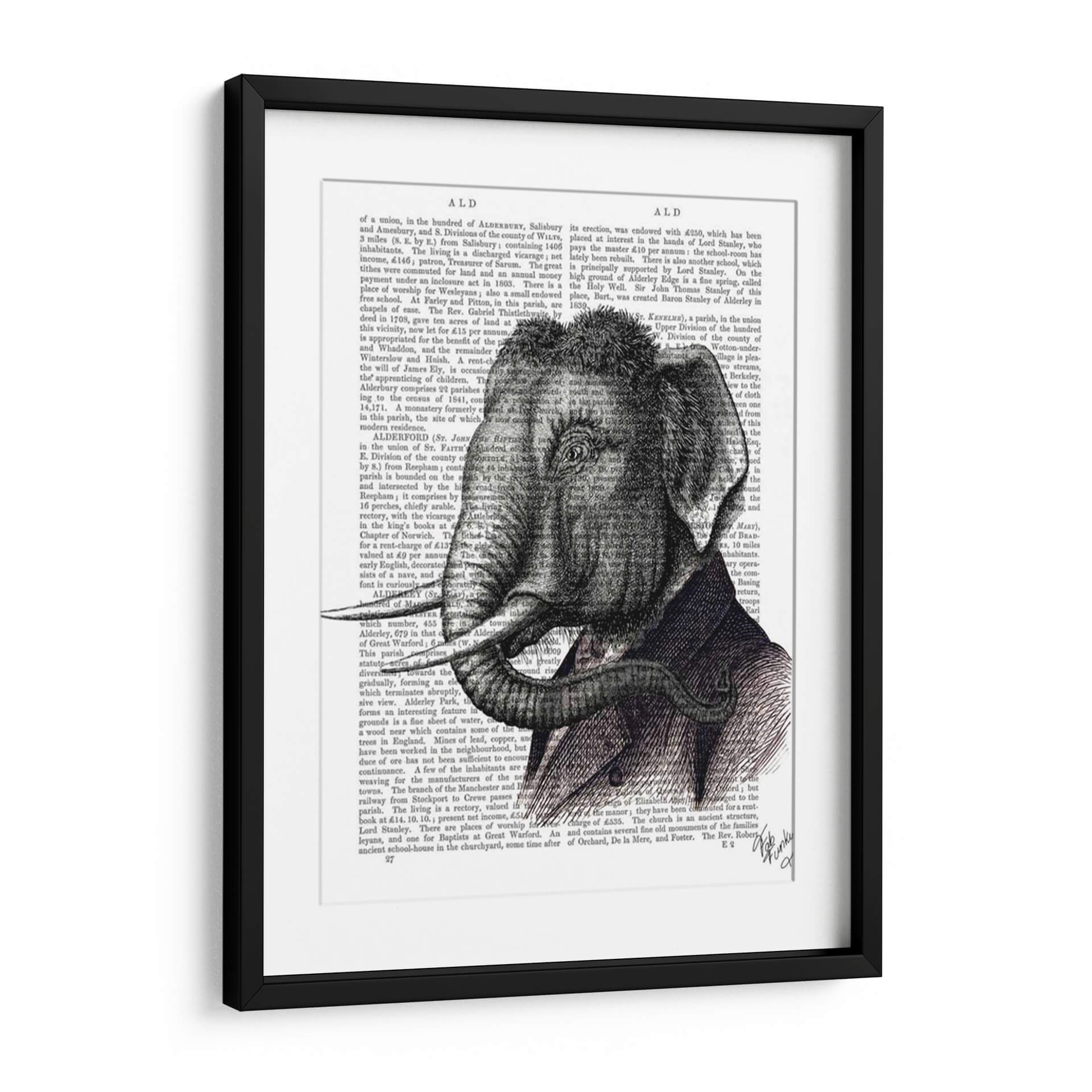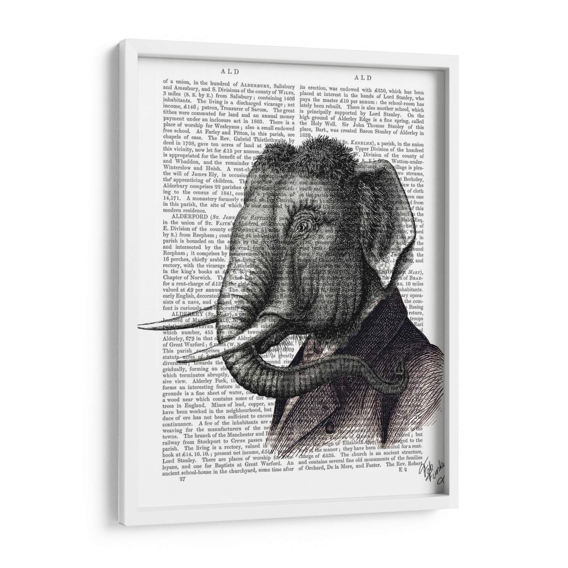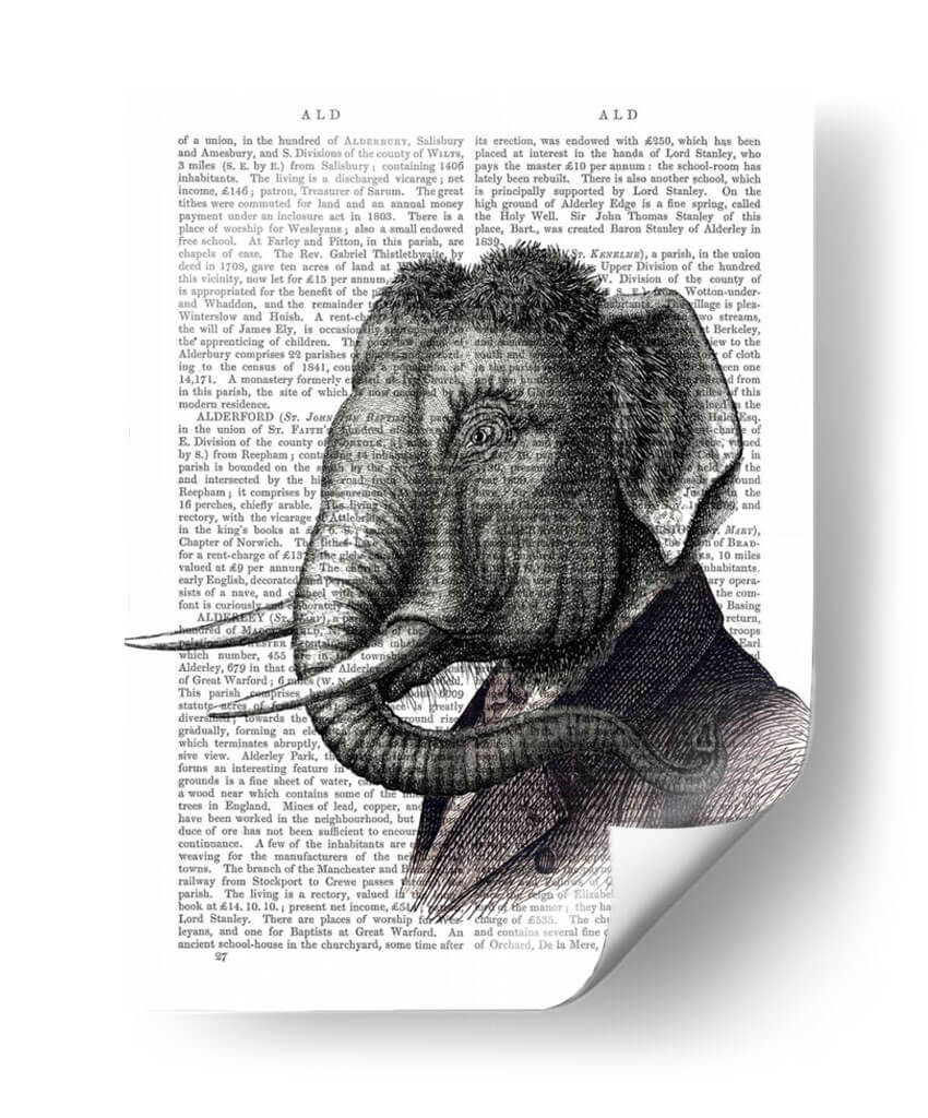 Este cautivador cuadro decorativo presenta un detallado retrato de elefante, una obra de arte que combina lo clásico con lo peculiar. La pieza destaca por su intrincada ilustración en blanco y negro, que evoca una sensación de nobleza y sabiduría ancestral. El elefante, representado con majestuosidad, viste un elegante traje, añadiendo un toque de surrealismo y humor a la composición. El fondo, compuesto por texto antiguo, aporta una textura visual interesante y una profundidad histórica, sugiriendo una conexión con el conocimiento y la narración. Los tonos grises y negros predominantes crean una atmósfera sofisticada y seria, pero el detalle del traje y la mirada del elefante introducen un elemento de calidez y carácter. Este cuadro es perfecto para añadir un punto de interés distintivo a salones modernos, estudios o bibliotecas, y resonará especialmente con aquellos que aprecian el arte figurativo con un giro contemporáneo. Su diseño versátil se adapta a una variedad de estilos decorativos, desde el ecléctico hasta el más sobrio, invitando a la contemplación y a la conversación.