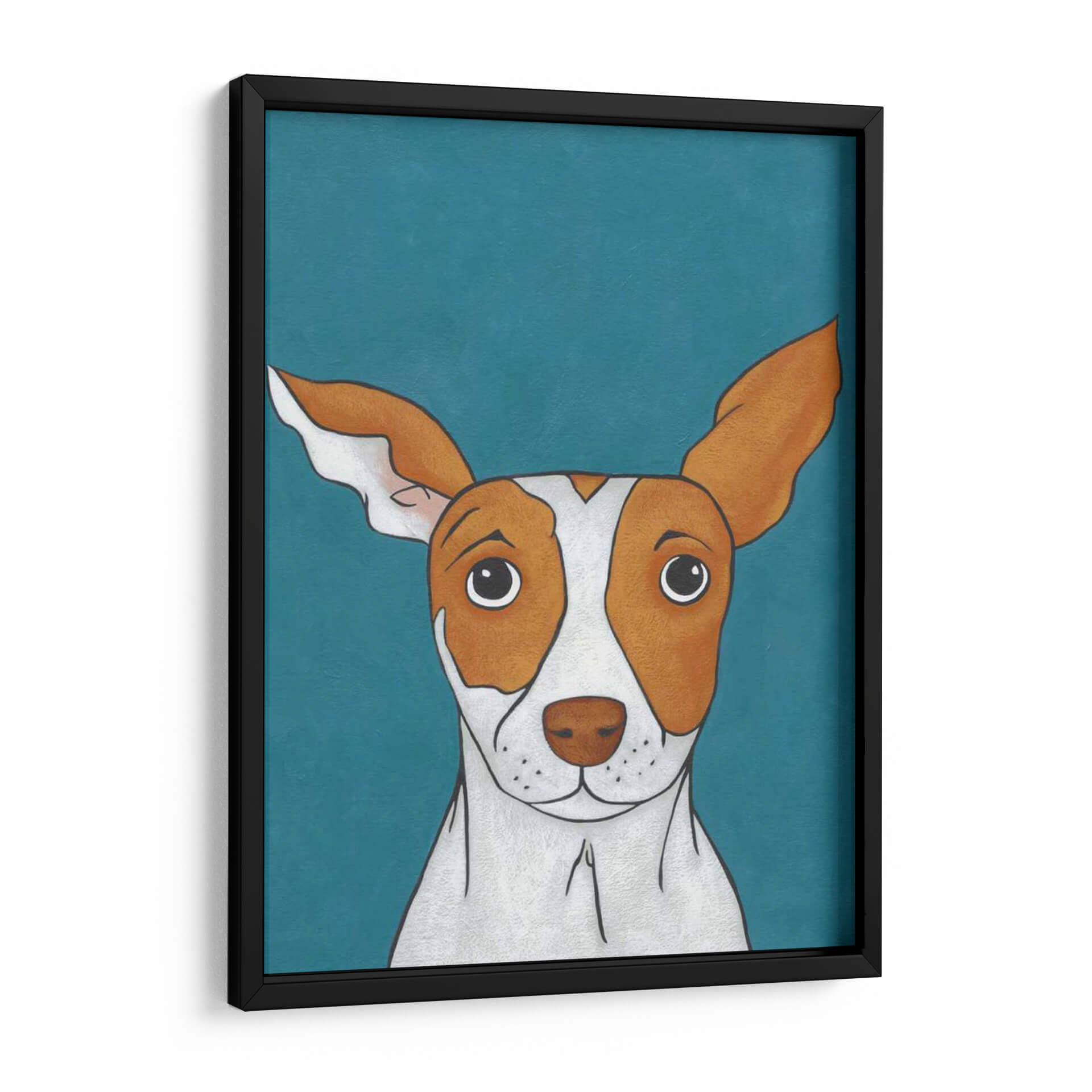 Este cautivador cuadro decorativo presenta un retrato encantador de un perro, capturando la esencia de la lealtad y la compañía con un estilo artístico distintivo. La obra se centra en el rostro expresivo del animal, destacando sus grandes ojos curiosos y sus orejas atentas, todo ello sobre un vibrante fondo azul verdoso que realza los tonos cálidos del pelaje del perro, compuestos por blancos nítidos y marrones terrosos. La composición, con un enfoque cercano, invita a una conexión íntima con la mascota retratada, transmitiendo una sensación de calidez, ternura y un toque de picardía juguetona. El estilo, que combina elementos de ilustración con una aplicación de pintura texturizada, confiere a la pieza una profundidad y un carácter únicos, haciéndola ideal para cualquier amante de los animales o para quienes buscan añadir un punto de interés amigable y lleno de personalidad a su hogar u oficina. Este cuadro es una pieza versátil que puede complementar decoraciones modernas, rústicas o eclécticas, aportando vida y una sonrisa a cualquier estancia. Su diseño se adapta perfectamente a salas de estar, dormitorios, estudios o incluso habitaciones infantiles, convirtiéndose en un foco de conversación y alegría.
