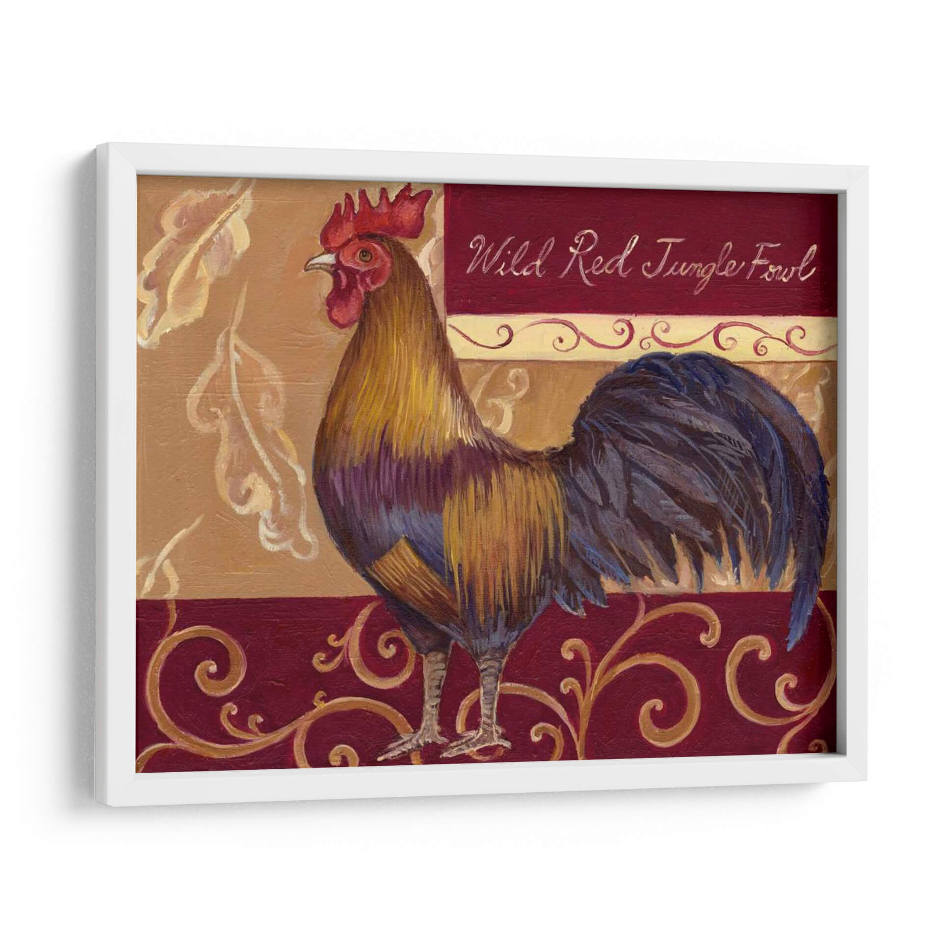 Adéntrate en la elegancia rústica con este cautivador cuadro decorativo de gallos, "Roosters Rústicos II" de Theresa Kasun. Esta obra de arte captura la majestuosidad de un gallo de jungla rojo salvaje, representado con pinceladas detalladas y una paleta de colores cálida y terrosa. Los tonos dorados, marrones y rojos profundos se combinan a la perfección, creando una atmósfera acogedora y sofisticada que transformará cualquier espacio. Los intrincados detalles del plumaje y la postura orgullosa del gallo aportan un toque de vida y carácter a la composición. Los elementos decorativos en forma de espirales y hojas estilizadas en tonos dorados y burdeos añaden una dimensión de elegancia clásica, complementando la figura central de forma armoniosa. Ideal para añadir un punto focal vibrante y un toque de la naturaleza al hogar, esta pieza es perfecta para salas de estar, comedores o incluso cocinas rústicas o de estilo granja. Su diseño atemporal y su ejecución artística la convierten en una adición excepcional a cualquier colección de arte de pared, invitando a la conversación y admiración. Transforma tu hogar con la belleza serena y el encanto de esta magnífica representación aviar, un verdadero tesoro para los amantes del arte decorativo.
