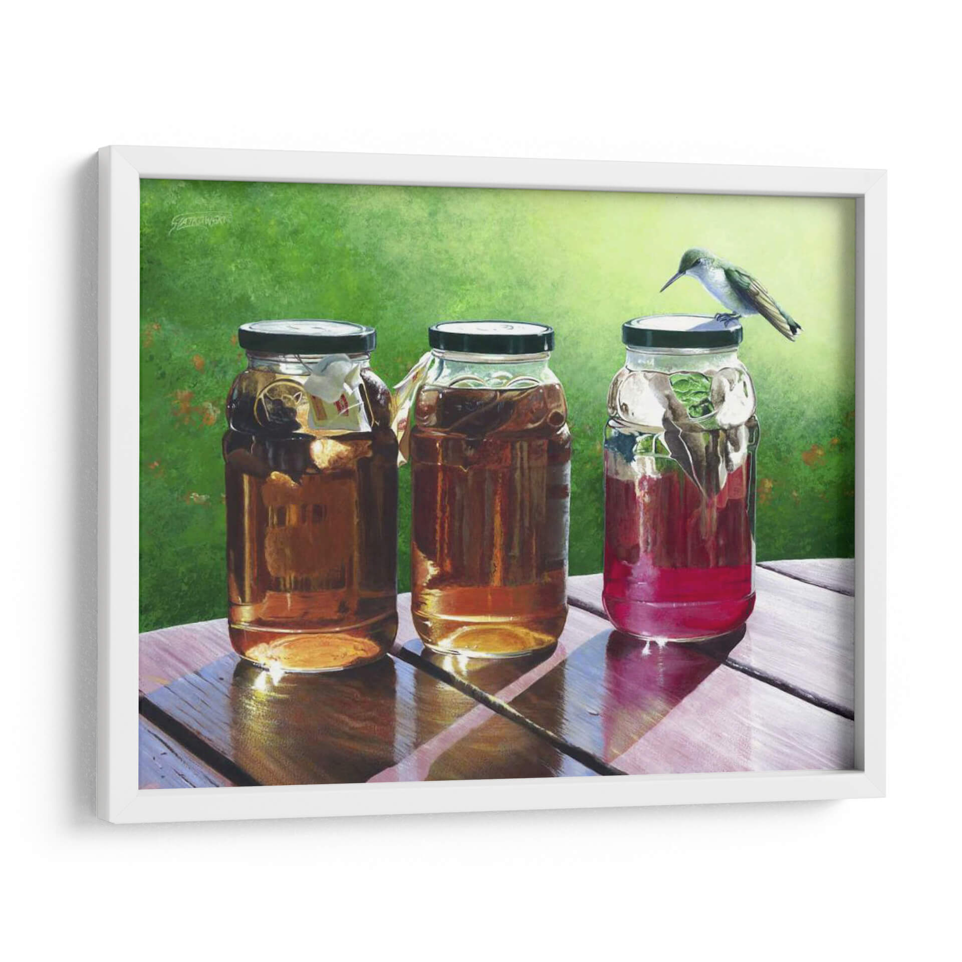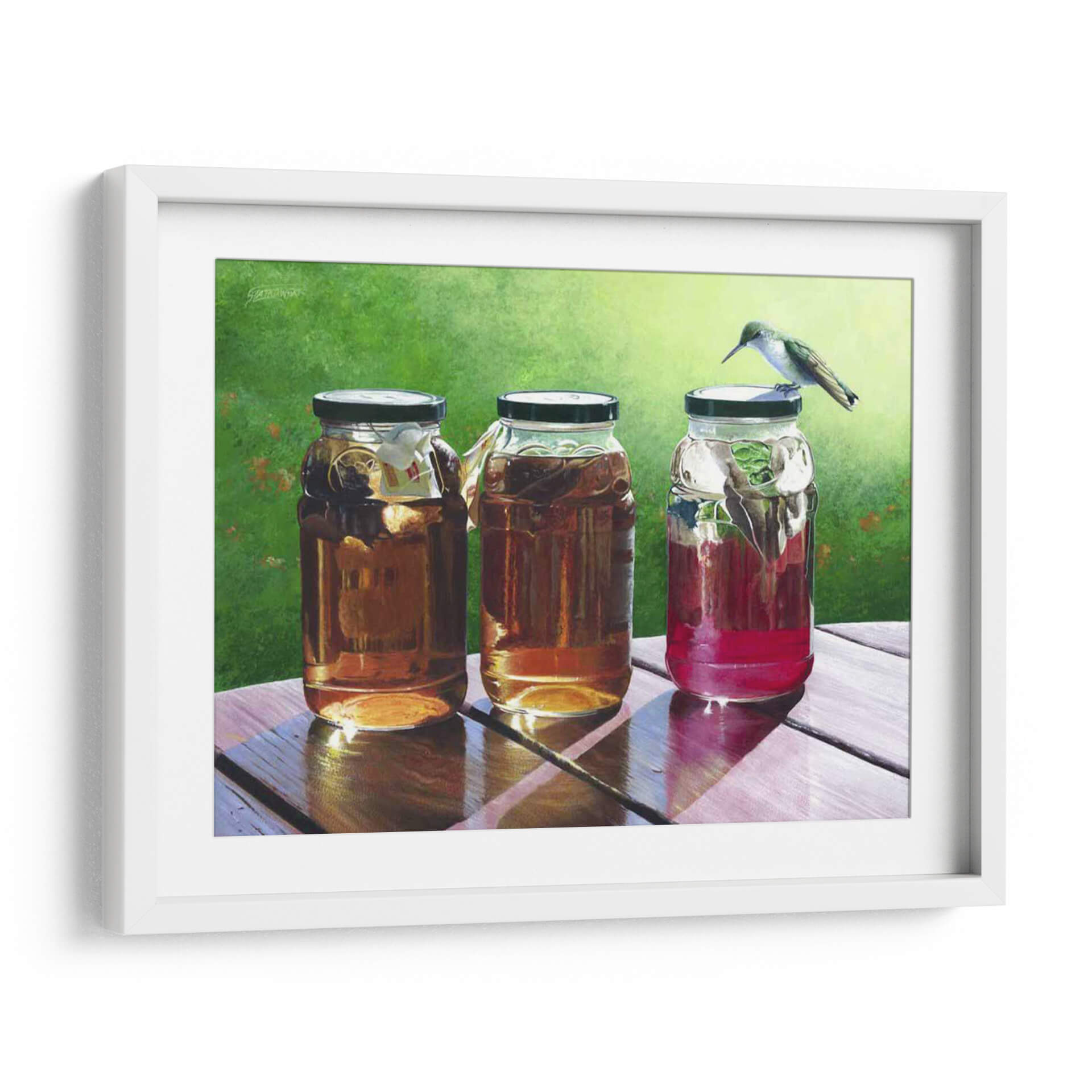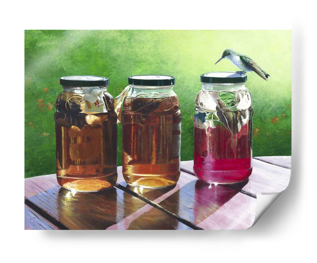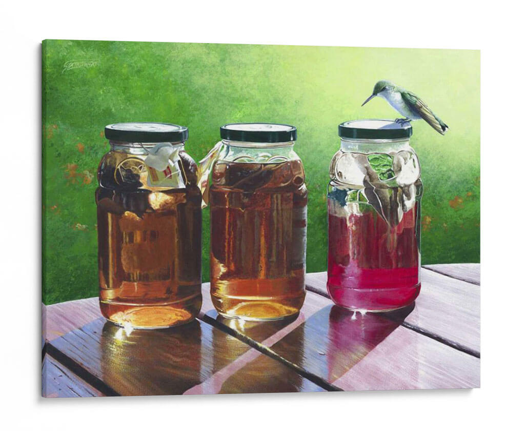 Sumérgete en la frescura y la serenidad de "Té de Sol", una cautivadora obra de arte de Fred Szatkowski. Este cuadro decorativo captura un momento idílico al aire libre, presentando tres frascos llenos de líquidos ámbar y rojizos, bañados por la cálida luz del sol. La delicadeza de un colibrí posado sobre uno de los frascos añade un toque de vida y movimiento a la escena, creando una atmósfera de paz y contemplación. Los colores vibrantes, desde el verde exuberante del fondo hasta los tonos cálidos de las bebidas, invitan a la relajación y a disfrutar de los pequeños placeres de la vida. La composición realista y detallada, con un juego de luces y sombras que realza las texturas de la madera y el cristal, convierte a esta pieza en un punto focal perfecto para cualquier hogar u oficina. Ideal para espacios que buscan transmitir calma, naturaleza y un toque de encanto rústico. "Té de Sol" es más que una simple decoración; es una invitación a pausar y apreciar la belleza del instante.
