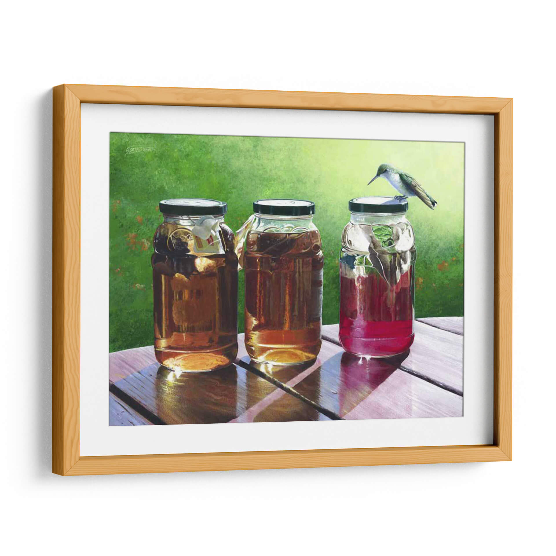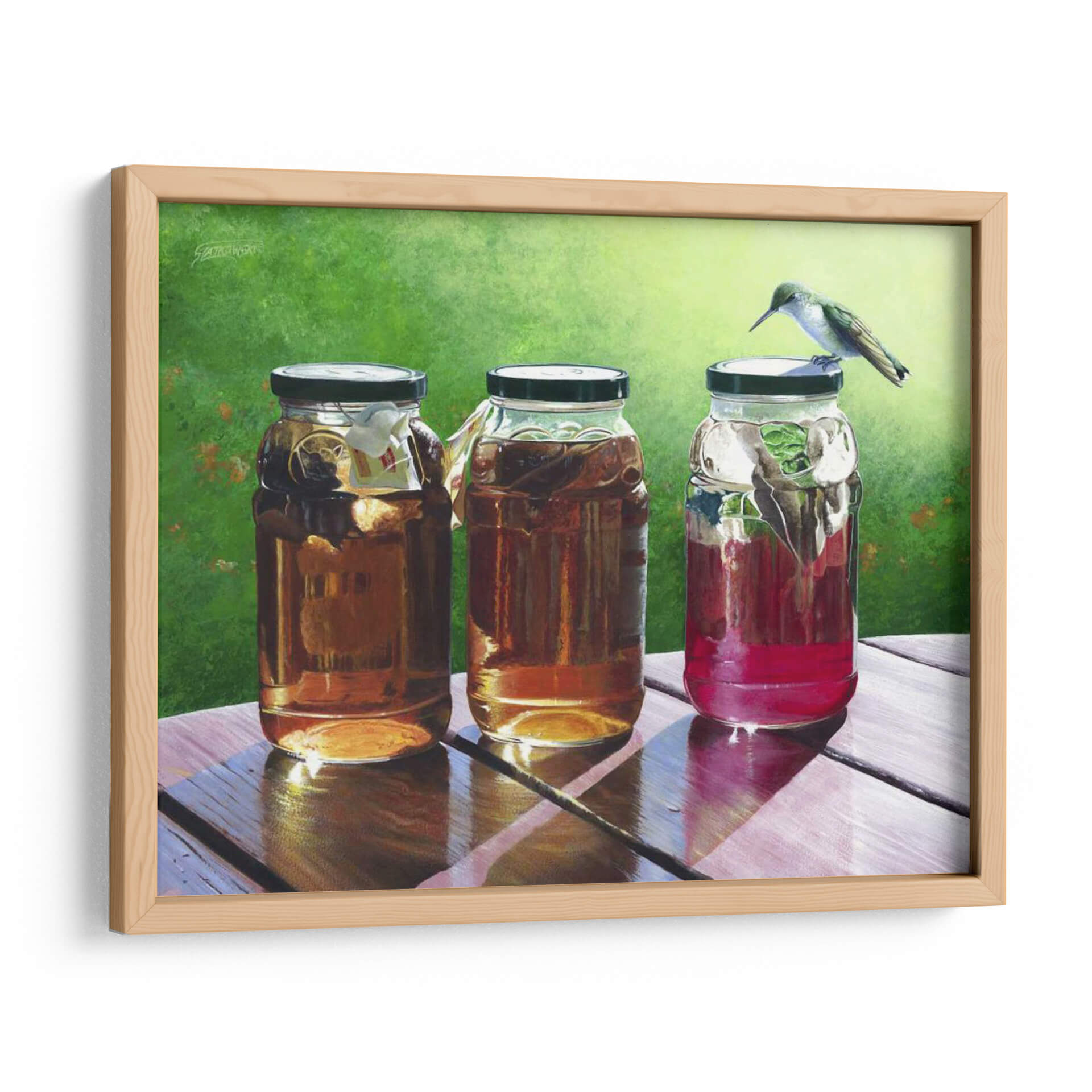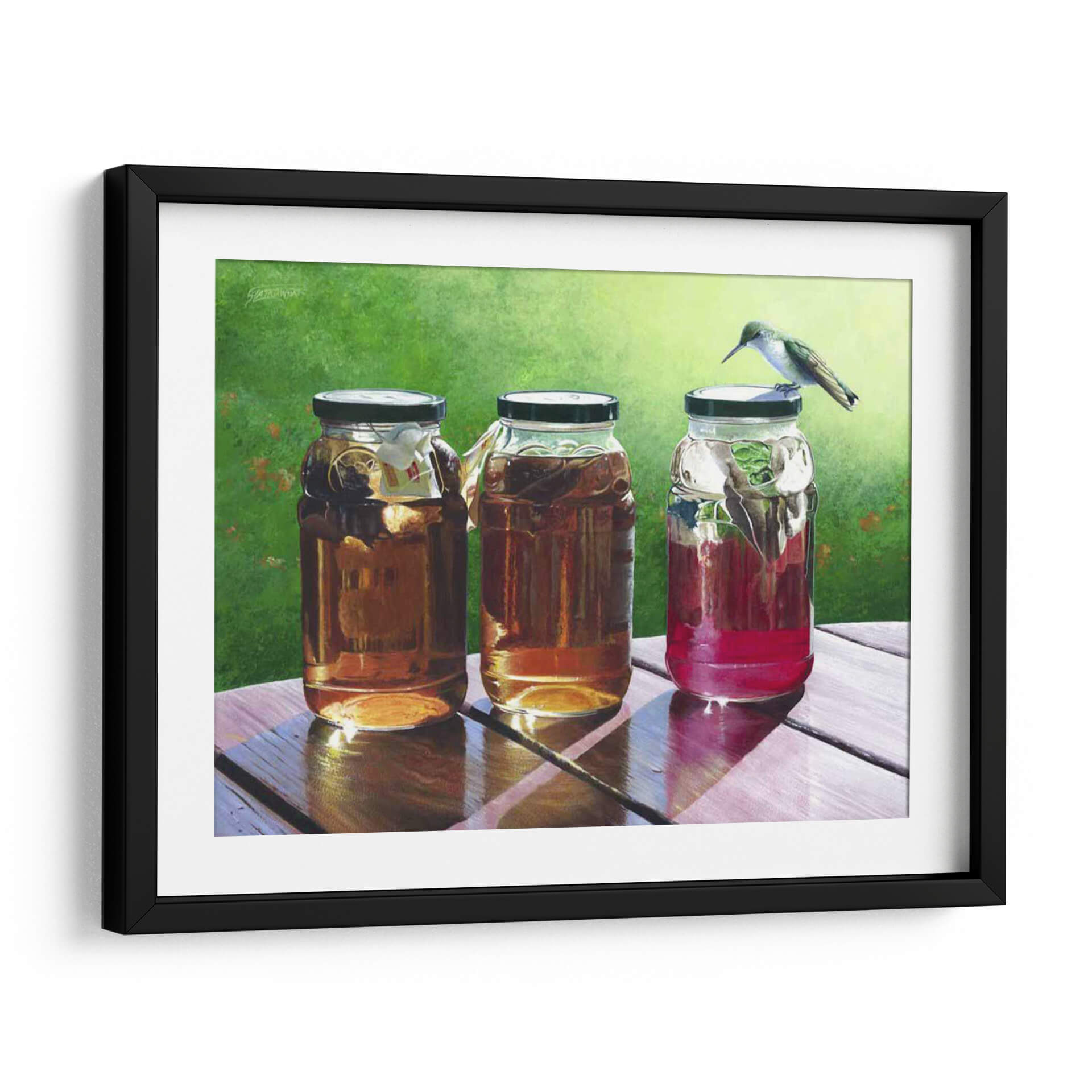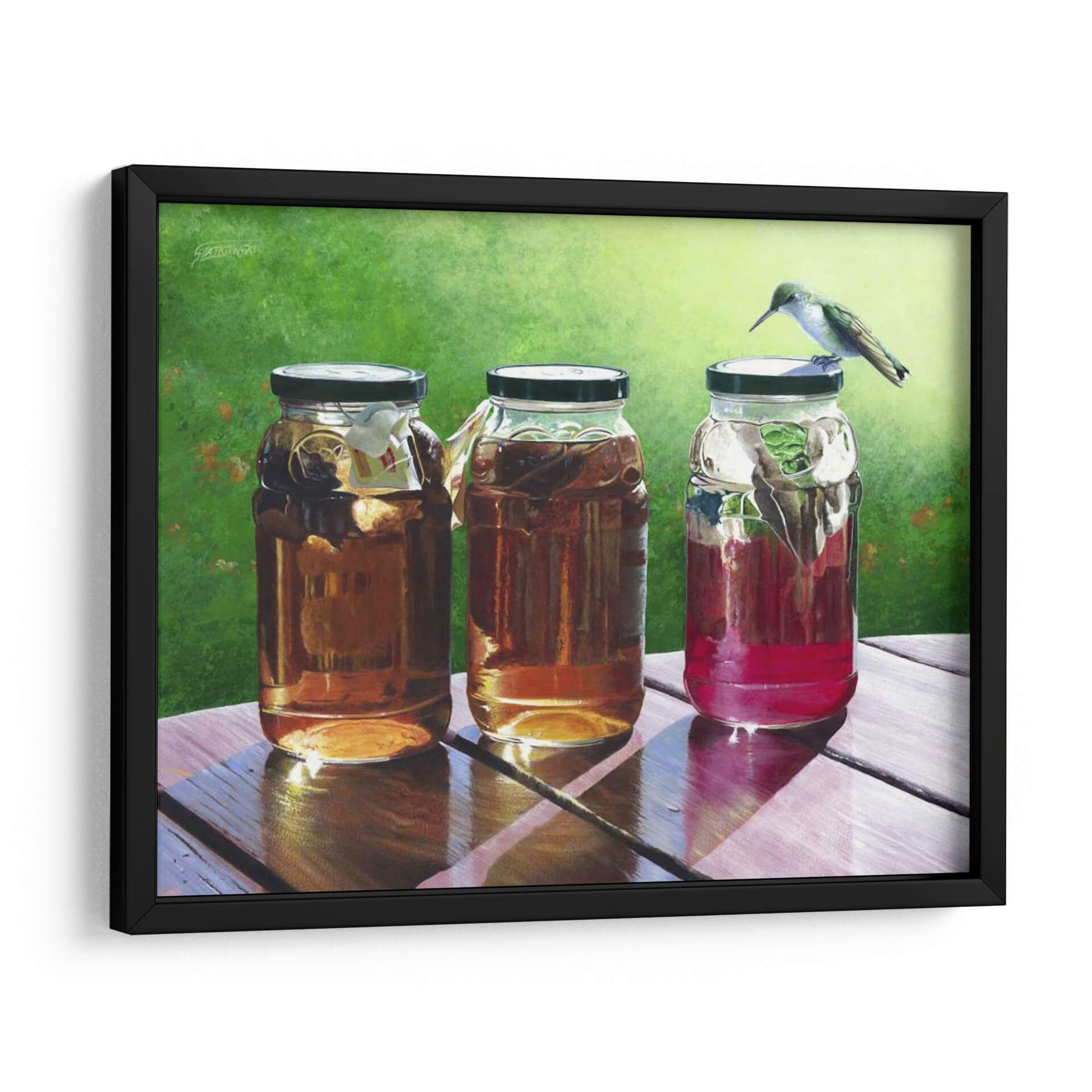 Sumérgete en la frescura y la serenidad de "Té de Sol", una cautivadora obra de arte de Fred Szatkowski. Este cuadro decorativo captura un momento idílico al aire libre, presentando tres frascos llenos de líquidos ámbar y rojizos, bañados por la cálida luz del sol. La delicadeza de un colibrí posado sobre uno de los frascos añade un toque de vida y movimiento a la escena, creando una atmósfera de paz y contemplación. Los colores vibrantes, desde el verde exuberante del fondo hasta los tonos cálidos de las bebidas, invitan a la relajación y a disfrutar de los pequeños placeres de la vida. La composición realista y detallada, con un juego de luces y sombras que realza las texturas de la madera y el cristal, convierte a esta pieza en un punto focal perfecto para cualquier hogar u oficina. Ideal para espacios que buscan transmitir calma, naturaleza y un toque de encanto rústico. "Té de Sol" es más que una simple decoración; es una invitación a pausar y apreciar la belleza del instante.