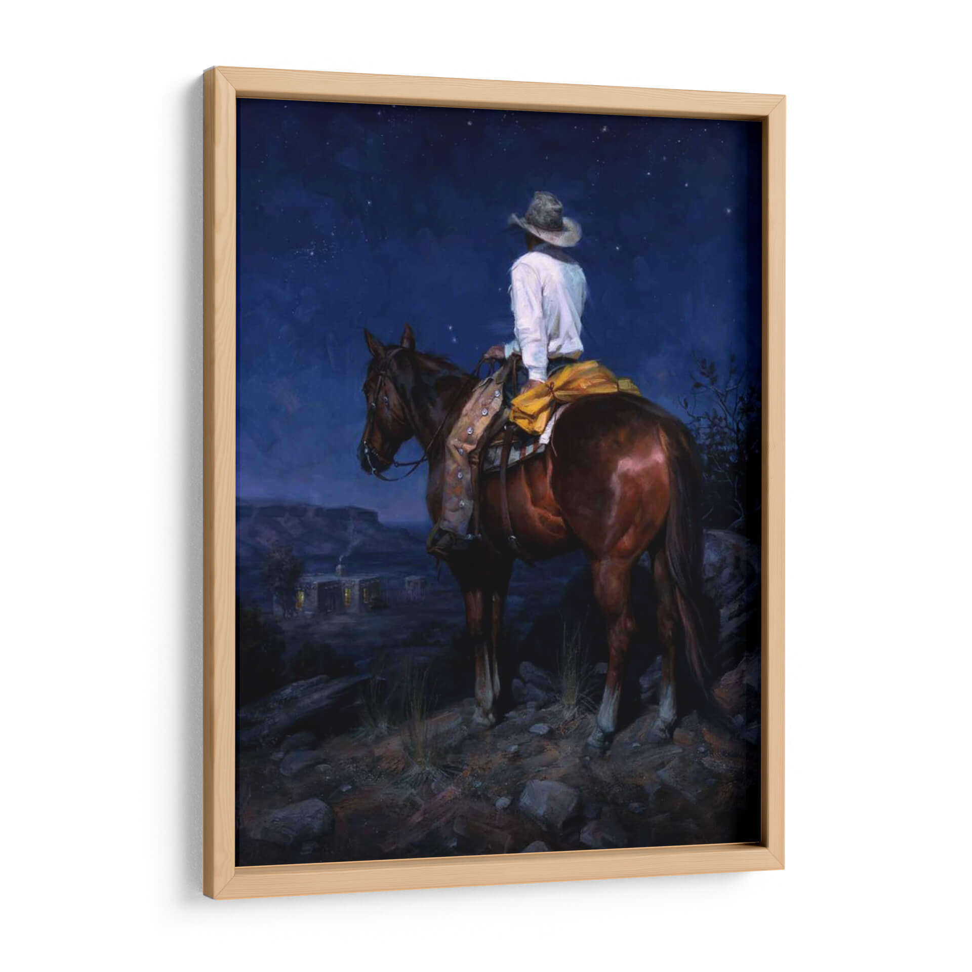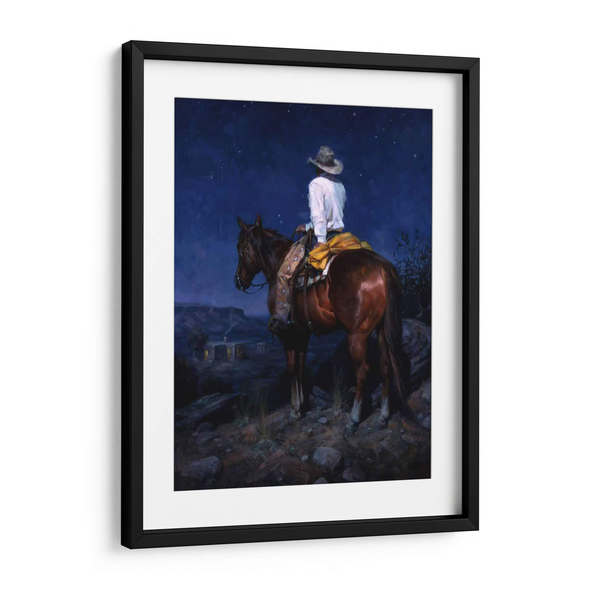 Captura la esencia de la vastedad y la contemplación con este impresionante cuadro decorativo, "Tiempos Recordados" de Jack Sorenson. La obra presenta a un jinete solitario a caballo, mirando hacia un cielo nocturno estrellado que se funde con un paisaje desértico al anochecer. La paleta de colores, dominada por profundos azules y sombras misteriosas, evoca una sensación de paz, introspección y aventura. Los tonos tierra del paisaje y el brillo tenue de las luces de una aldea distante añaden profundidad y una narrativa sutil, invitando al espectador a reflexionar sobre el tiempo y la memoria. El realismo detallado del caballo y la figura del vaquero, junto con la atmósfera serena y épica, hacen de esta pieza un elemento decorativo ideal para salones, estudios u oficinas que buscan inspirar tranquilidad y un toque de espíritu indomable. Este cuadro decorativo es perfecto para quienes aprecian el arte figurativo con una fuerte carga emocional y un sentido de conexión con la naturaleza y la historia del oeste americano. Añade una pieza de conversación que evoque la belleza atemporal de los paisajes nocturnos y la figura del viajero.
