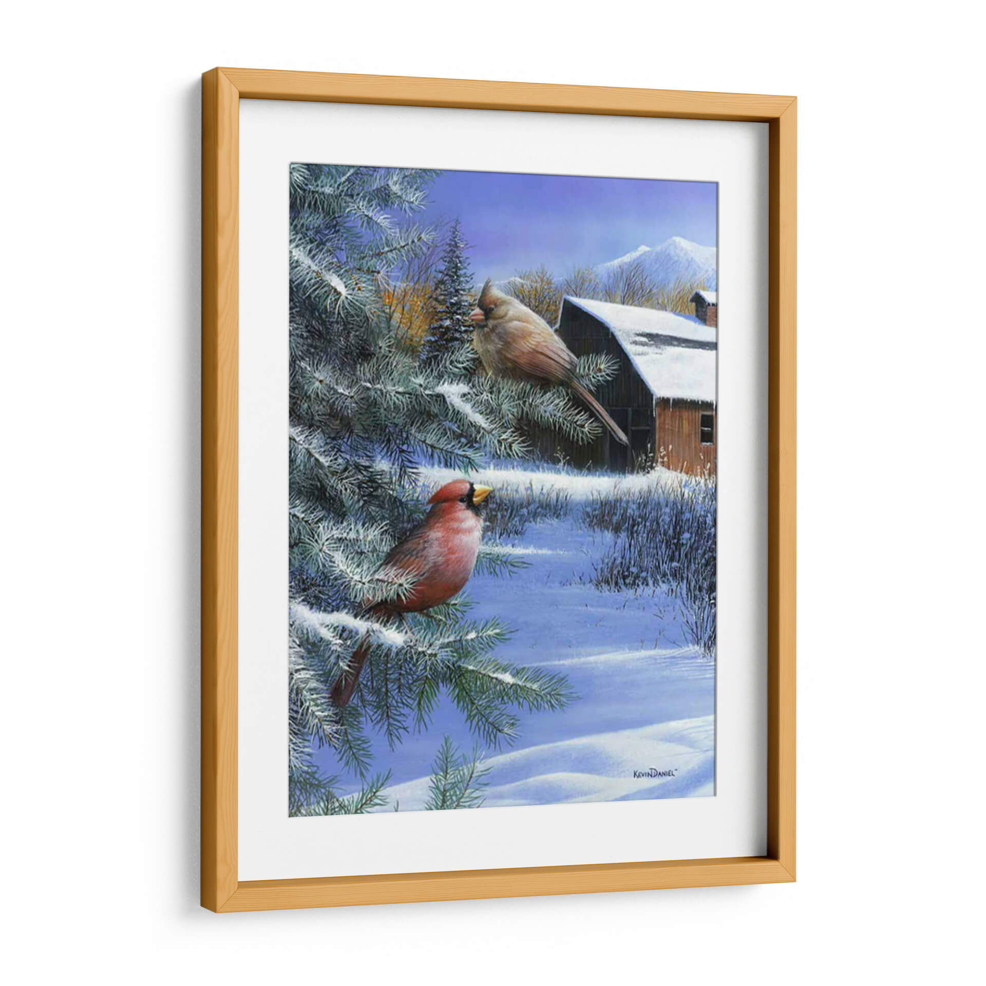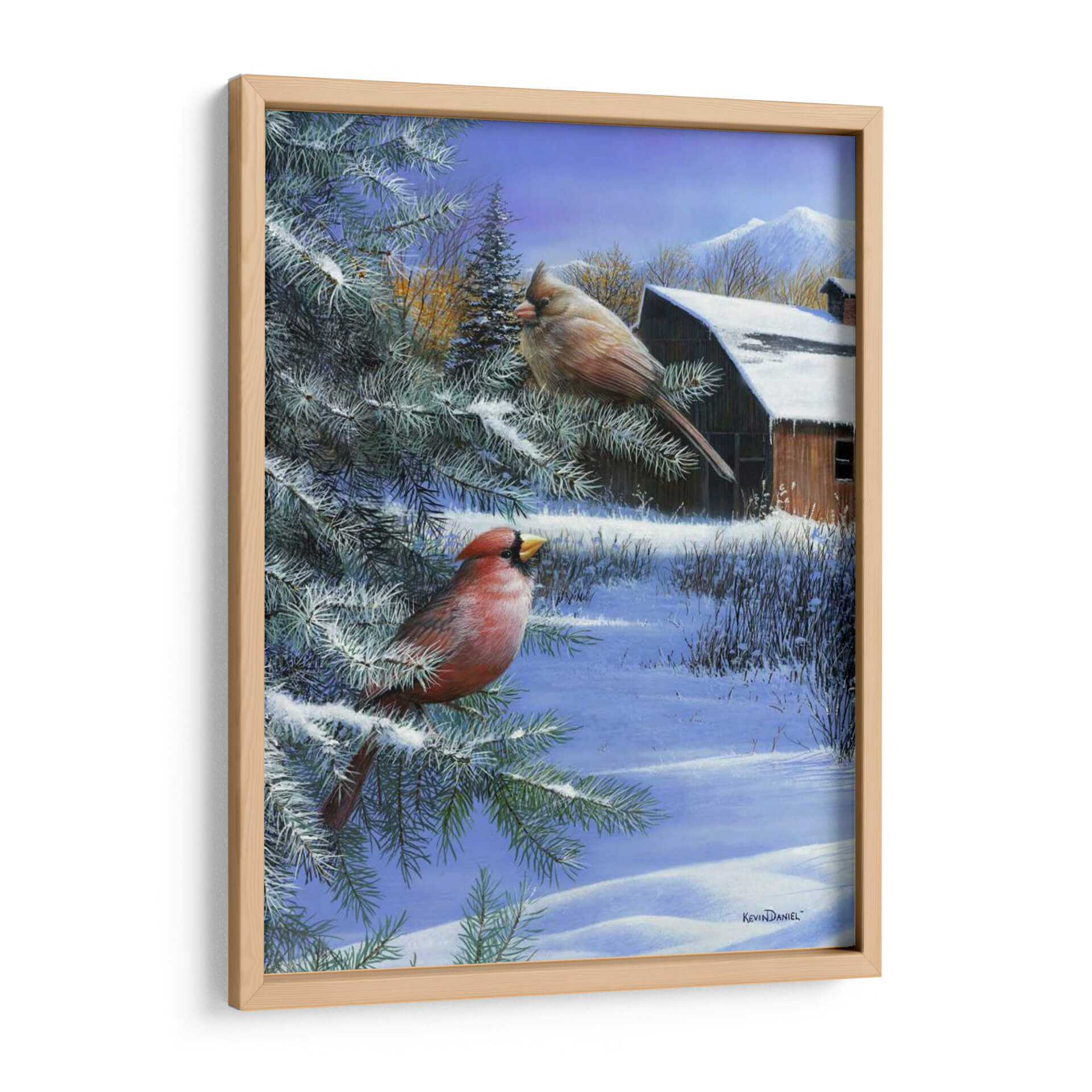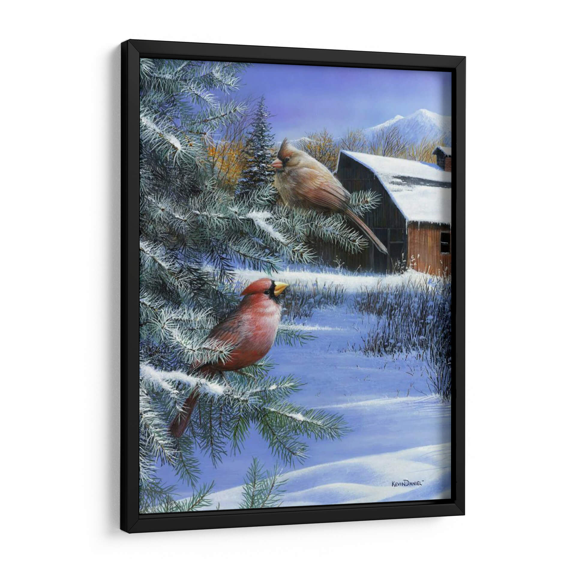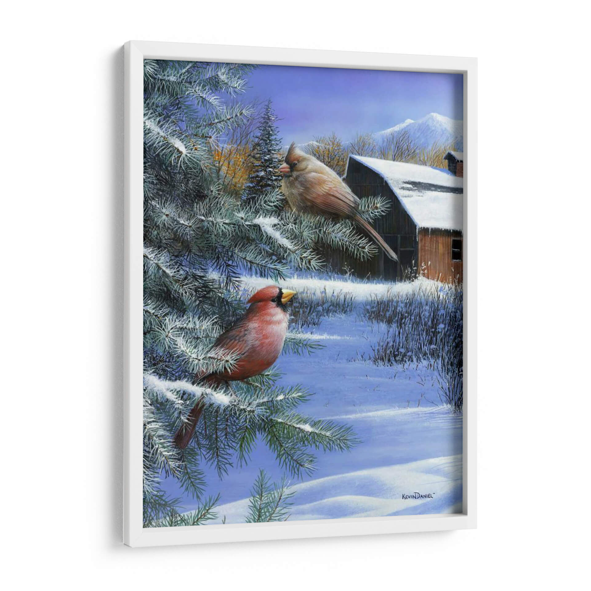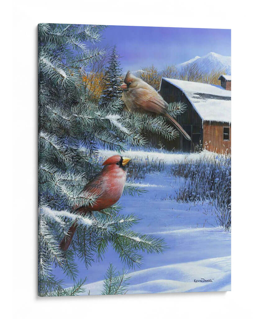 Captura la serenidad del invierno con este hermoso cuadro decorativo, "Un Día de Invierno" del artista Kevin Daniel. La obra presenta dos cardenales, uno de un rojo vibrante y el otro de tonos tierra, posados en las ramas cubiertas de nieve de un pino. Al fondo, un rústico granero de madera se asoma entre la vegetación invernal, con montañas nevadas coronando el horizonte bajo un cielo azul claro. La paleta de colores fríos, dominada por blancos, azules y toques de rojo y marrón cálido, evoca una atmósfera de paz y quietud, perfecta para espacios que buscan transmitir tranquilidad. El estilo realista y detallado de Kevin Daniel da vida a esta escena invernal, invitando a la contemplación. Este cuadro decorativo es ideal para añadir un toque de naturaleza y calma a tu sala de estar, dormitorio o cualquier rincón de tu hogar que necesite un respiro invernal. Transforma tu espacio con la belleza atemporal de la naturaleza en invierno.