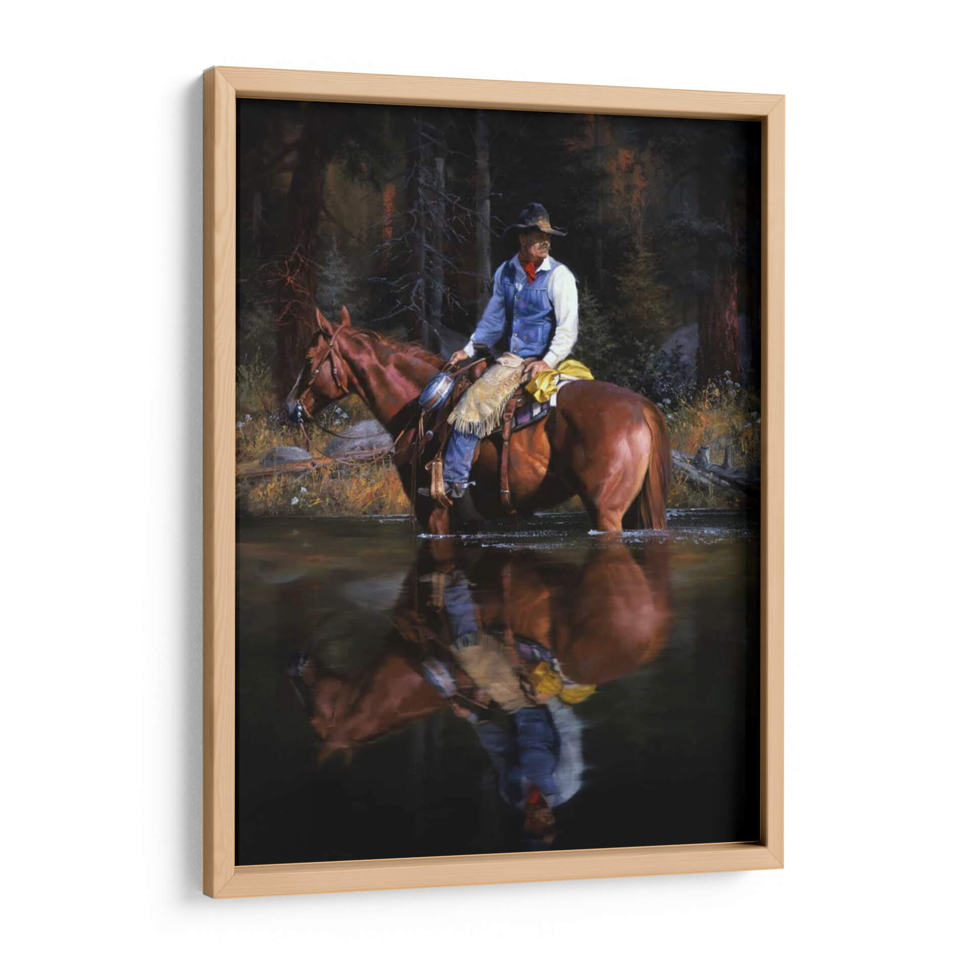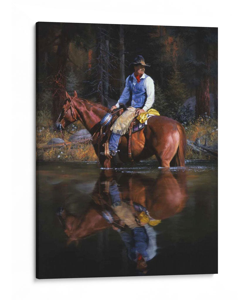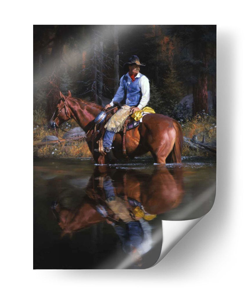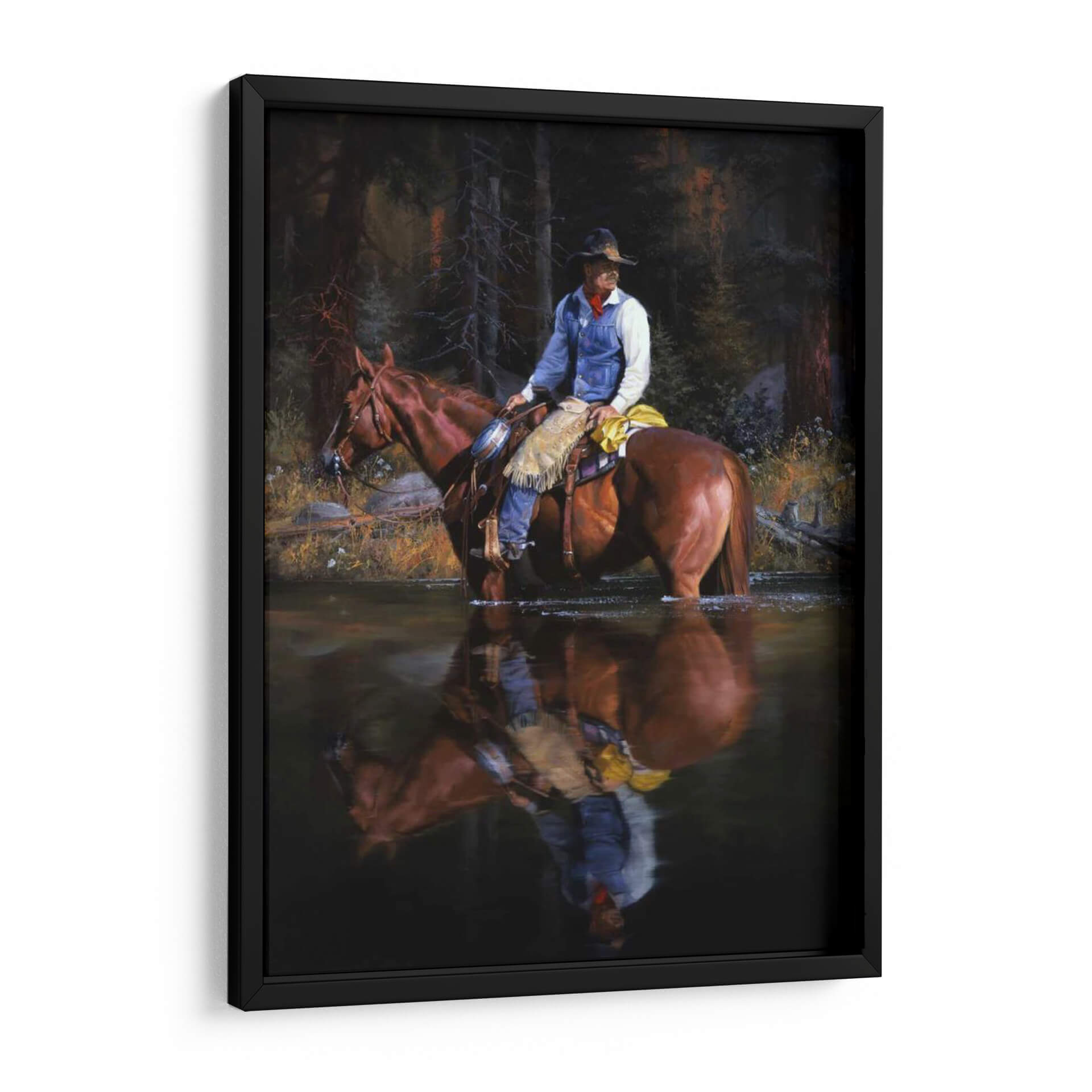 Sumérgete en la evocadora escena de "Un Sonido en la Madera" de Jack Sorenson, una obra maestra que captura la esencia del espíritu del Oeste. Este cuadro decorativo transporta al espectador a un sereno bosque, donde un vaquero solitario y su fiel caballo se detienen en un arroyo cristalino. La detallada representación de la naturaleza, con sus tonos tierra profundos y el juego de luces y sombras filtrándose entre los árboles, crea una atmósfera de tranquilidad y contemplación. El artista plasma con maestría la conexión entre el hombre, el animal y el entorno natural, invitando a la reflexión sobre la soledad y la paz que se encuentran en la vastedad del paisaje. Los ricos marrones del caballo, el azul denim del atuendo del vaquero y los sutiles verdes y ocres del follaje se combinan armoniosamente, ofreciendo un punto focal cautivador para cualquier estancia. Este cuadro es ideal para añadir un toque de serenidad rústica a tu salón, un aire de aventura a tu estudio, o una nota de carácter a tu dormitorio. "Un Sonido en la Madera" no es solo una pieza de decoración, sino una ventana a un momento de paz y conexión profunda con la naturaleza, perfecta para quienes aprecian el arte realista con un alma.