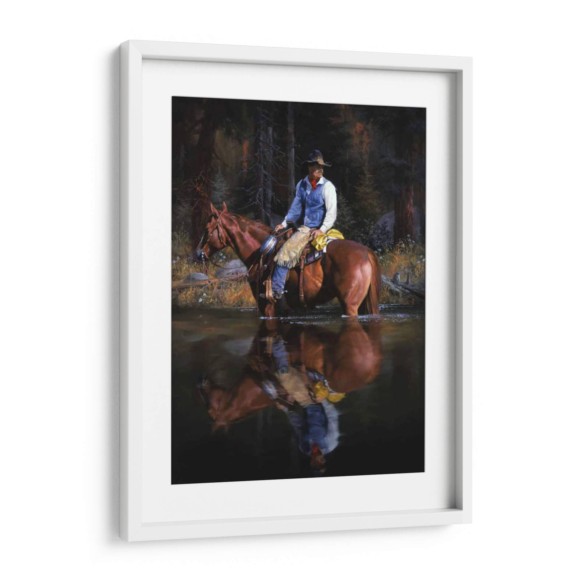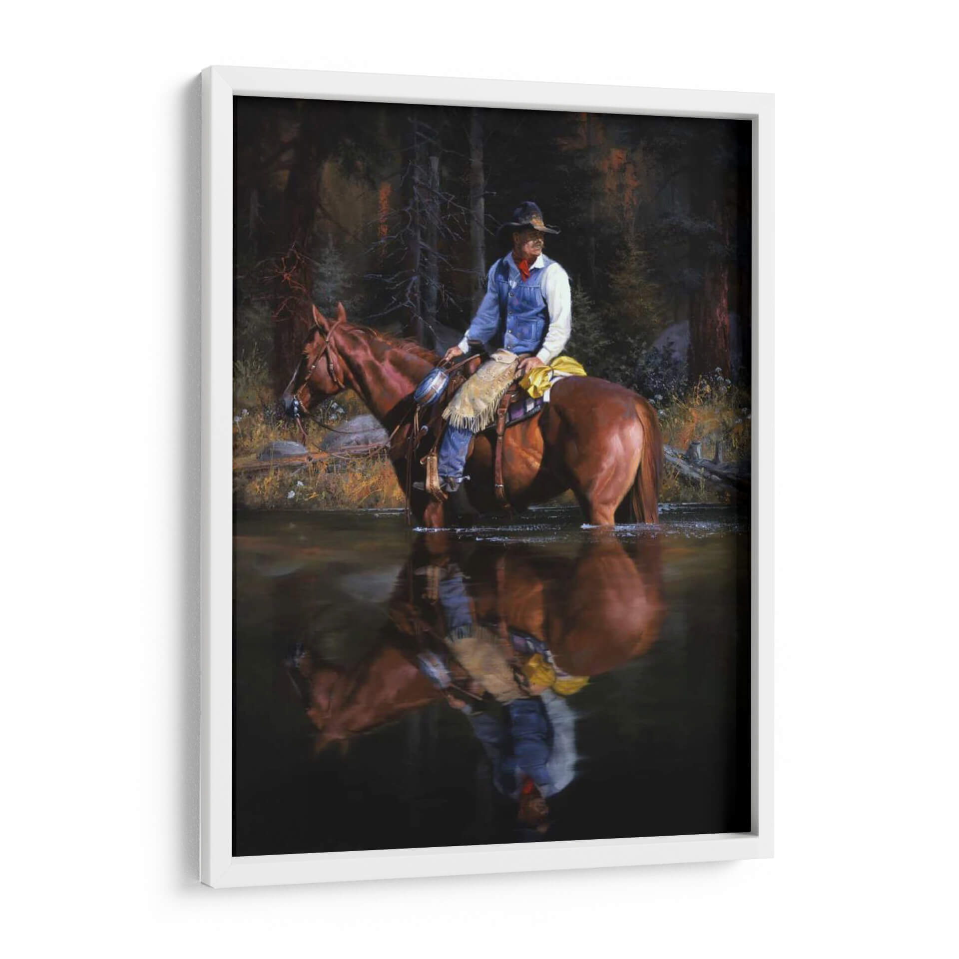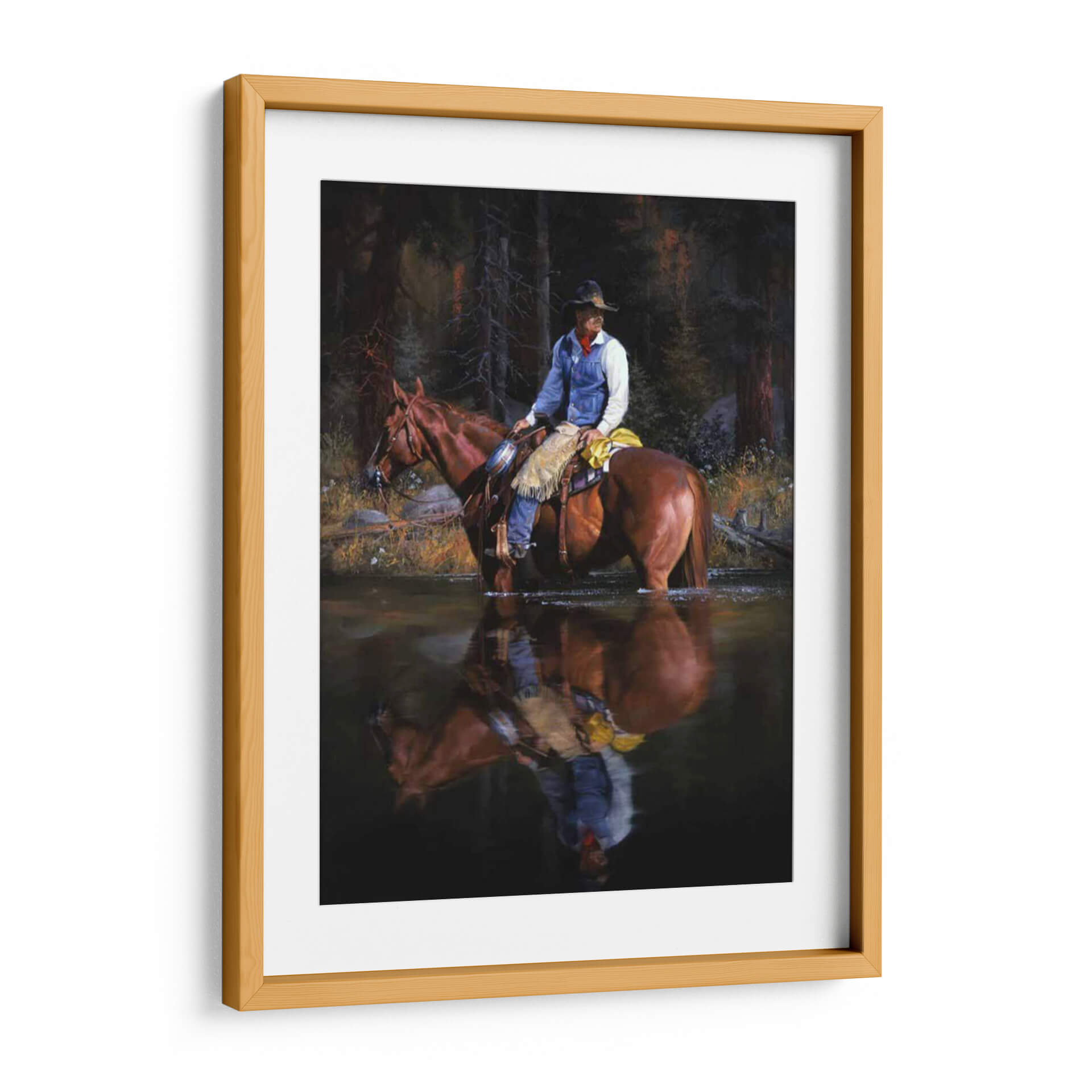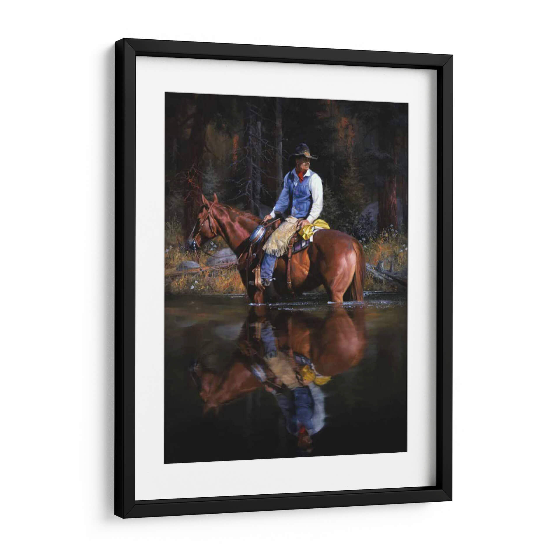 Sumérgete en la evocadora escena de "Un Sonido en la Madera" de Jack Sorenson, una obra maestra que captura la esencia del espíritu del Oeste. Este cuadro decorativo transporta al espectador a un sereno bosque, donde un vaquero solitario y su fiel caballo se detienen en un arroyo cristalino. La detallada representación de la naturaleza, con sus tonos tierra profundos y el juego de luces y sombras filtrándose entre los árboles, crea una atmósfera de tranquilidad y contemplación. El artista plasma con maestría la conexión entre el hombre, el animal y el entorno natural, invitando a la reflexión sobre la soledad y la paz que se encuentran en la vastedad del paisaje. Los ricos marrones del caballo, el azul denim del atuendo del vaquero y los sutiles verdes y ocres del follaje se combinan armoniosamente, ofreciendo un punto focal cautivador para cualquier estancia. Este cuadro es ideal para añadir un toque de serenidad rústica a tu salón, un aire de aventura a tu estudio, o una nota de carácter a tu dormitorio. "Un Sonido en la Madera" no es solo una pieza de decoración, sino una ventana a un momento de paz y conexión profunda con la naturaleza, perfecta para quienes aprecian el arte realista con un alma.
