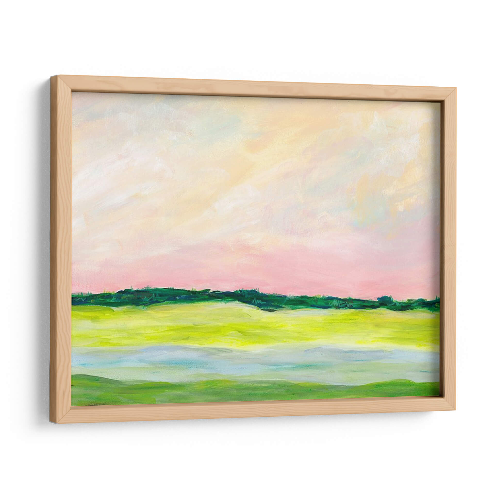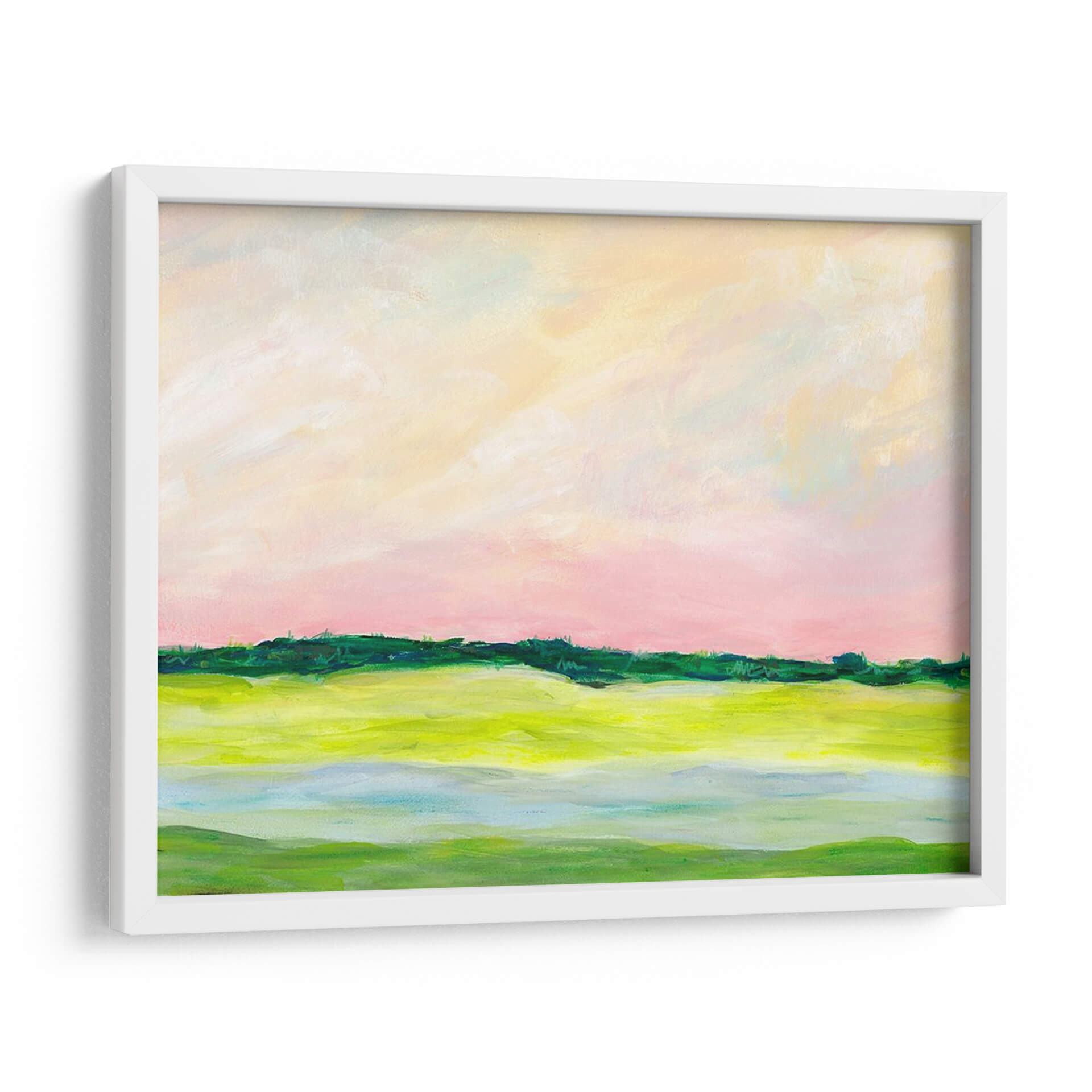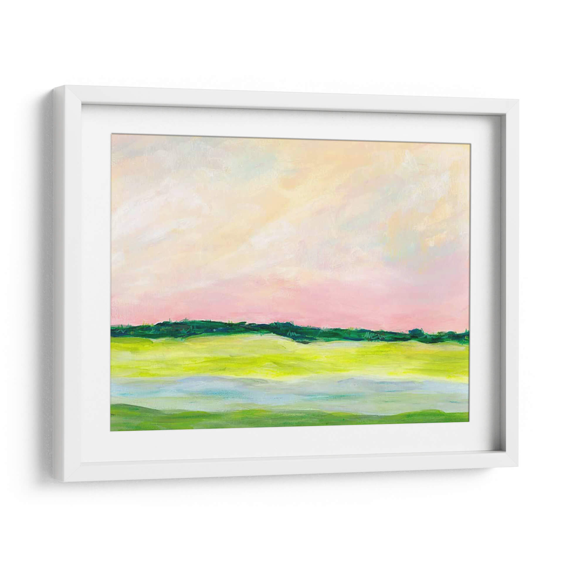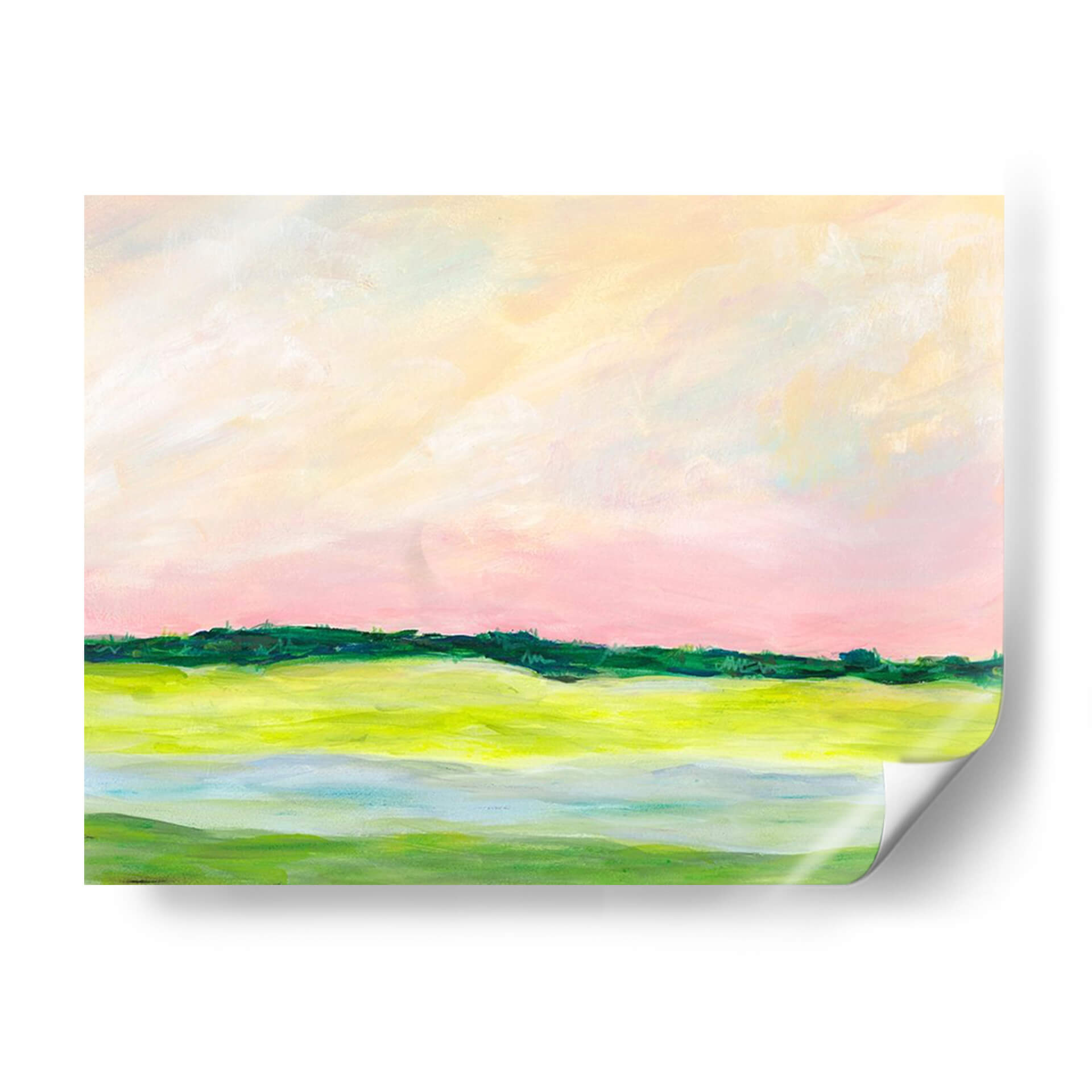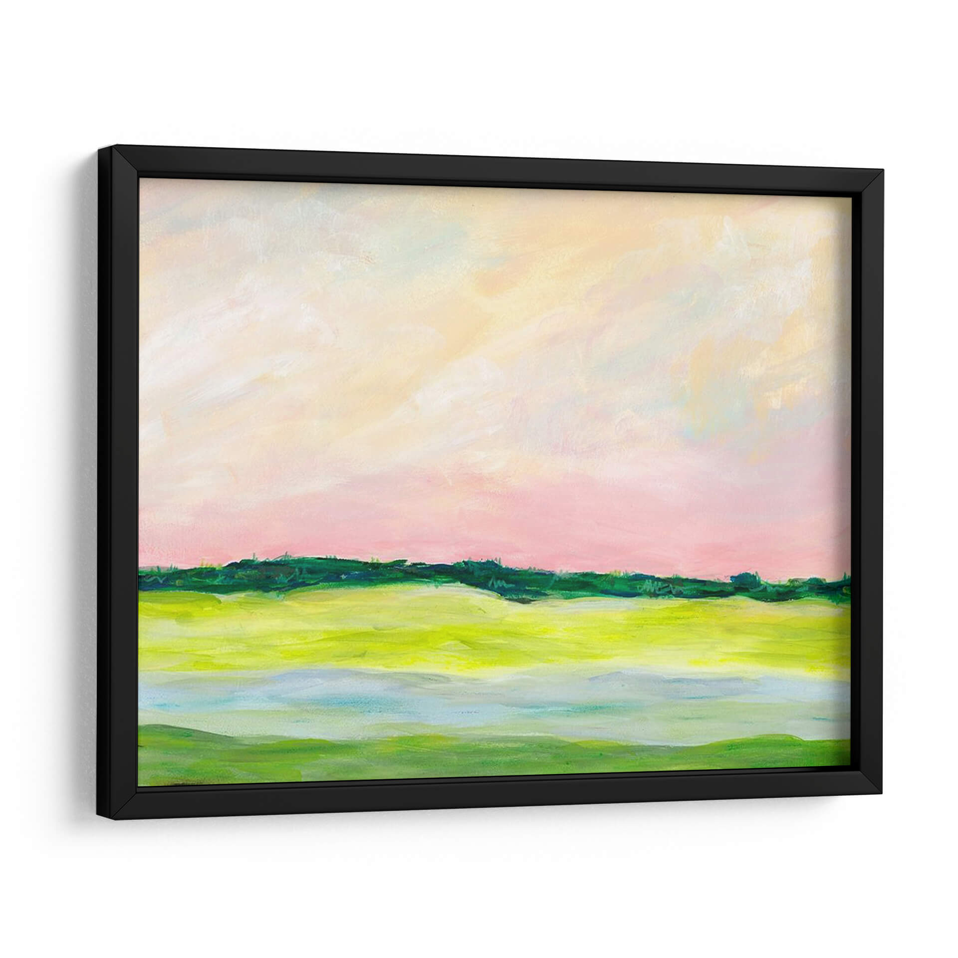 Sumérgete en la serenidad de "Aclividad I", una cautivadora obra de arte abstracto de Regina Moore que evoca la tranquilidad de un paisaje al amanecer. Los suaves tonos pastel del cielo, con pinceladas etéreas en rosa pálido y amarillo cremoso, se fusionan para crear una atmósfera de calma y ensueño. El horizonte, definido por una línea vibrante de verdes intensos, separa el cielo de la tierra, sugiriendo una promesa de vitalidad. La mitad inferior de la composición se adentra en un juego de formas orgánicas y colores tierra, con verdes brillantes y toques de azul aguamarina que recuerdan a campos fértiles y agua serena. Esta pieza, con su estilo impresionista moderno y su paleta de colores delicada pero expresiva, es ideal para infundir paz y sofisticación en cualquier espacio. Ya sea en una sala de estar, un dormitorio o un estudio, "Aclividad I" actúa como un portal a un momento de quietud, invitando a la contemplación y al disfrute estético. Su composición equilibrada y su toque artístico contemporáneo la convierten en una adición perfecta para aquellos que buscan una decoración que inspire y eleve el espíritu, aportando un aire de naturaleza estilizada y emoción sutil a tu hogar u oficina. Descubre la belleza de lo abstracto con esta pieza única.