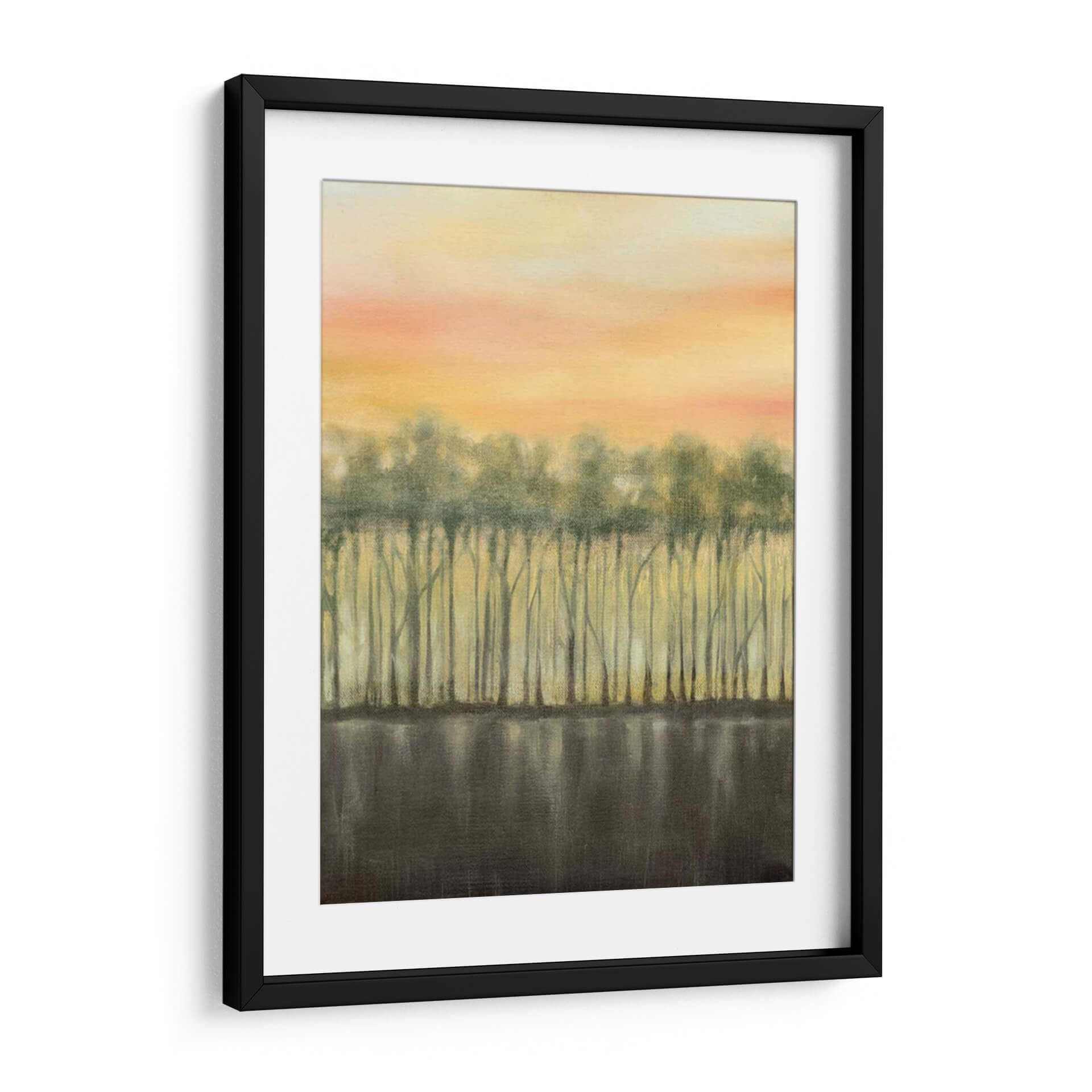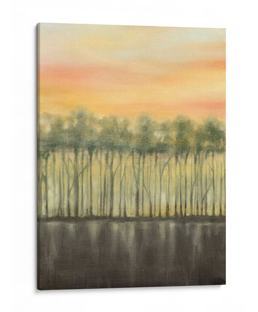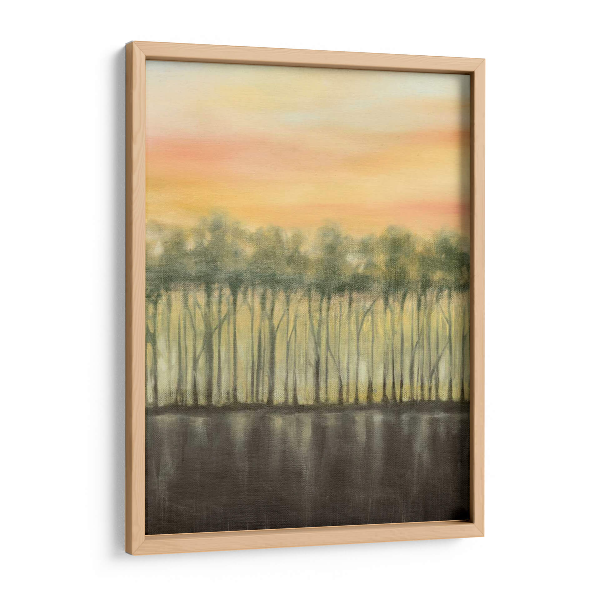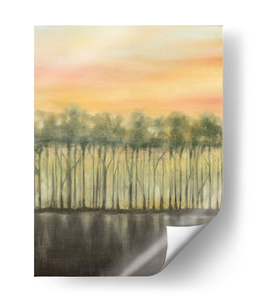 Sumérgete en la serenidad de "Anochecer en Verano", una cautivadora obra de arte que captura la mágica transición entre el día y la noche. Jennifer Goldberger nos transporta a un paisaje evocador, donde una línea de árboles estilizados se alza contra un cielo que se tiñe de naranjas y amarillos cálidos, reminiscente de las últimas luces de un día estival. La paleta de colores, dominada por tonos ocres, dorados suaves y un toque de melocotón en el cielo, se contrasta magistralmente con la profundidad oscura del agua en primer plano, reflejando sutilmente la escena superior. El estilo, entre lo impresionista y lo abstracto, invita a la contemplación, con pinceladas que sugieren más que detallan, creando una atmósfera de ensueño y tranquilidad. Este cuadro decorativo es perfecto para añadir un toque de calma y sofisticación a cualquier espacio, desde una sala de estar moderna hasta un sereno dormitorio o una oficina que busca inspiración. "Anochecer en Verano" no es solo una pieza decorativa, es una invitación a la pausa y a la apreciación de la belleza efímera de la naturaleza.