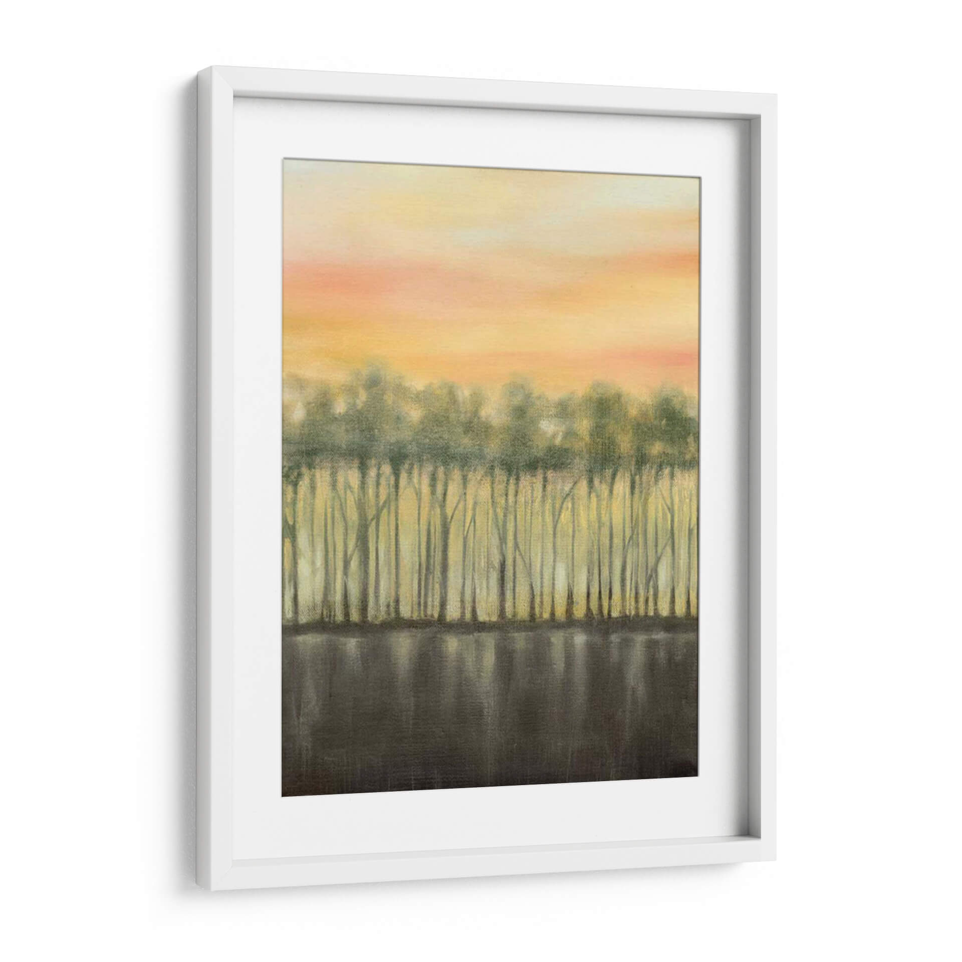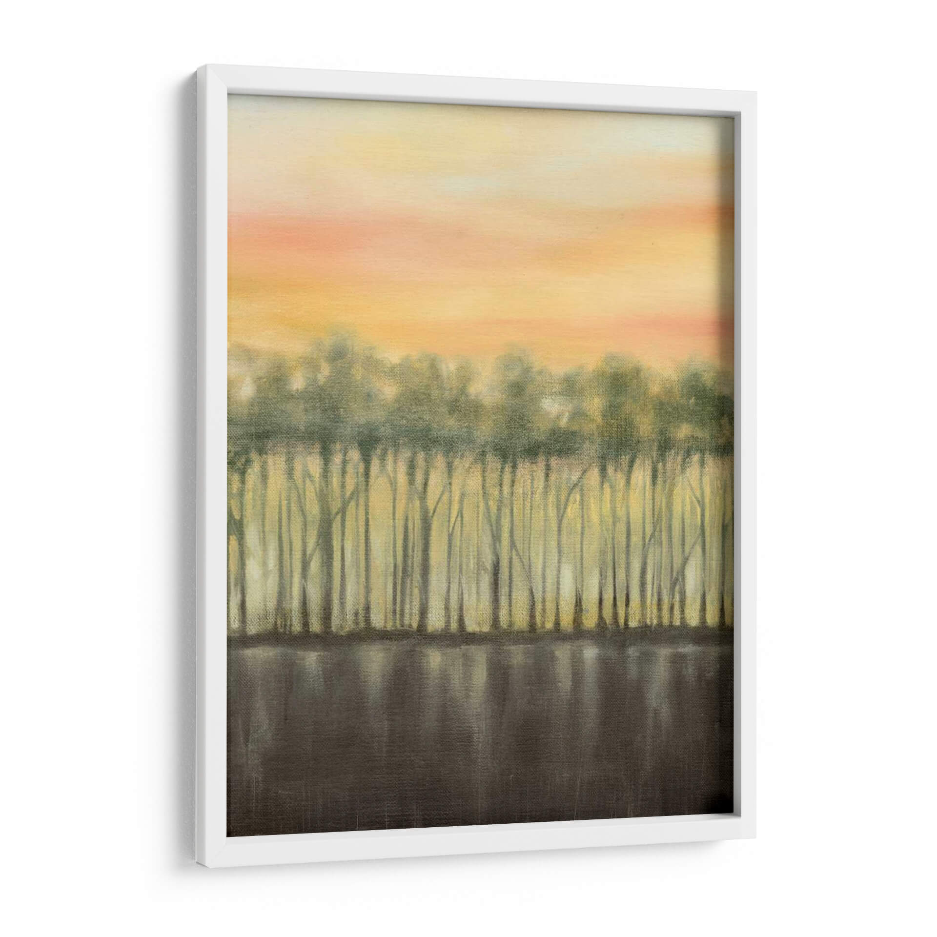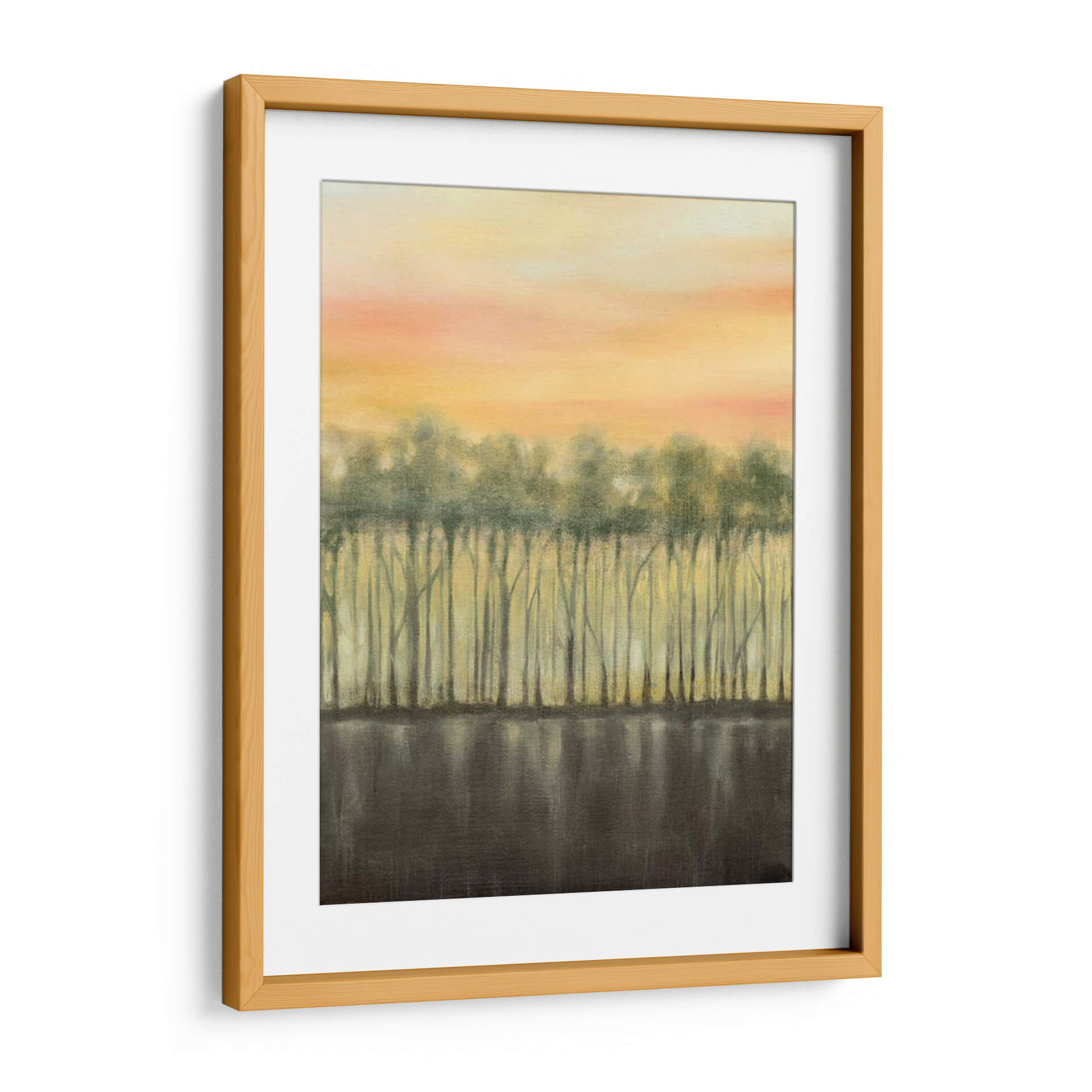 Sumérgete en la serenidad de "Anochecer en Verano", una cautivadora obra de arte que captura la mágica transición entre el día y la noche. Jennifer Goldberger nos transporta a un paisaje evocador, donde una línea de árboles estilizados se alza contra un cielo que se tiñe de naranjas y amarillos cálidos, reminiscente de las últimas luces de un día estival. La paleta de colores, dominada por tonos ocres, dorados suaves y un toque de melocotón en el cielo, se contrasta magistralmente con la profundidad oscura del agua en primer plano, reflejando sutilmente la escena superior. El estilo, entre lo impresionista y lo abstracto, invita a la contemplación, con pinceladas que sugieren más que detallan, creando una atmósfera de ensueño y tranquilidad. Este cuadro decorativo es perfecto para añadir un toque de calma y sofisticación a cualquier espacio, desde una sala de estar moderna hasta un sereno dormitorio o una oficina que busca inspiración. "Anochecer en Verano" no es solo una pieza decorativa, es una invitación a la pausa y a la apreciación de la belleza efímera de la naturaleza.