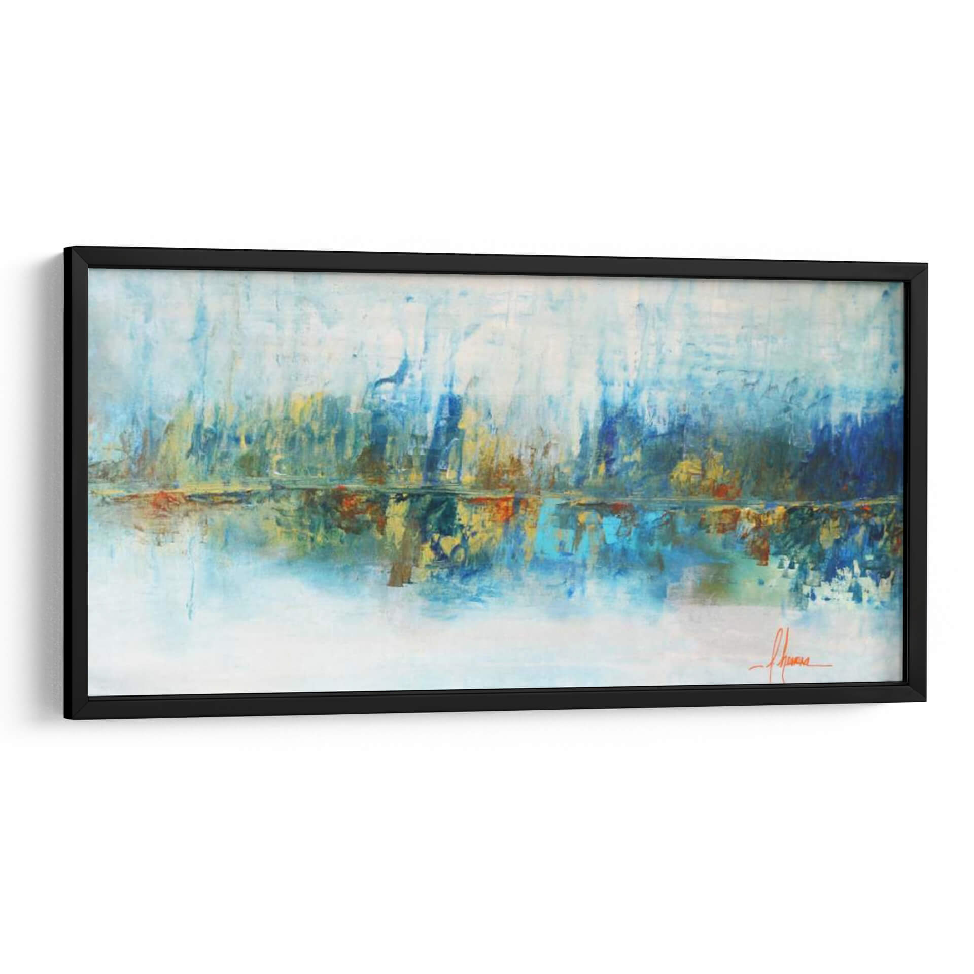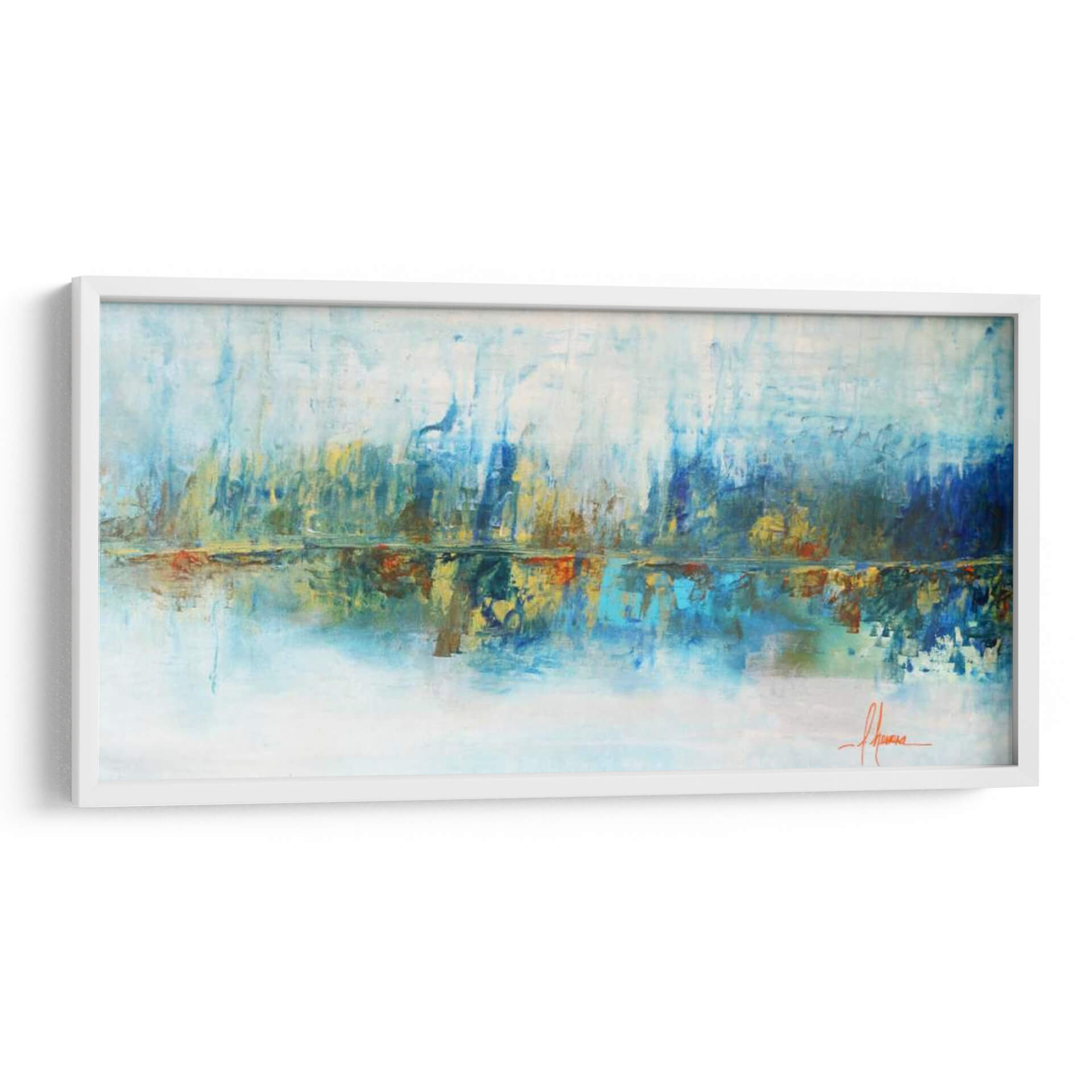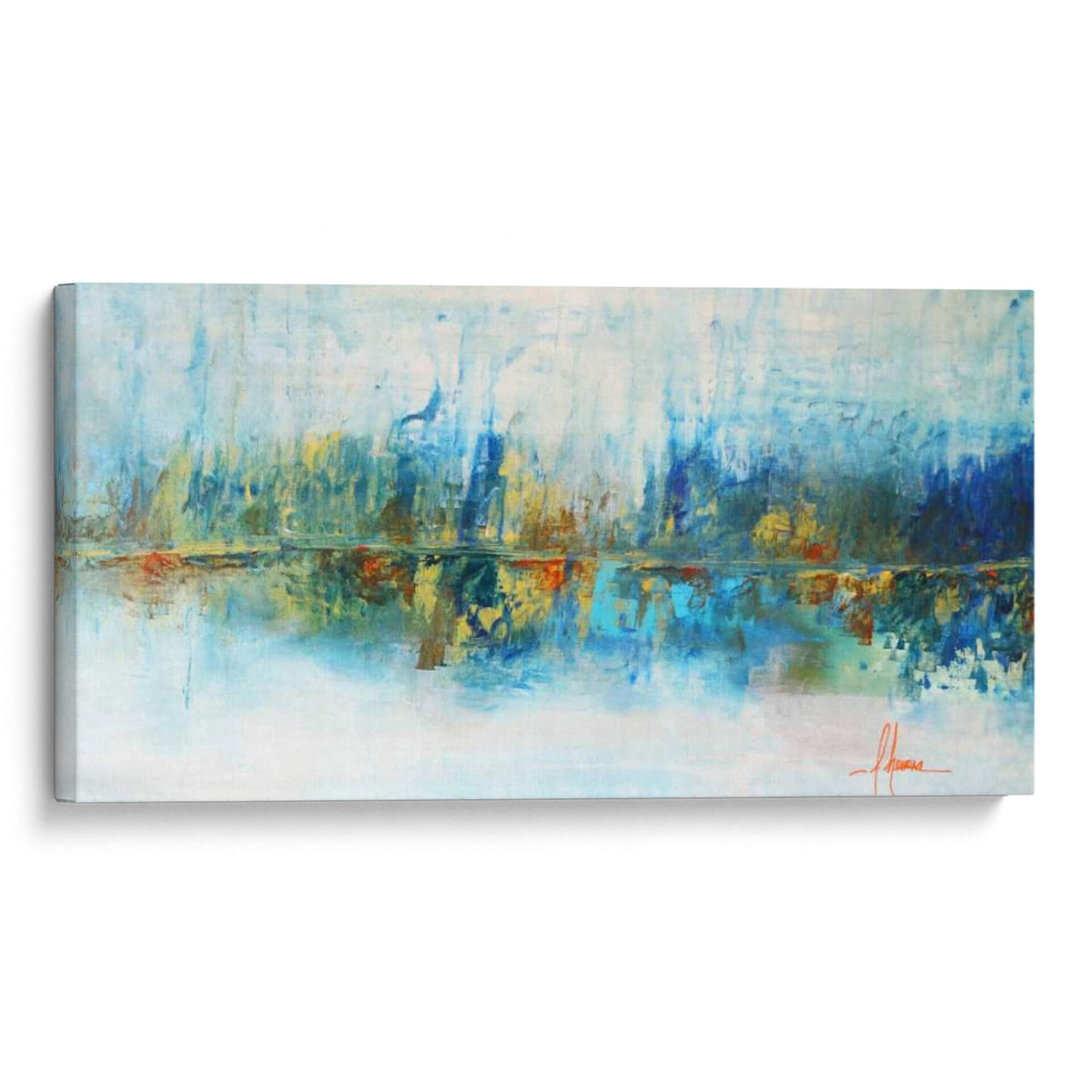 Sumérgete en la serenidad acuática con "Aqua Azul", una obra de arte abstracto que evoca la tranquilidad de un paisaje al amanecer. Las pinceladas audaces y la paleta de colores vibrantes, dominada por tonos azules profundos, celestes etéreos y toques cálidos de ocre y naranja, crean una atmósfera de calma y reflexión. La composición horizontal, con su sugerencia de un horizonte y su reflejo en aguas tranquilas, invita a la contemplación. Este cuadro decorativo es ideal para espacios que buscan un toque de sofisticación y paz, como salas de estar, dormitorios o estudios. Su estilo abstracto contemporáneo permite una interpretación personal, conectando emocionalmente con cada espectador. "Aqua Azul" no es solo una pieza decorativa, es una ventana a un mundo de sensaciones, perfecta para añadir profundidad y serenidad a tu hogar u oficina. La maestra Leticia Herrera captura la esencia del agua y la luz con una técnica expresiva que transformará cualquier ambiente, convirtiéndose en un punto focal inspirador y relajante. Añade esta pieza única a tu colección y experimenta la armonía de sus matices.