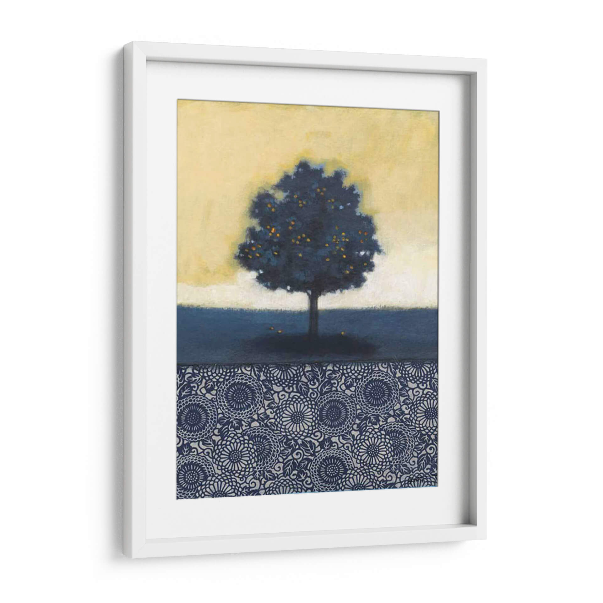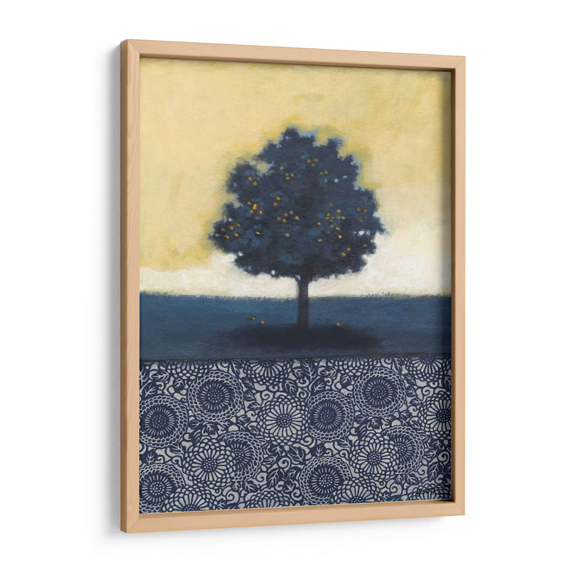 Sumérgete en la serena belleza de "Árbol De Limón Azul I", una cautivadora obra de arte del artista Norman Wyatt Jr. Esta pieza evoca una atmósfera de tranquilidad y misterio, presentando un árbol solitario de vibrante follaje azul oscuro, salpicado de frutos amarillos brillantes. El fondo se difumina en un suave degradado de amarillo pálido, creando un contraste evocador con el azul profundo del árbol y el suelo. La parte inferior de la obra se adorna con un intrincado patrón decorativo en tonos azules y plateados, añadiendo un toque de sofisticación y detalle. El estilo de la obra, una fusión entre lo figurativo y lo abstracto, invita a la contemplación. Es ideal para añadir un punto focal artístico y un toque de color sutil a cualquier espacio, desde una sala de estar moderna hasta un tranquilo dormitorio u oficina. Este cuadro decorativo es perfecto para quienes buscan arte que inspire calma y reflexión, combinando elementos naturales con un diseño geométrico elegante. Descubre la magia de este árbol de limón azul y transforma tu hogar en un oasis de paz y estilo.