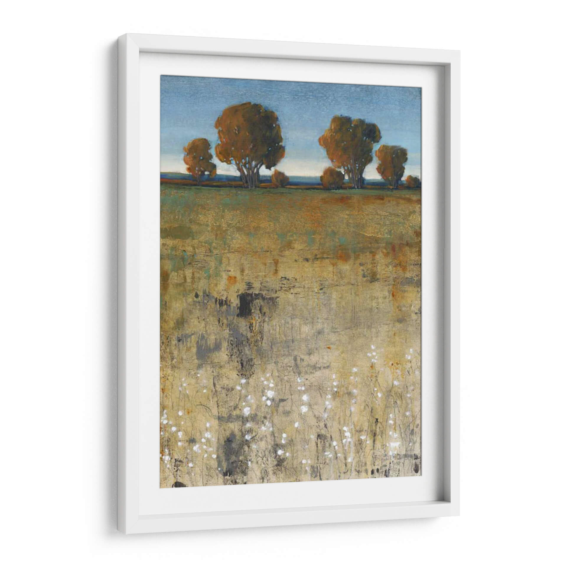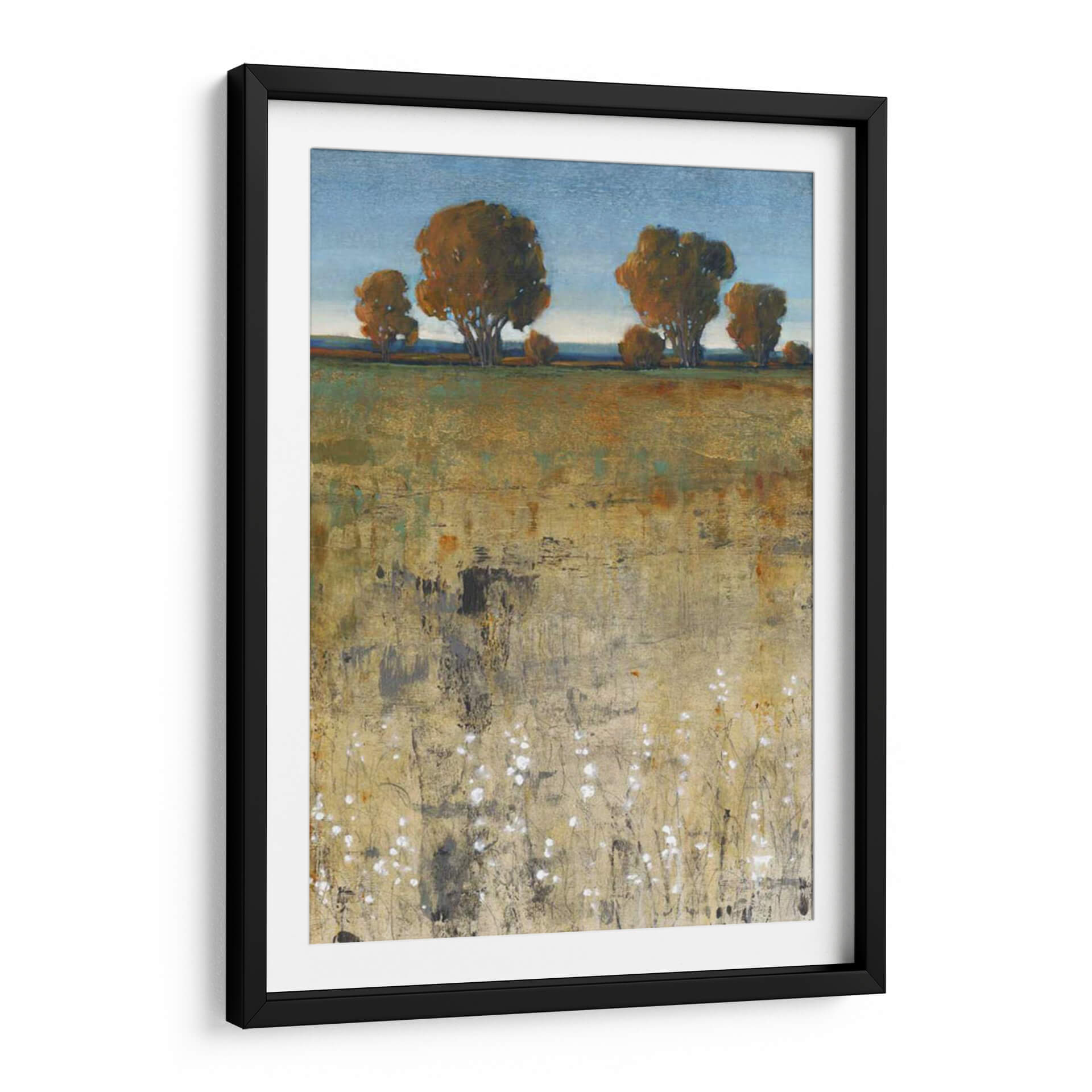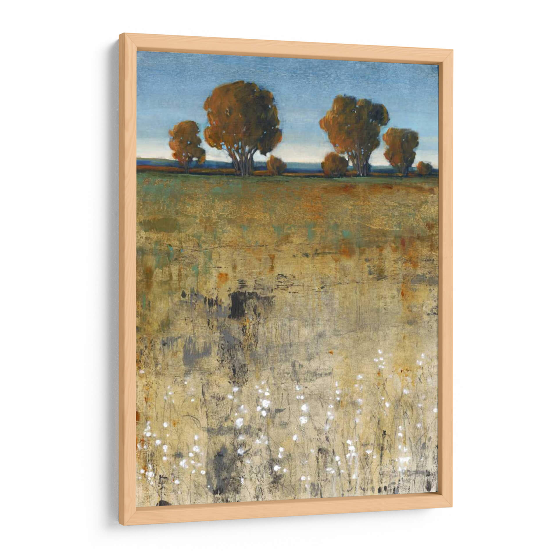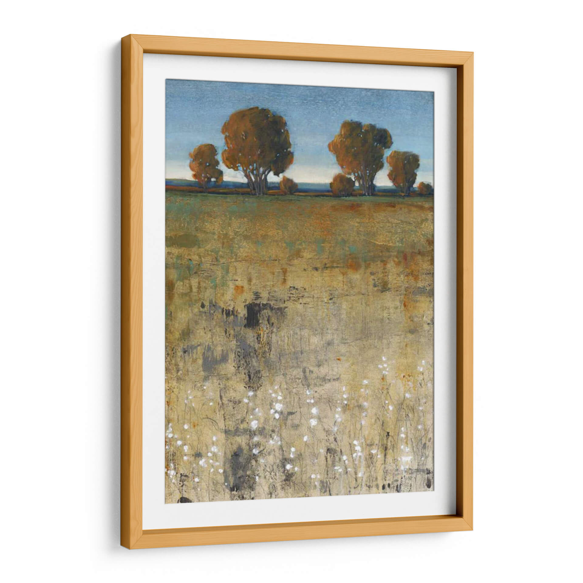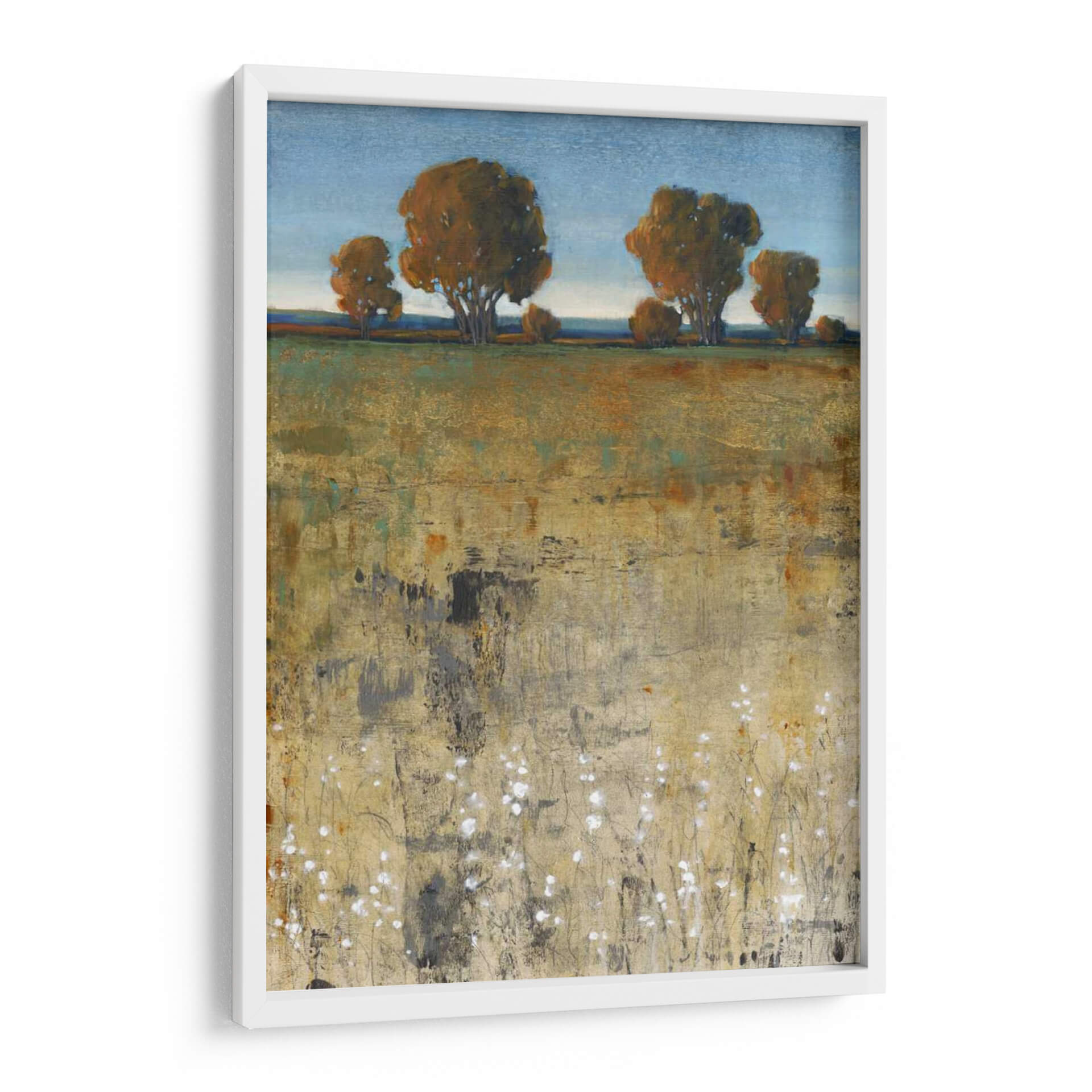 Sumérgete en la serenidad del campo con "Árboles Distantes II", una obra de arte que captura la esencia de un paisaje sereno con una técnica texturizada y evocadora. Tim O'Toole nos transporta a un prado bañado por la luz del atardecer, donde las siluetas de árboles robustos se perfilan contra un cielo de tonos azules y grises suaves. La paleta de colores se centra en cálidos ocres, dorados y verdes apagados, creando una atmósfera acogedora y melancólica. La textura rica y casi abstracta del primer plano, salpicada de delicadas flores blancas, añade profundidad y un toque de misterio, invitando a la contemplación. Este cuadro decorativo es perfecto para añadir un elemento de calma y conexión con la naturaleza a tu hogar u oficina. Su estilo abstracto-impresionista lo convierte en una pieza versátil, ideal para salones, dormitorios o estudios que buscan un toque de sofisticación terrenal y resonancia emocional. Transforma tu espacio con la belleza atemporal de "Árboles Distantes II".