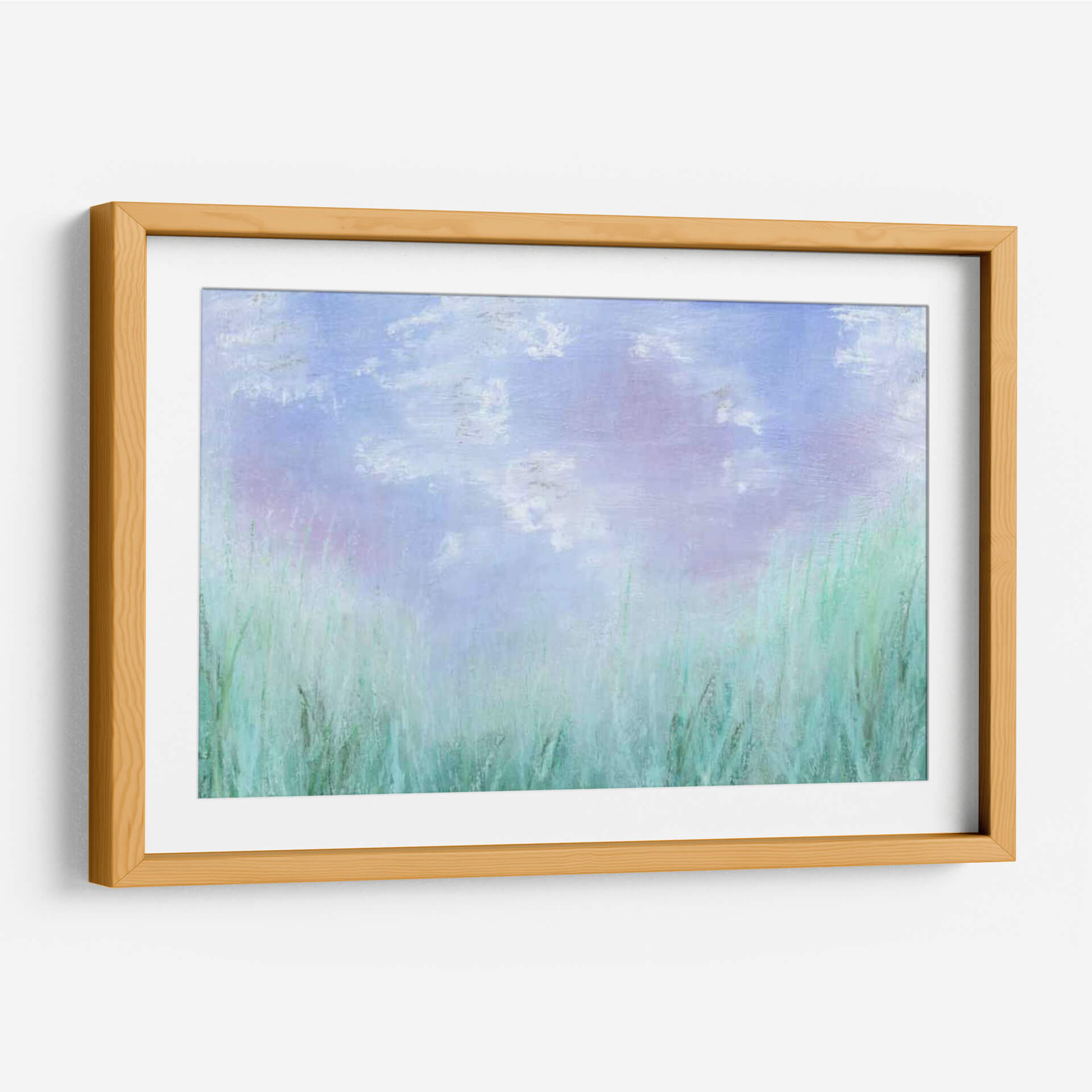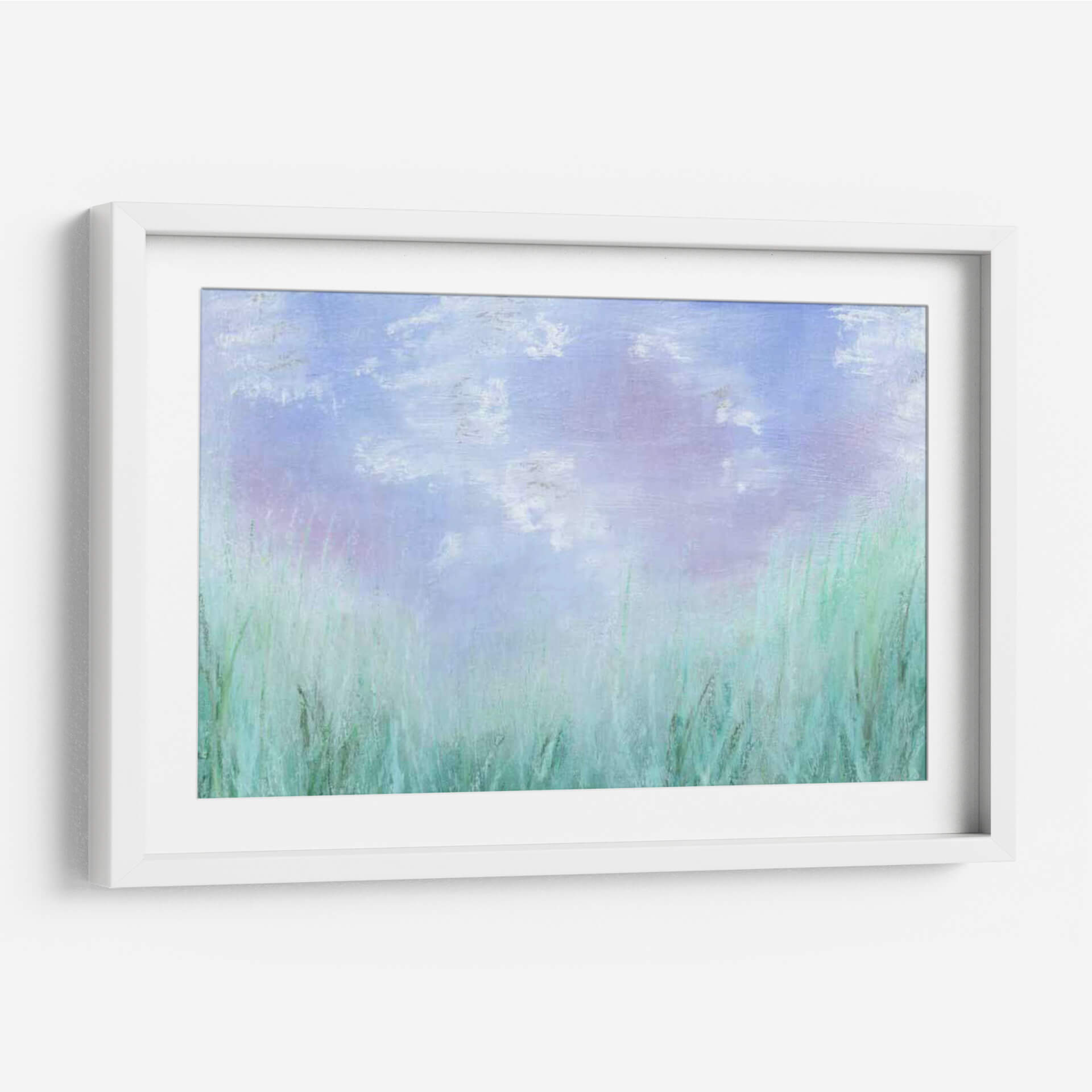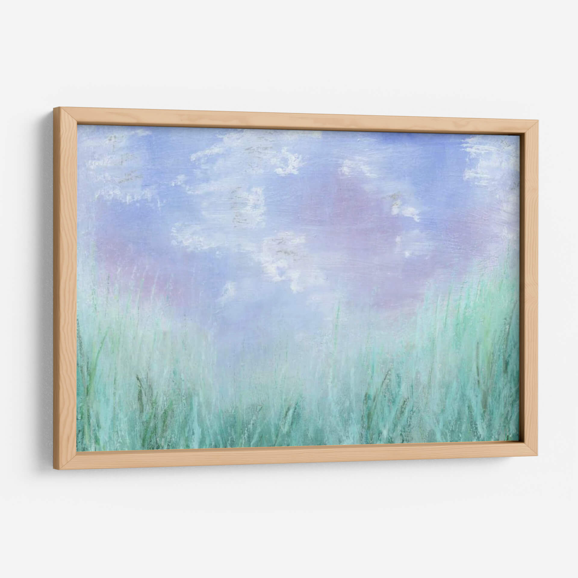 Sumérgete en la serenidad etérea de "Aura I", una obra de arte contemporáneo del artista Jason Johnson que captura la esencia de un paisaje natural bañado por una luz suave y difusa. La pieza presenta un cielo vasto y celesteste, salpicado de nubes tenues en tonos lavanda y blanco, que evoca una sensación de tranquilidad y expansión. En la parte inferior, una exuberante vegetación se despliega en vibrantes tonos verde azulado y menta, sugiriendo campos de hierba meciéndose suavemente con la brisa. La técnica empleada, con pinceladas sueltas y texturizadas, aporta una cualidad casi onírica a la composición, invitando al espectador a perderse en sus matices delicados. "Aura I" es perfecta para añadir un toque de calma y sofisticación a cualquier espacio, ya sea una sala de estar, un dormitorio o una oficina. Este cuadro decorativo se convierte en un portal hacia un momento de paz, ideal para quienes buscan un refugio visual en su hogar. La armonía cromática, dominada por pasteles y tonos frescos, crea una atmósfera relajante y a la vez estimulante, perfecta para desconectar del ajetreo diario.