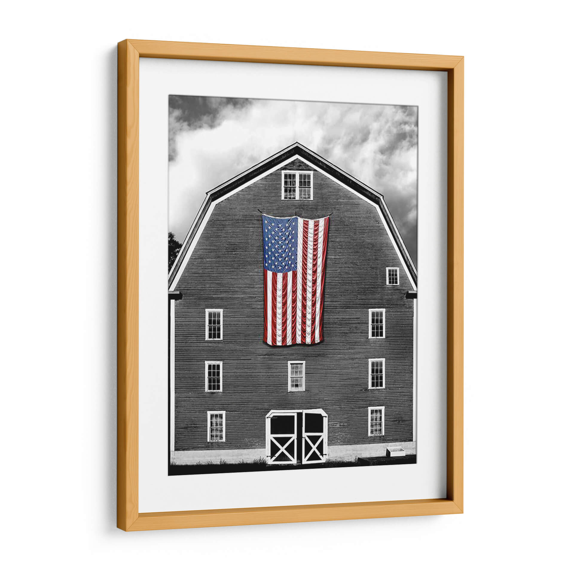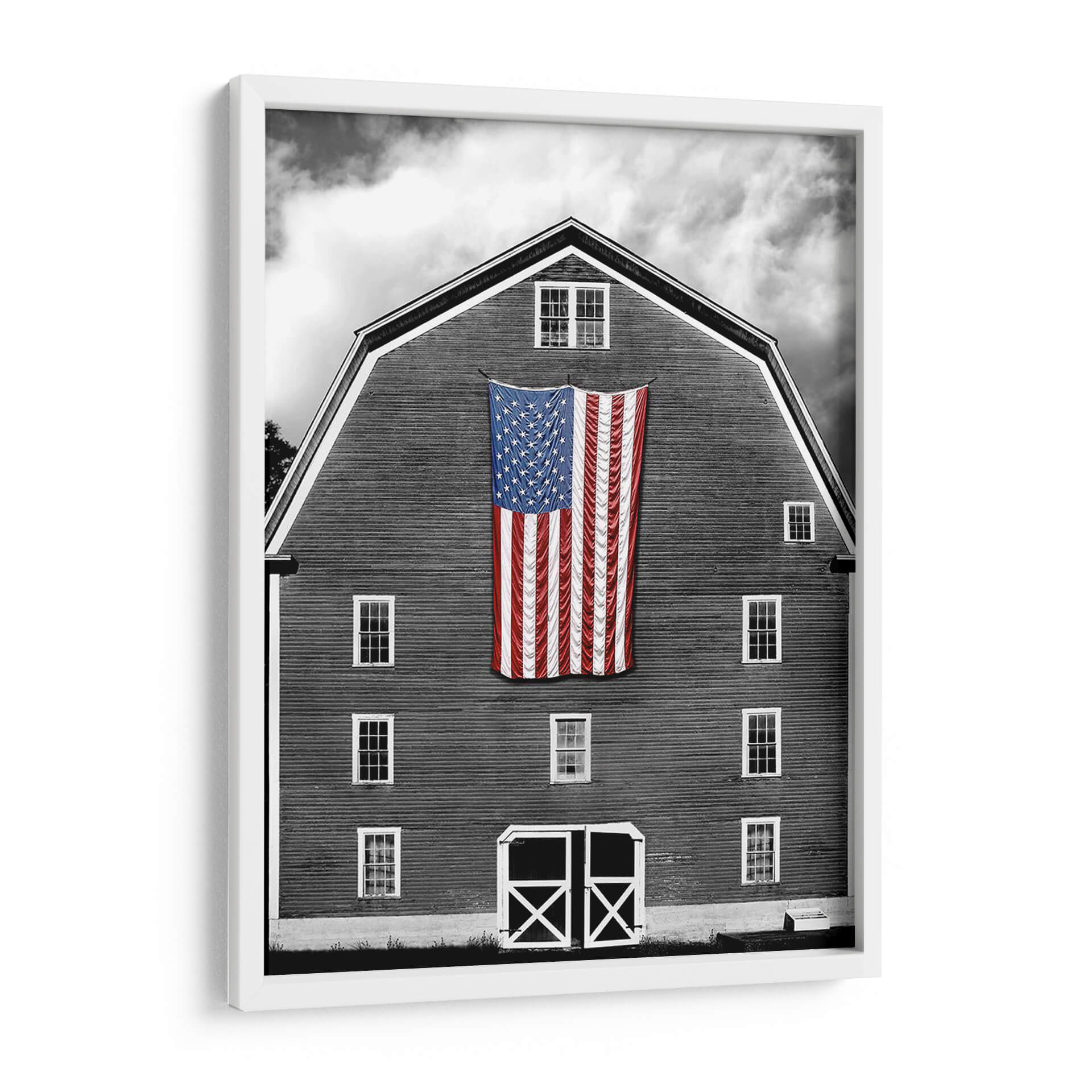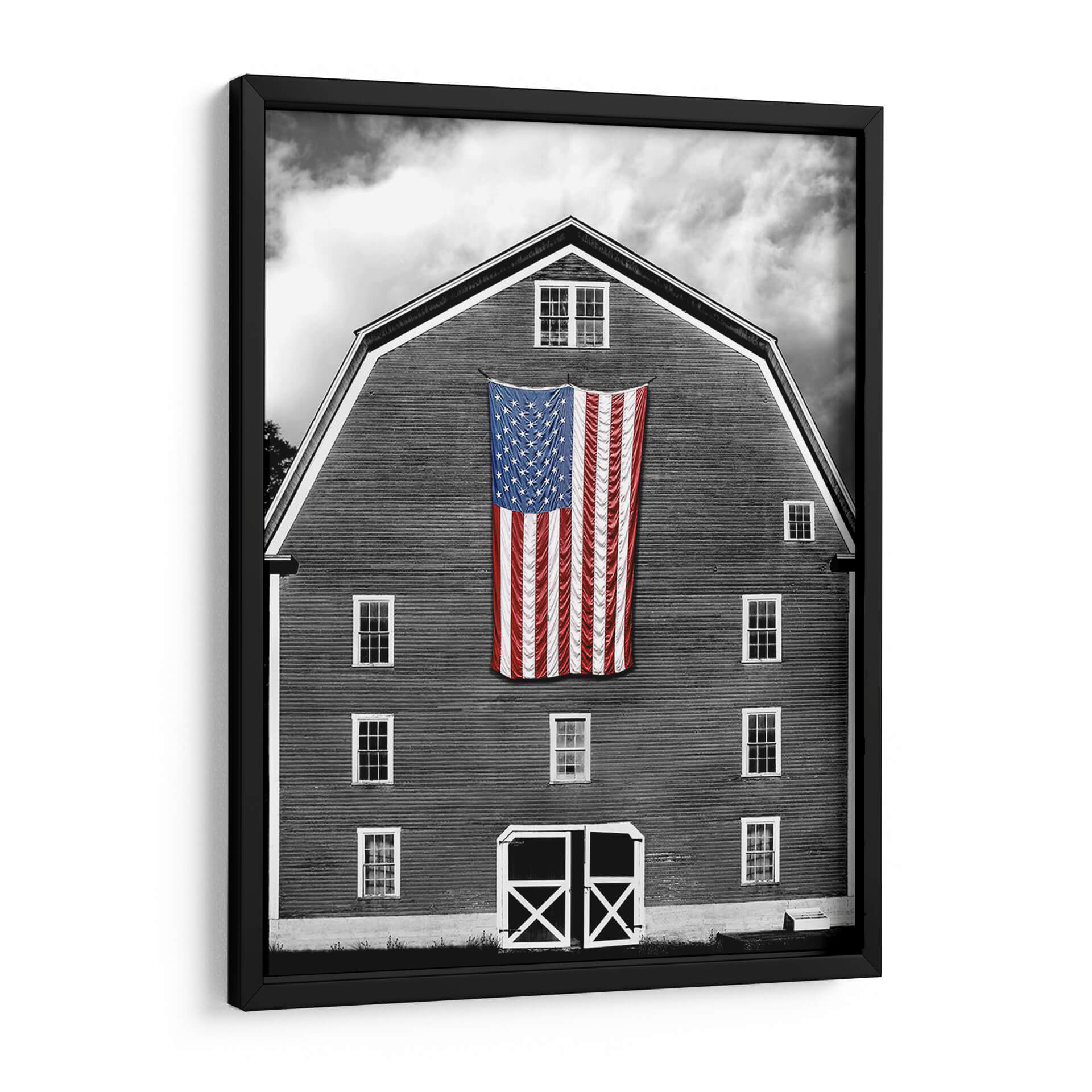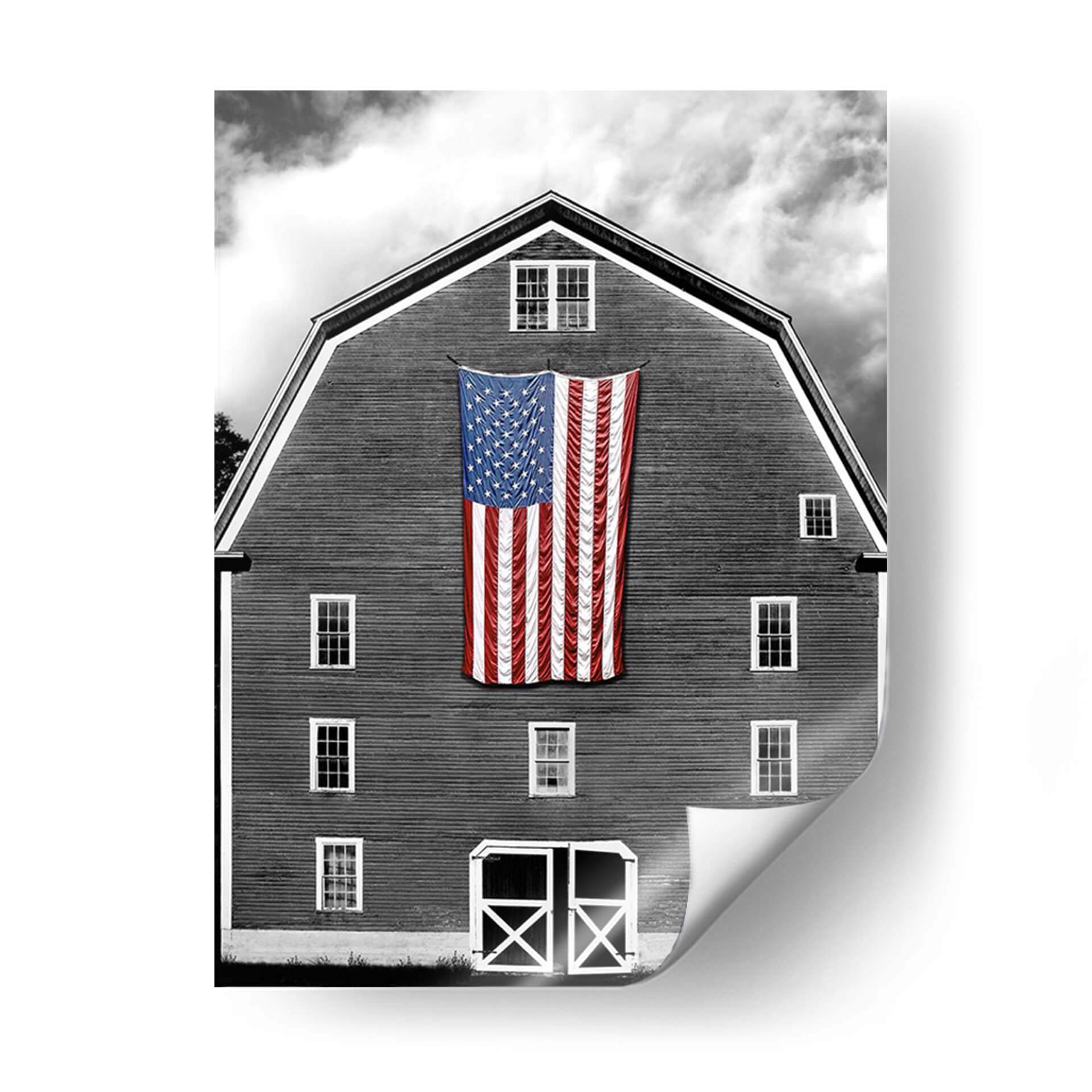 Captura la esencia del patriotismo y la nostalgia rural con este impactante cuadro decorativo "Banderas De Nuestros Agricultores Xix" de James McLoughlin. La obra presenta una icónica bandera estadounidense colgada de forma prominente sobre la fachada de un granero de madera, fotografiado en un evocador blanco y negro que resalta las texturas y las formas. El contraste entre la vibrante bandera, con sus estrellas y franjas rojas y azules, y el fondo sobrio del granero y el cielo nublado, crea una composición visualmente poderosa y llena de significado. McLoughlin logra una atmósfera que combina la fuerza del símbolo nacional con la serenidad del campo, invitando a la reflexión sobre la historia y las raíces. Este cuadro decorativo es ideal para espacios que buscan un toque de carácter, historia y orgullo, como salas de estar, estudios o incluso oficinas. Su estilo fotográfico, con un enfoque en la luz y la sombra, añade profundidad y dramatismo. Una pieza que no solo decora, sino que también cuenta una historia y evoca emociones. Añade un elemento de identidad y tradición a tu decoración con esta obra única.