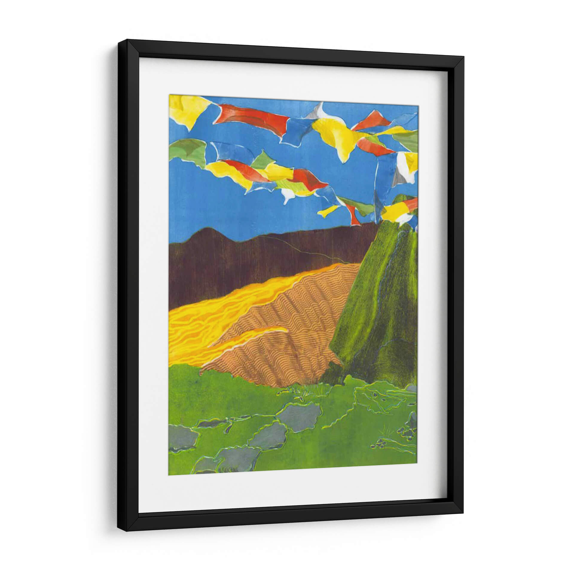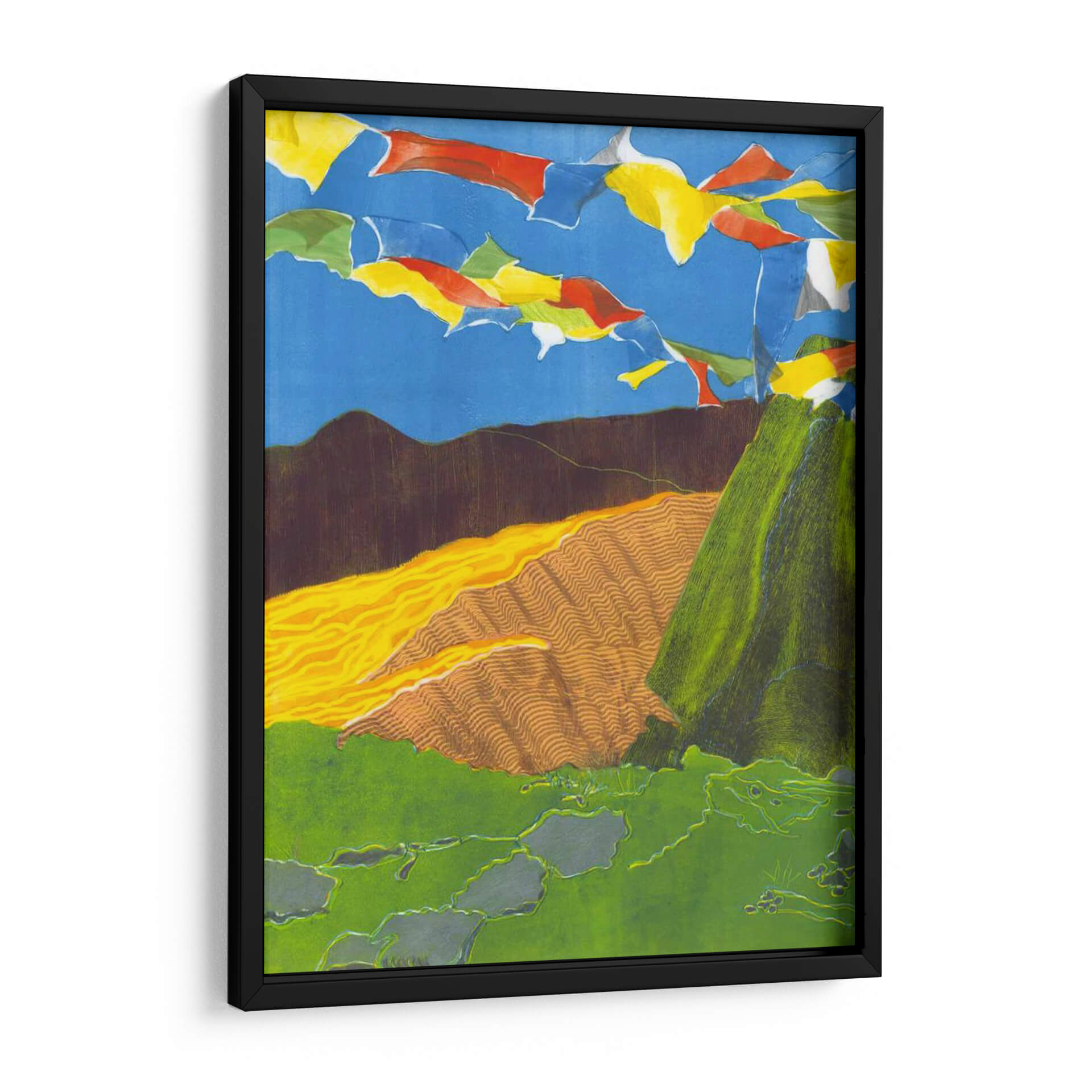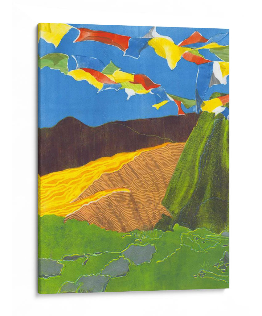 Sumérgete en la vibrante serenidad de 'Banderas De Oración I', una obra de arte cautivadora de Carolyn Roth que evoca la espiritualidad y la belleza de los paisajes montañosos. Esta pieza presenta una composición dinámica donde coloridas banderas de oración ondean contra un cielo azul intenso, creando una atmósfera de movimiento y esperanza. Las texturas ricas y las capas de color dan vida a las laderas verdes y a las colinas onduladas en tonos tierra y ocres, sugiriendo la profundidad y la vastedad de la naturaleza. La paleta de colores, aunque audaz, se equilibra con elementos terrosos, resultando en una armonía visual que invita a la contemplación. El estilo artístico, que combina elementos figurativos y abstractos con un toque de expresionismo, dota a la obra de una energía única. Ideal para quienes buscan infundir paz y un toque de inspiración exótica en sus hogares u oficinas, este cuadro decorativo es perfecto para salones, estudios o cualquier espacio que necesite un acento de color y significado.