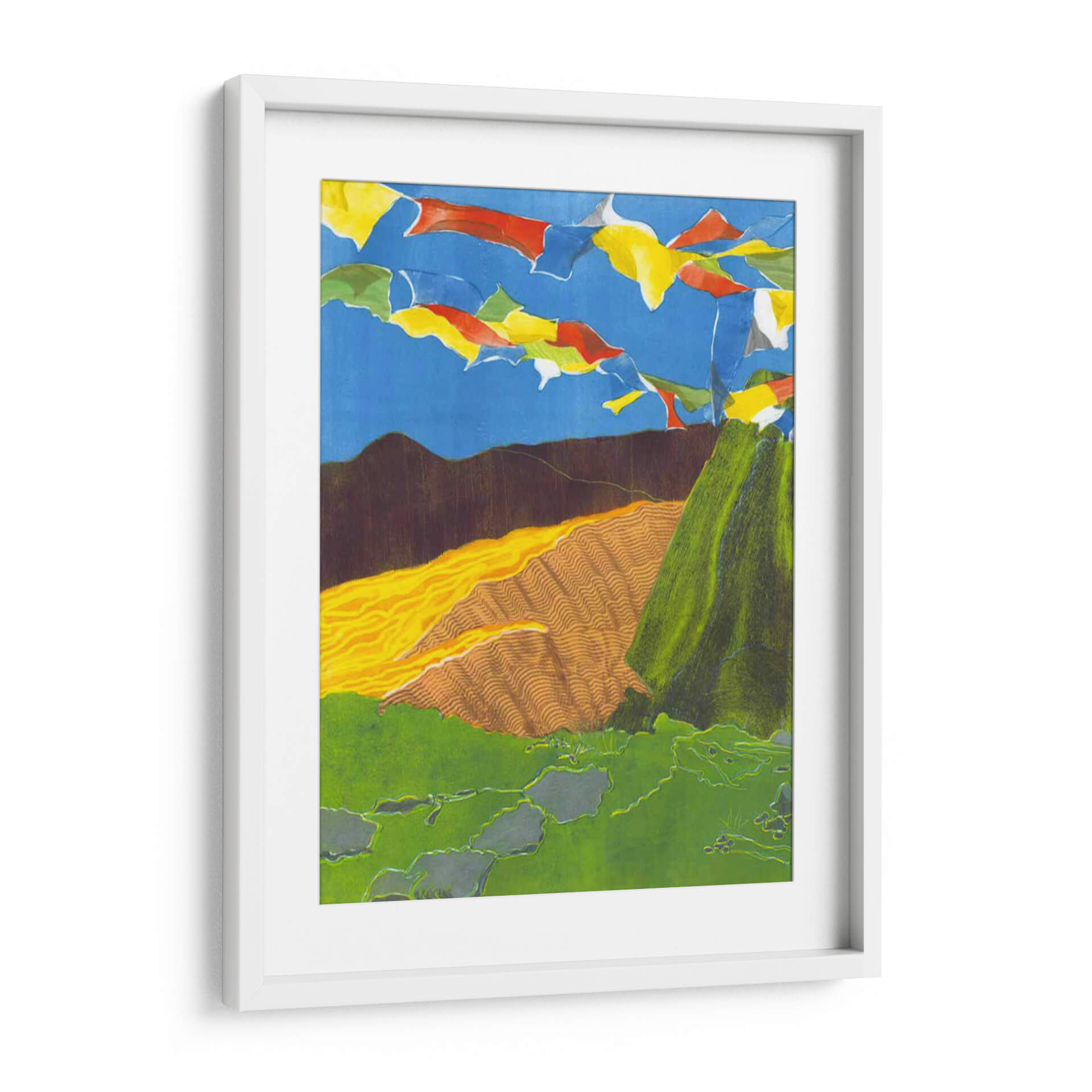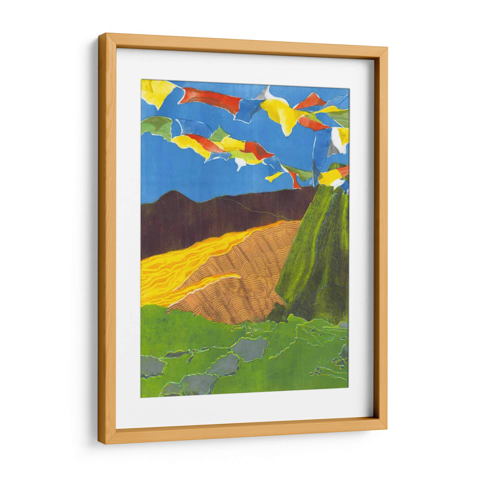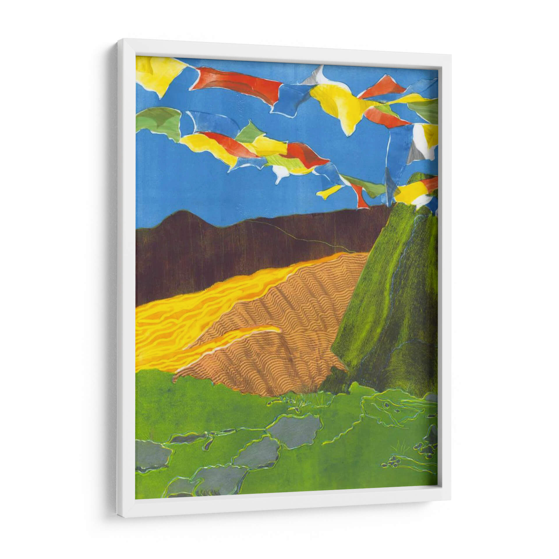 Sumérgete en la vibrante serenidad de 'Banderas De Oración I', una obra de arte cautivadora de Carolyn Roth que evoca la espiritualidad y la belleza de los paisajes montañosos. Esta pieza presenta una composición dinámica donde coloridas banderas de oración ondean contra un cielo azul intenso, creando una atmósfera de movimiento y esperanza. Las texturas ricas y las capas de color dan vida a las laderas verdes y a las colinas onduladas en tonos tierra y ocres, sugiriendo la profundidad y la vastedad de la naturaleza. La paleta de colores, aunque audaz, se equilibra con elementos terrosos, resultando en una armonía visual que invita a la contemplación. El estilo artístico, que combina elementos figurativos y abstractos con un toque de expresionismo, dota a la obra de una energía única. Ideal para quienes buscan infundir paz y un toque de inspiración exótica en sus hogares u oficinas, este cuadro decorativo es perfecto para salones, estudios o cualquier espacio que necesite un acento de color y significado.