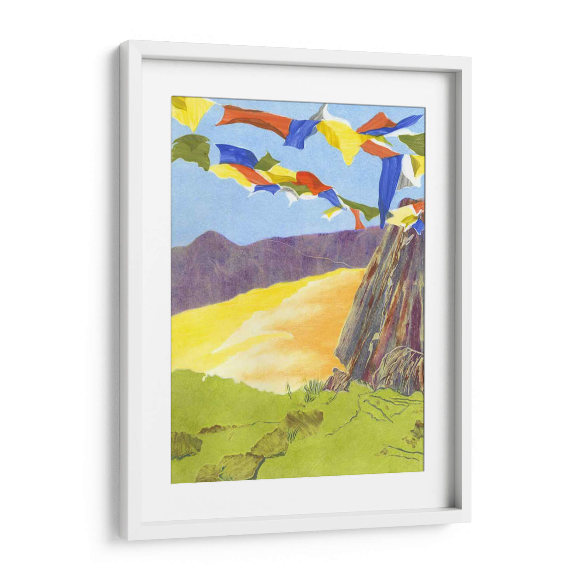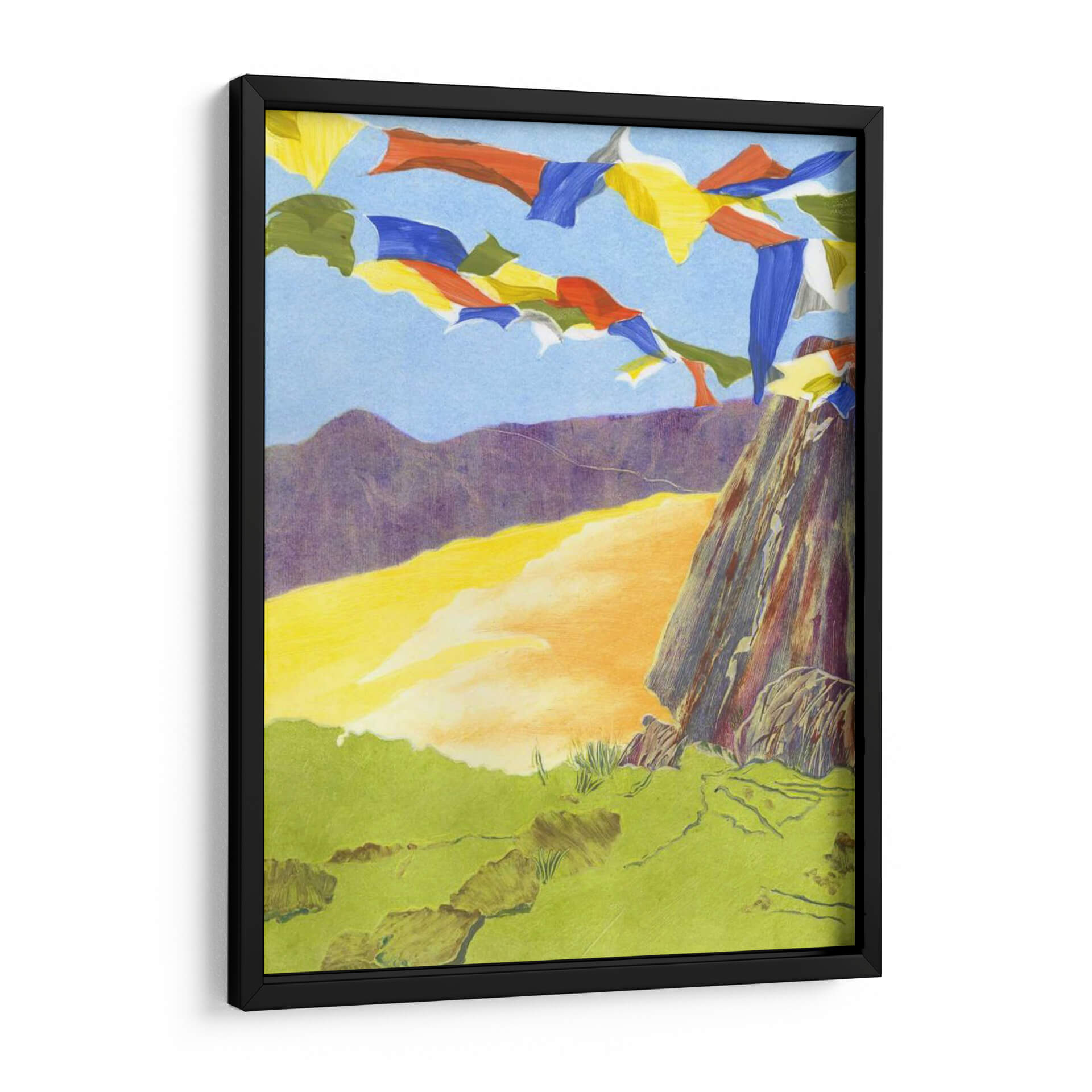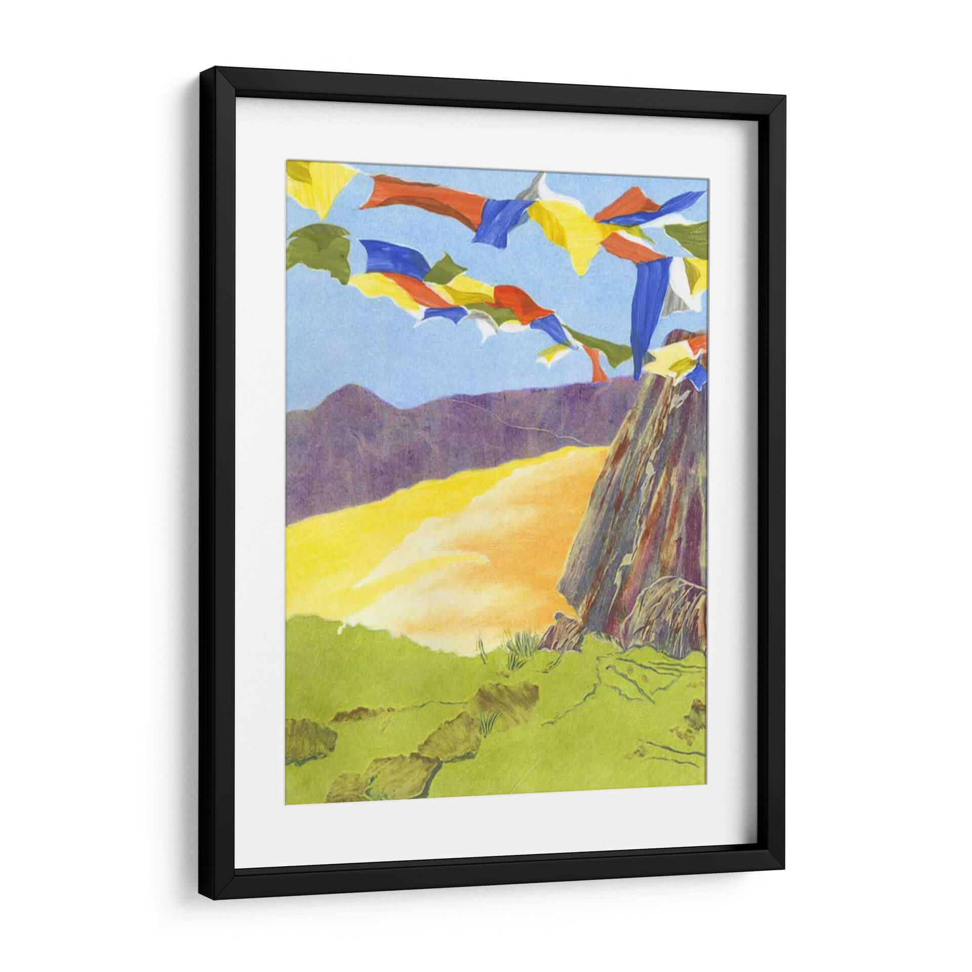 Embárcate en un viaje visual con "Banderas de Oración III", una obra de arte evocadora de Carolyn Roth que captura la esencia espiritual y la belleza etérea de las montañas. Esta pieza presenta una vibrante exhibición de banderas de oración ondeando al viento bajo un cielo azul claro, enmarcando un paisaje sereno de colinas verdes y púrpuras que se desvanecen en la distancia. La luz del atardecer ilumina la escena con tonos dorados y anaranjados, creando un ambiente de paz y contemplación. La composición detallada, desde la textura rocosa de la montaña hasta la delicada hierba que adorna el primer plano, invita a la reflexión y la conexión. Es ideal para añadir un toque de serenidad y color a cualquier sala de estar, dormitorio o espacio de meditación. Este cuadro decorativo no solo embellece tu hogar, sino que también inspira calma y espiritualidad, convirtiéndose en un punto focal único que resuena con la tranquilidad y la majestuosidad de la naturaleza. Perfecto para quienes buscan arte que eleve el espíritu y añada profundidad a su decoración.