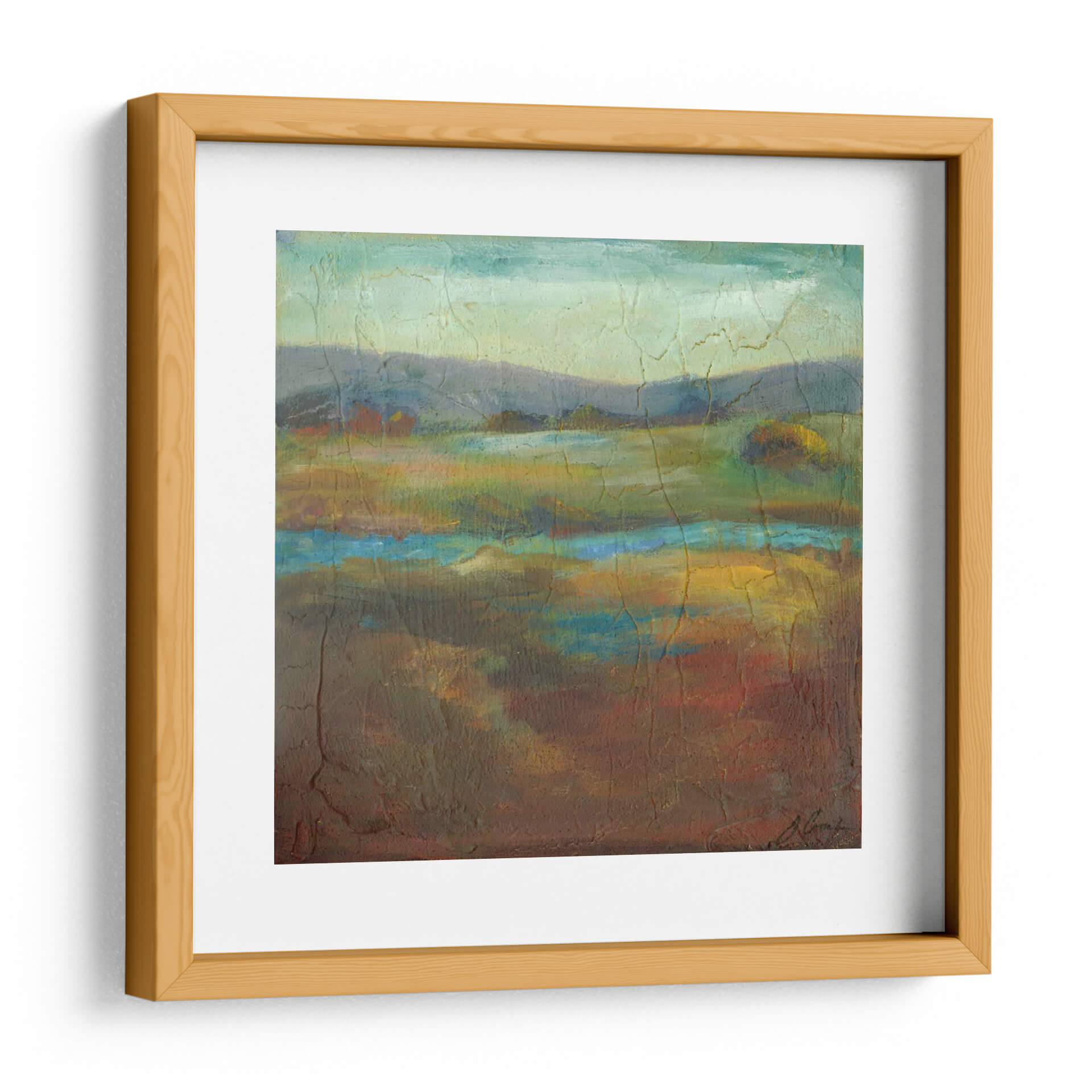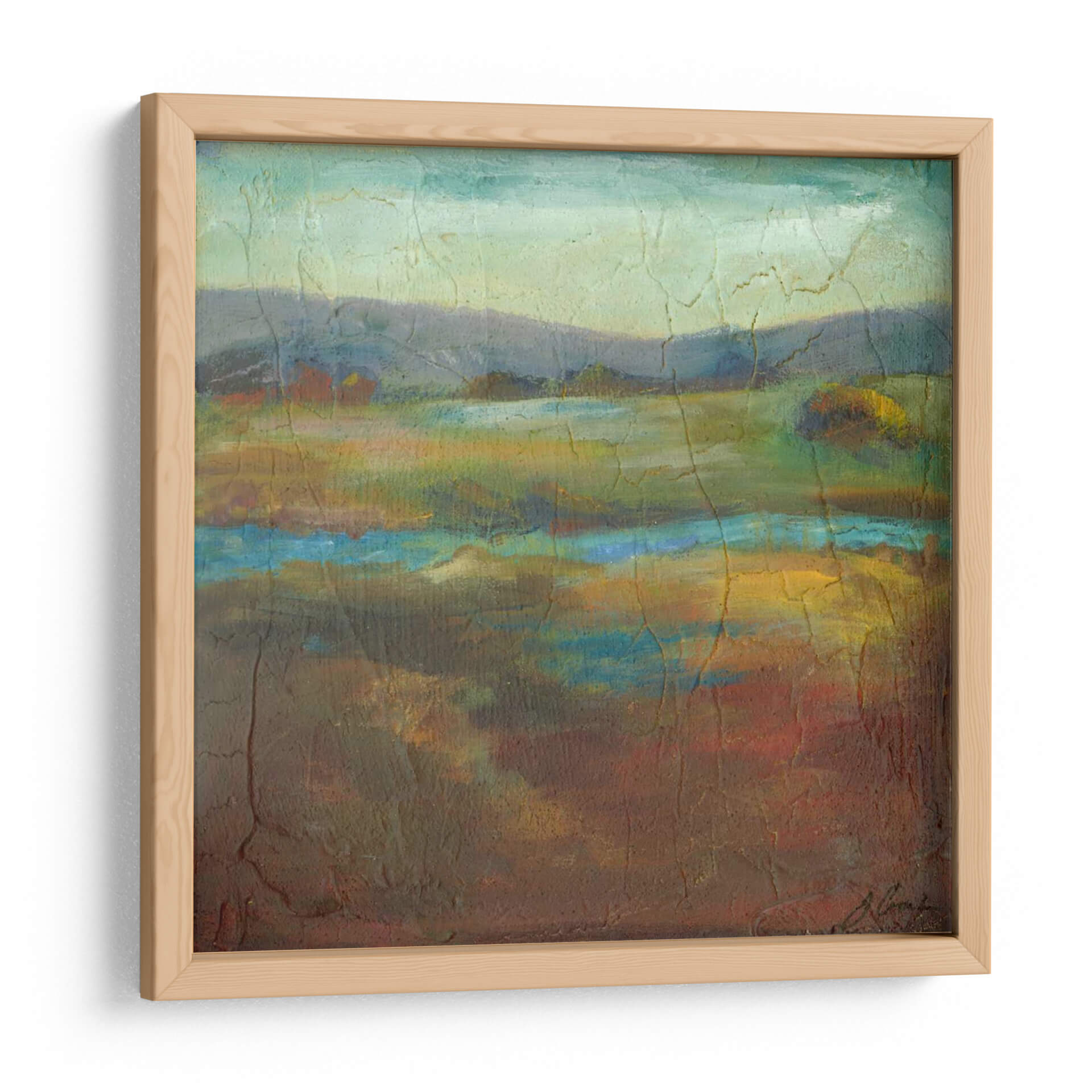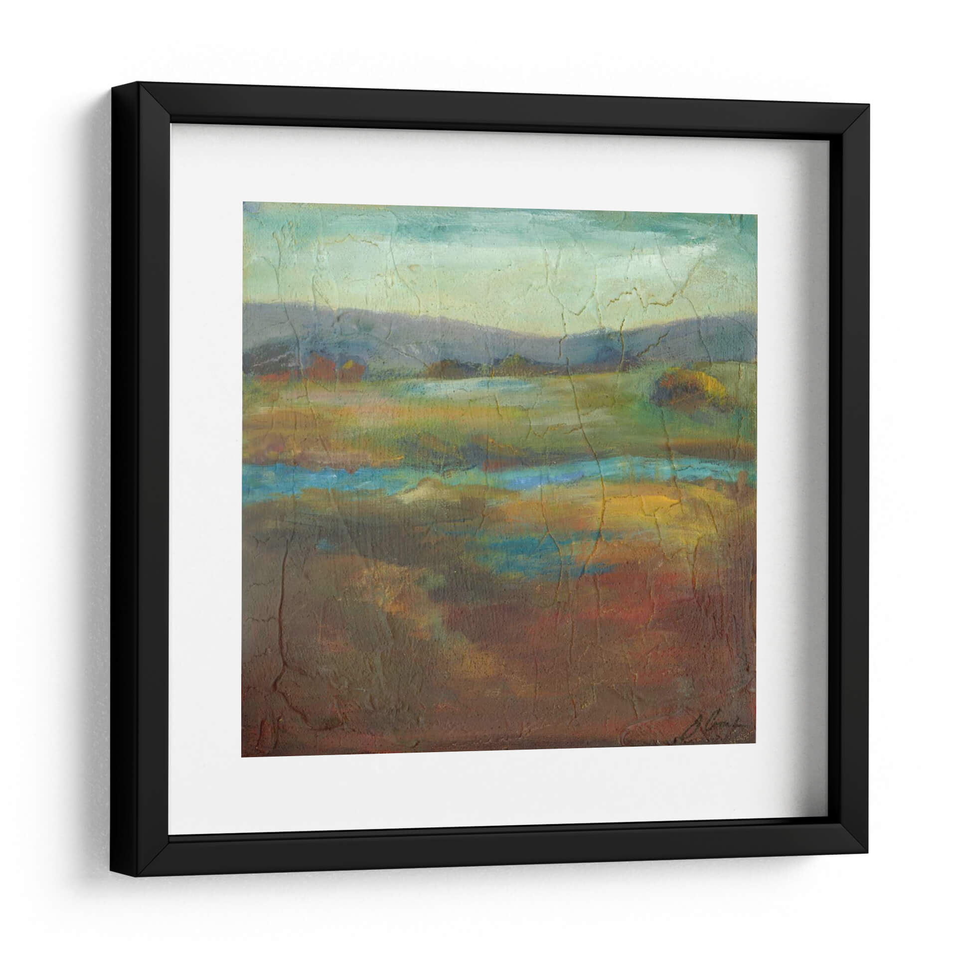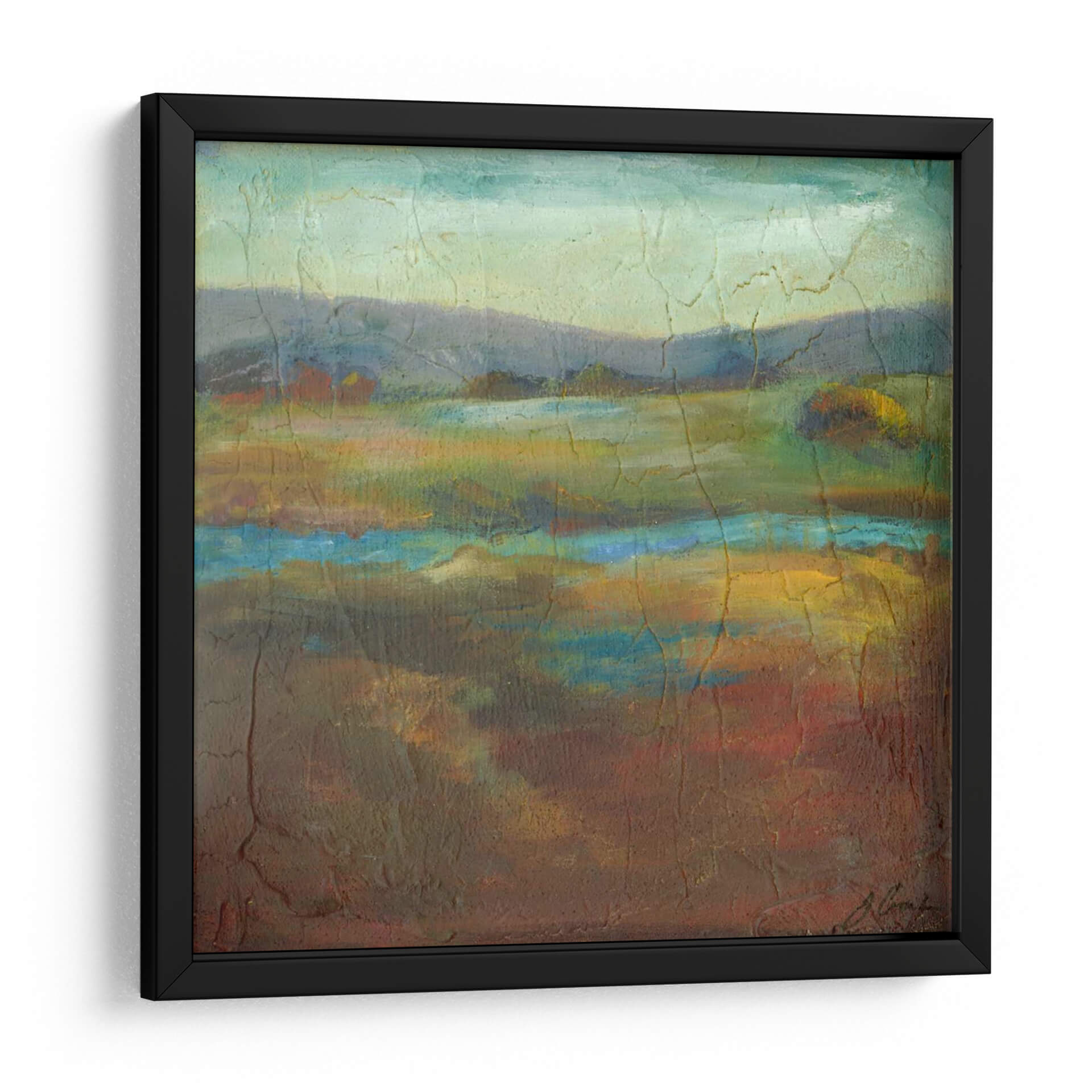 Sumérgete en la serena belleza de "Barons Creek Vista I", una obra de arte contemporáneo que captura la esencia de un paisaje etéreo con una paleta de colores rica y texturizada. Las suaves colinas se funden con un cielo brumoso en tonos pastel, mientras que un río o cuerpo de agua en el primer plano irradia vibrantes azules y amarillos, reflejando la luz de manera sutil. La técnica pictórica, marcada por grietas sutiles y una aplicación de pintura con cuerpo, añade profundidad y un carácter orgánico a la pieza. Los tonos tierra predominantes, salpicados de verdes intensos y detalles rojizos, crean una atmósfera acogedora y contemplativa, ideal para cualquier espacio que busque transmitir calma y conexión con la naturaleza. Este cuadro decorativo es perfecto para añadir un toque de sofisticación naturalista a tu sala de estar, dormitorio u oficina. Su composición equilibrada y su evocadora presencia invitan a la reflexión y a la admiración, convirtiéndolo en un punto focal que resuena con la tranquilidad del paisaje rural. Joyce Combs ha creado una pieza que no solo embellece, sino que también transporta al espectador a un lugar de paz interior. Descubre la magia de "Barons Creek Vista I" y transforma tu hogar en un santuario de estilo y serenidad, una elección perfecta para quienes aprecian el arte abstracto inspirado en la naturaleza.