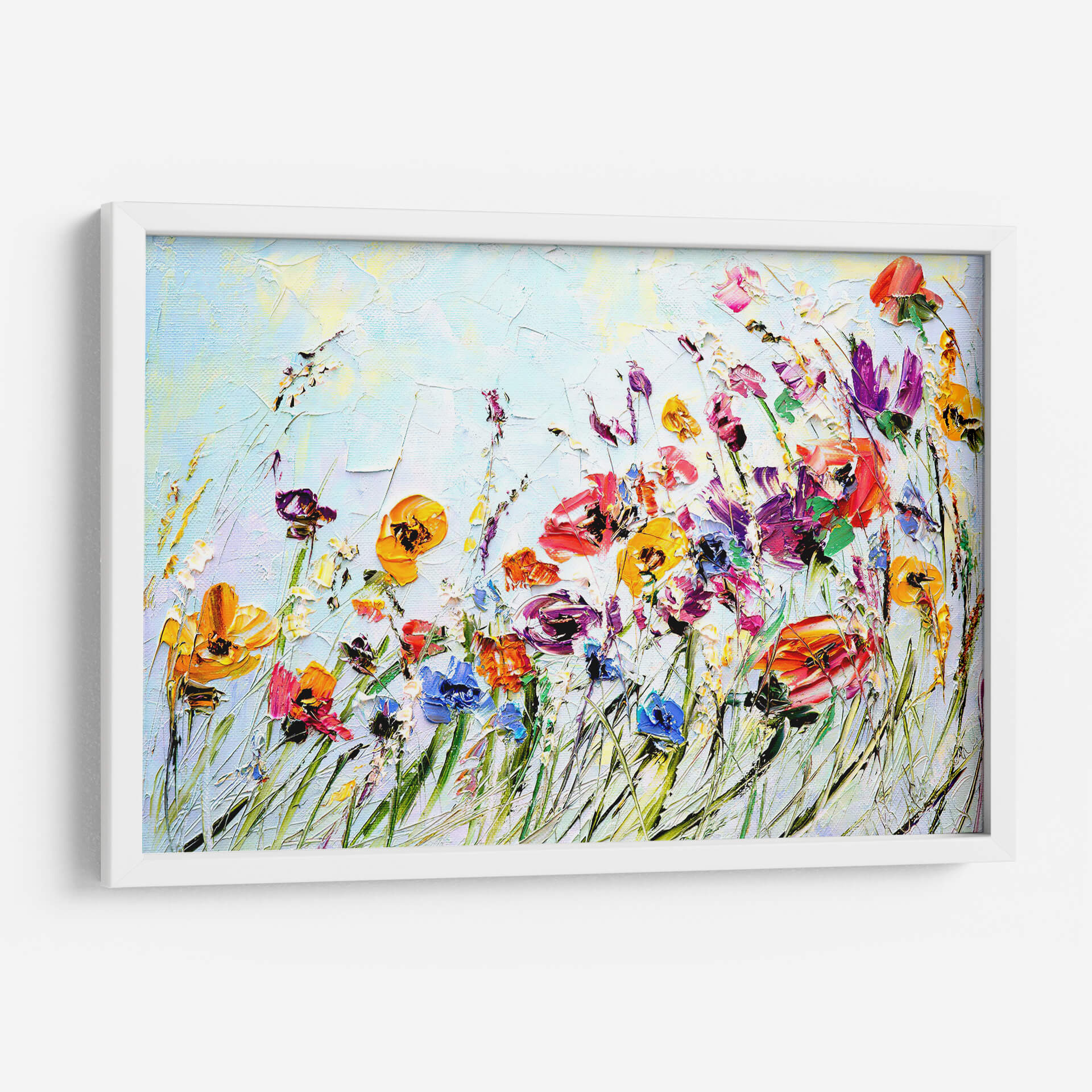 Sumérgete en la vibrante belleza de "Campo de Textura", una obra de arte que captura la esencia de un prado florido con una energía desbordante. Esta pieza, ejecutada con una técnica de impasto que confiere profundidad y relieve a cada pincelada, te transportará a un día soleado lleno de vida y color. La paleta cromática se despliega en un festín visual, con intensos rojos, naranjas, amarillos, púrpuras y azules que dialogan con un cielo de fondo en suaves tonos celestes y blancos. La composición, aunque centrada en la explosión floral, sugiere un movimiento orgánico y libre, evocando la brisa meciendo las flores silvestres. El estilo pictórico, que oscila entre lo impresionista y lo abstracto, permite que cada espectador encuentre su propia interpretación, sintiendo la alegría y la vitalidad que emana del lienzo. "Campo de Textura" es ideal para añadir un toque de optimismo y frescura a cualquier espacio, ya sea una sala de estar moderna, un dormitorio acogedor o una oficina que necesite un estallido de color y naturaleza. Transforma tu hogar en un oasis de serenidad y alegría con esta exquisita pieza decorativa.