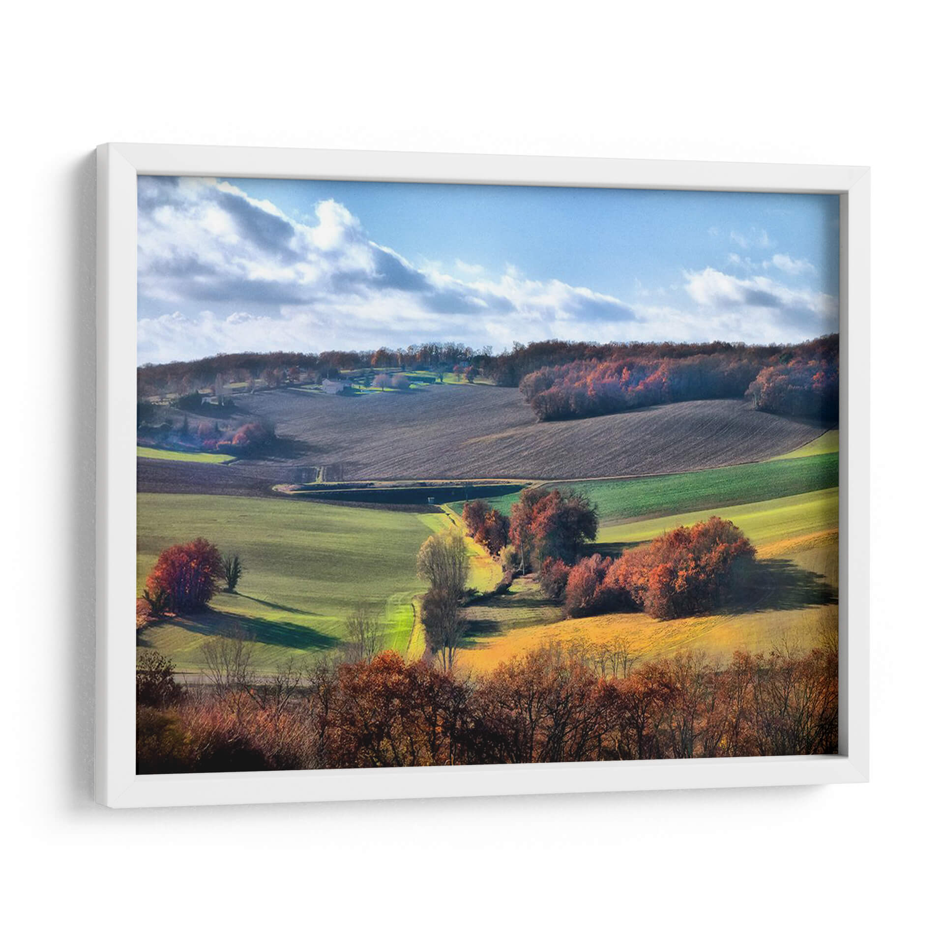 Sumérgete en la serenidad del campo con "Campo Pastoral Ix", una obra de arte que captura la esencia de un paisaje otoñal vibrante. Los verdes intensos de los campos recién cosechados se entrelazan con los ocres dorados del follaje otoñal, creando una paleta de colores rica y armoniosa. Las colinas ondulantes, salpicadas de árboles con sus hojas en tonos rojizos y anaranjados, se extienden hacia un cielo azul pálido adornado con nubes algodonosas que sugieren una brisa suave. La composición, con su perspectiva que se adentra en la distancia, invita a la contemplación y a la evasión, transportando al espectador a un remanso de paz y tranquilidad. Este cuadro decorativo es perfecto para añadir un toque de naturaleza y calidez a cualquier estancia, desde una sala de estar acogedora hasta un estudio o despacho que busque inspiración. Su atmósfera pacífica y su belleza terrenal lo convierten en una pieza ideal para quienes aprecian el arte paisajístico y buscan un elemento decorativo que inspire calma y conexión con el entorno natural. "Campo Pastoral Ix" es más que una imagen; es una invitación a respirar el aire fresco y a disfrutar de la belleza efímera de la estación.