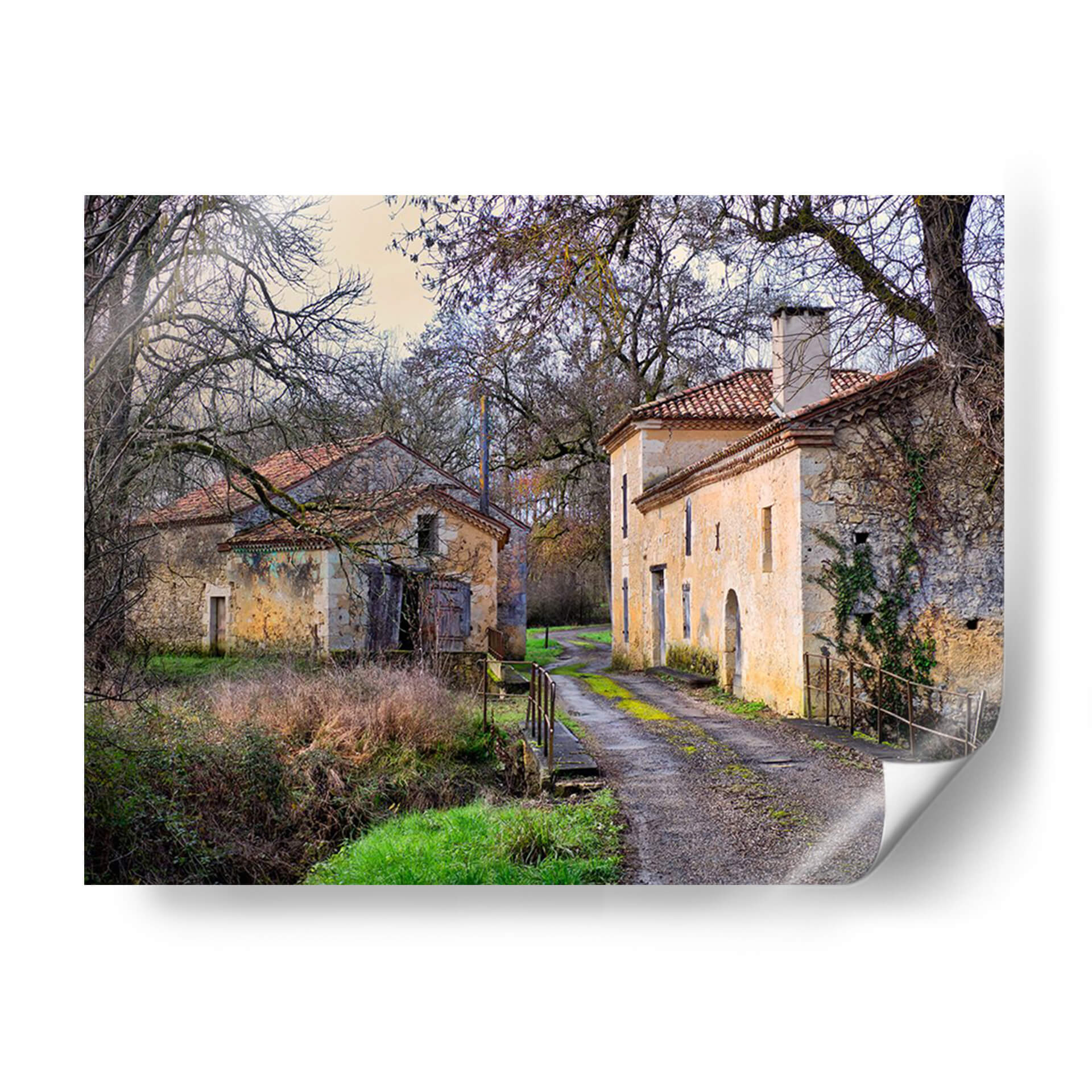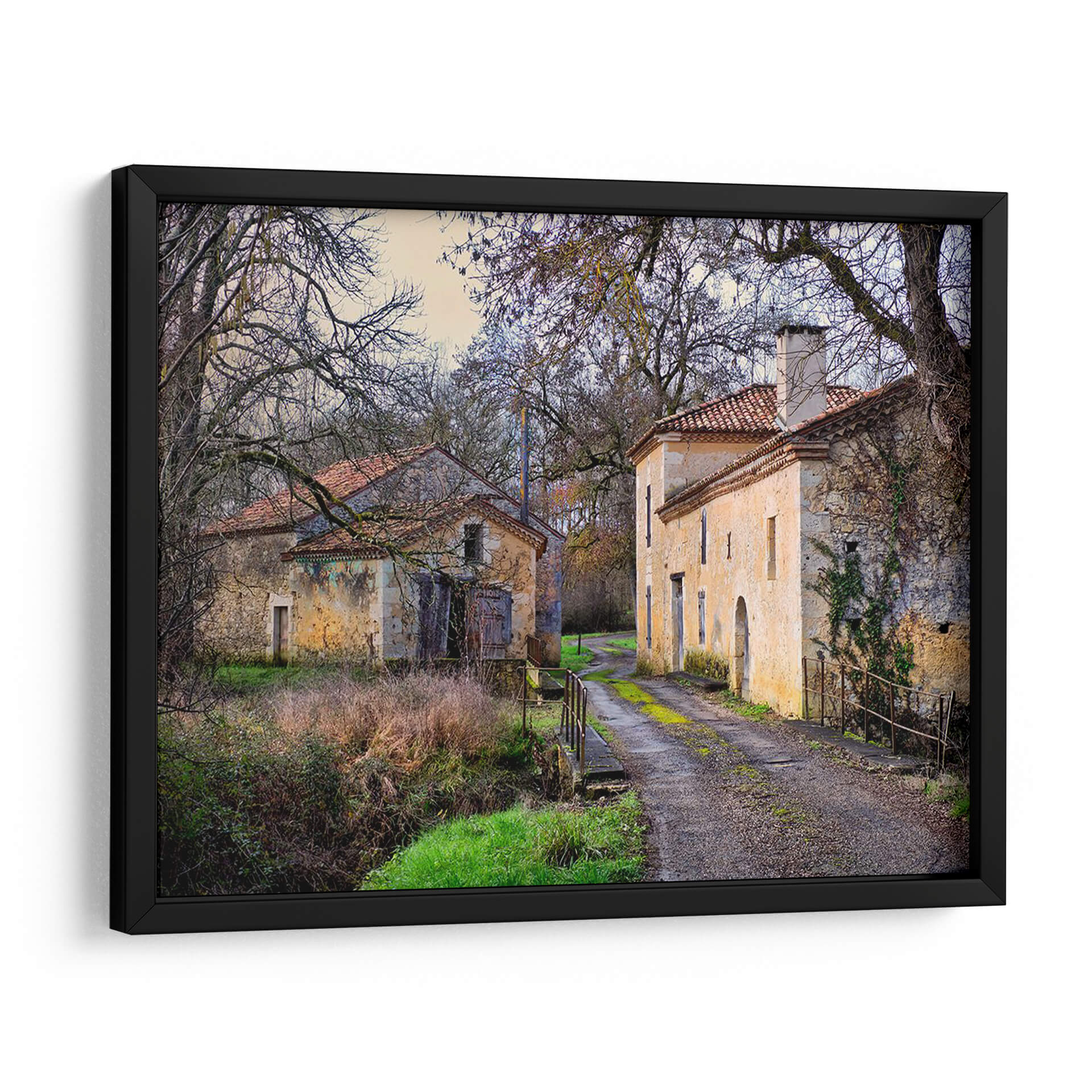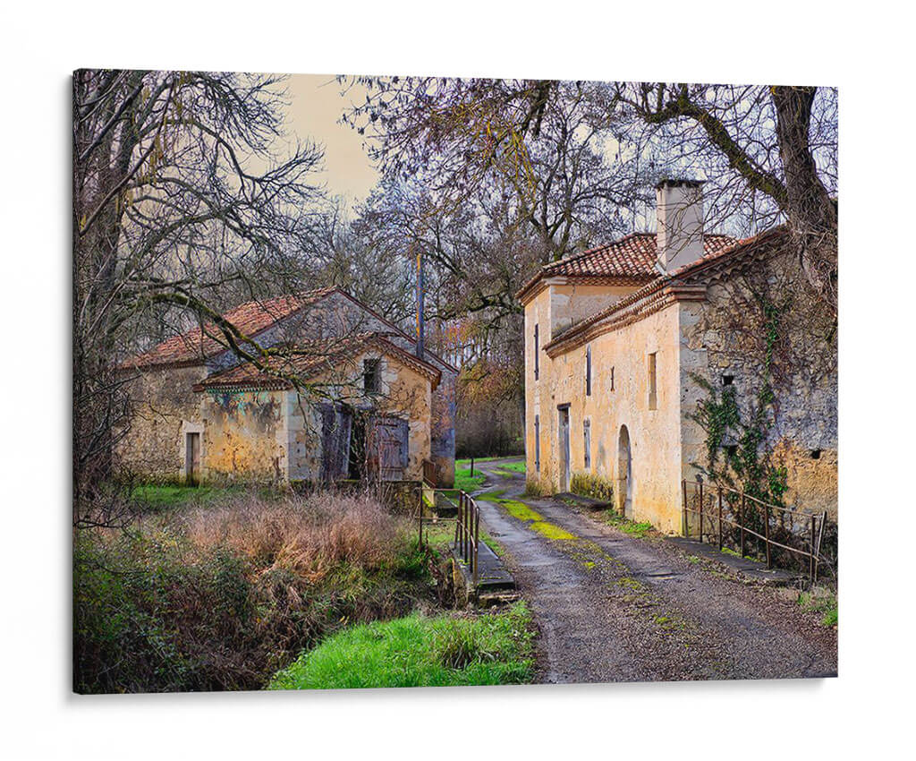 Adéntrate en la serena belleza de "Campo Pastoral XII", una cautivadora obra de Colby Chester que te transporta a un rincón idílico y atemporal. Esta pieza captura la esencia de un paisaje rural francés, con dos edificaciones de piedra rústica y tejados de teja roja, flanqueando un camino de grava que se adentra en la distancia. Los árboles desnudos, con sus ramas entrelazadas como un delicado encaje contra el cielo crepuscular, añaden una atmósfera melancólica y a la vez protectora. La paleta de colores, dominada por tonos tierra, ocres, verdes musgo y toques de azul pálido en el cielo, evoca una sensación de calma y nostalgia. Cada detalle, desde la textura de las paredes desgastadas hasta la vegetación que trepa por una de ellas, invita a la contemplación y al descanso. "Campo Pastoral XII" es más que un cuadro decorativo; es una ventana a un mundo de tranquilidad, ideal para infundir paz en tu sala de estar, un refugio de serenidad en tu estudio o un toque de encanto rústico en tu dormitorio. Deja que esta evocadora imagen sea el punto focal que transforme tu espacio en un santuario de serenidad y belleza natural.